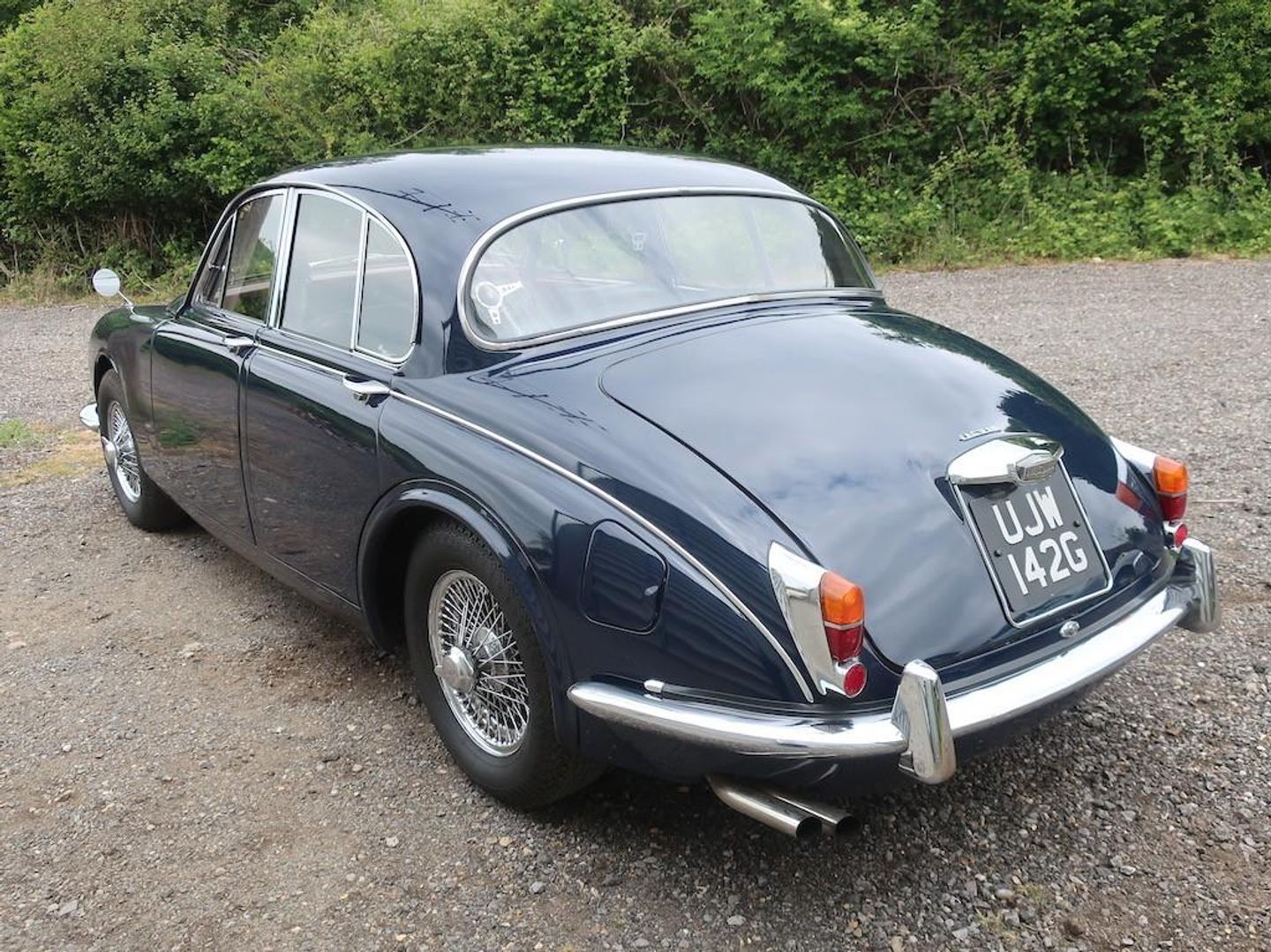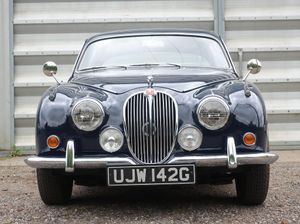 Registered 23rd August 1968 this manual with overdrive 3.4 litre Jaguar has a large history file that shows much maintenance over the years, that includes rebuild of the cylinder head in 2003 and bodywork repairs and repaint in 2016. The file also contains general service and repair bills as far back as 1994. Fitted with power steering and Coopercraft front brakes the car sits on the chrome wire wheels and has 'Coombs' type rear wheel arches. The general condition of the car remains good with the interior wood work and trim in good order, both carpets and seat leather in fine order while the exterior body work is generally sound and corrosion free but showing some signs of age. Mechanically the car is strong, good oil pressure with no signs of smoke from the engine on cold start. The working power steering and functioning overdrive a real bonus, while the manual gearbox is also in good working order. This is not a mint example but a much loved and well cared for classic, useable and reliable. Showing just over 7,000 miles it has old MoT certificates that go back to 2007 when the milage was showing 4,214 miles. It is supplied with its original tool kit, and extra jack, car cover and a new Mot ( no advisories ) until 17.06.2026.