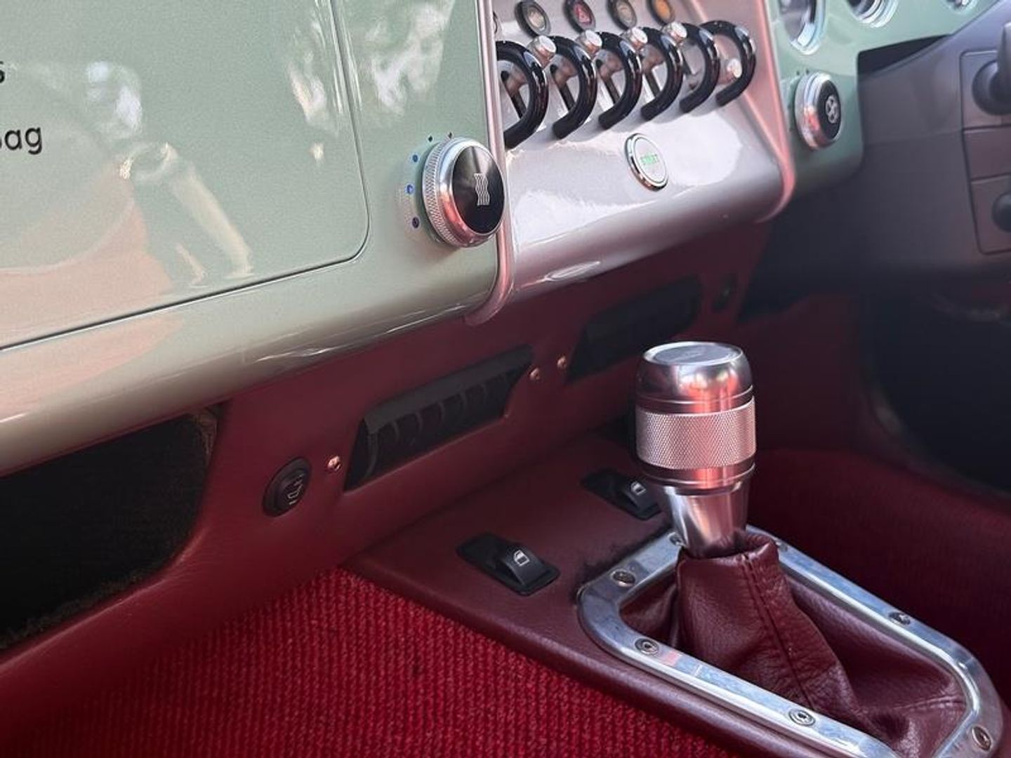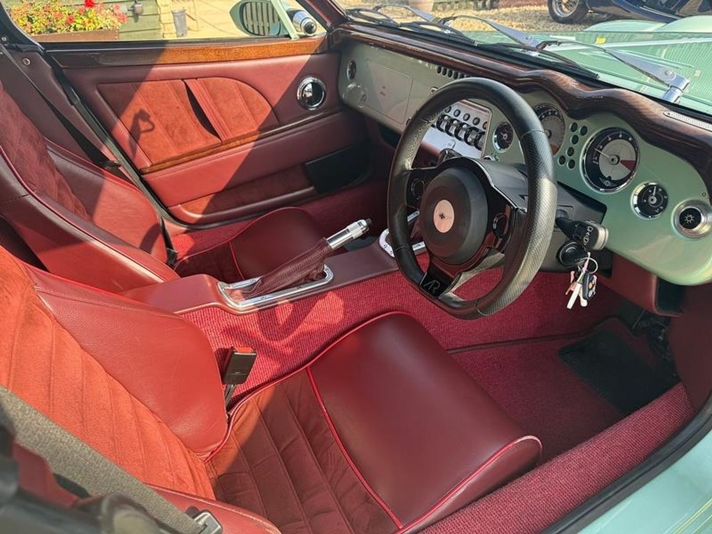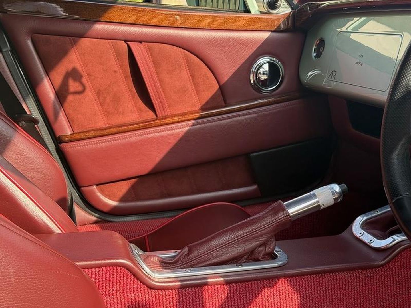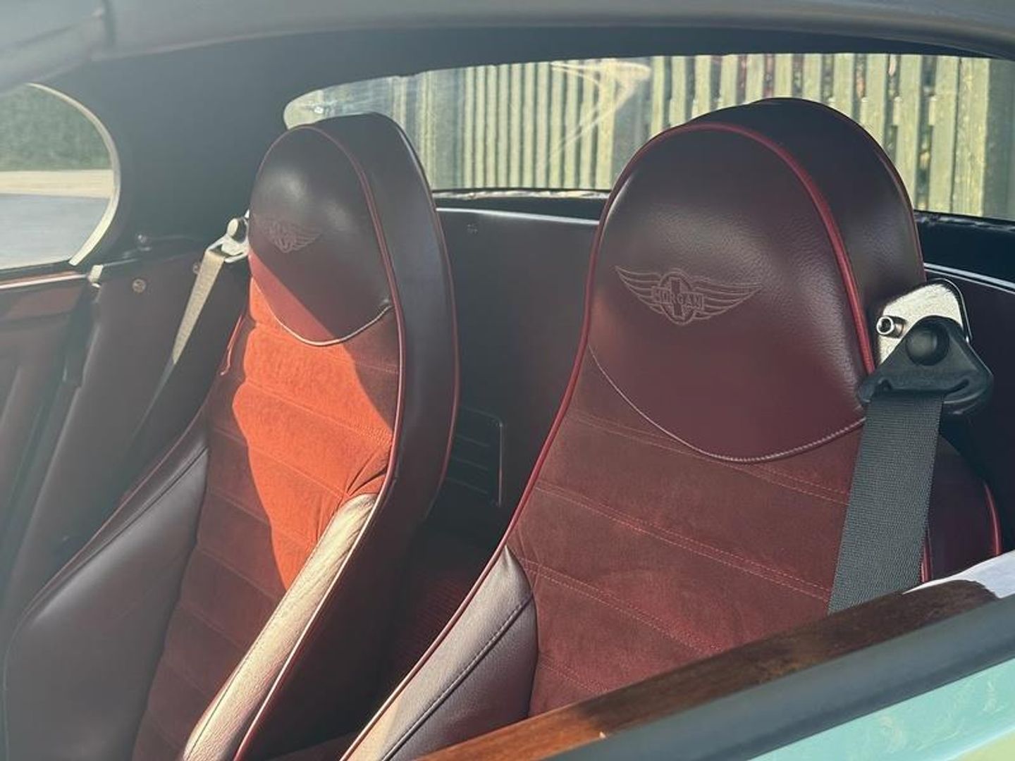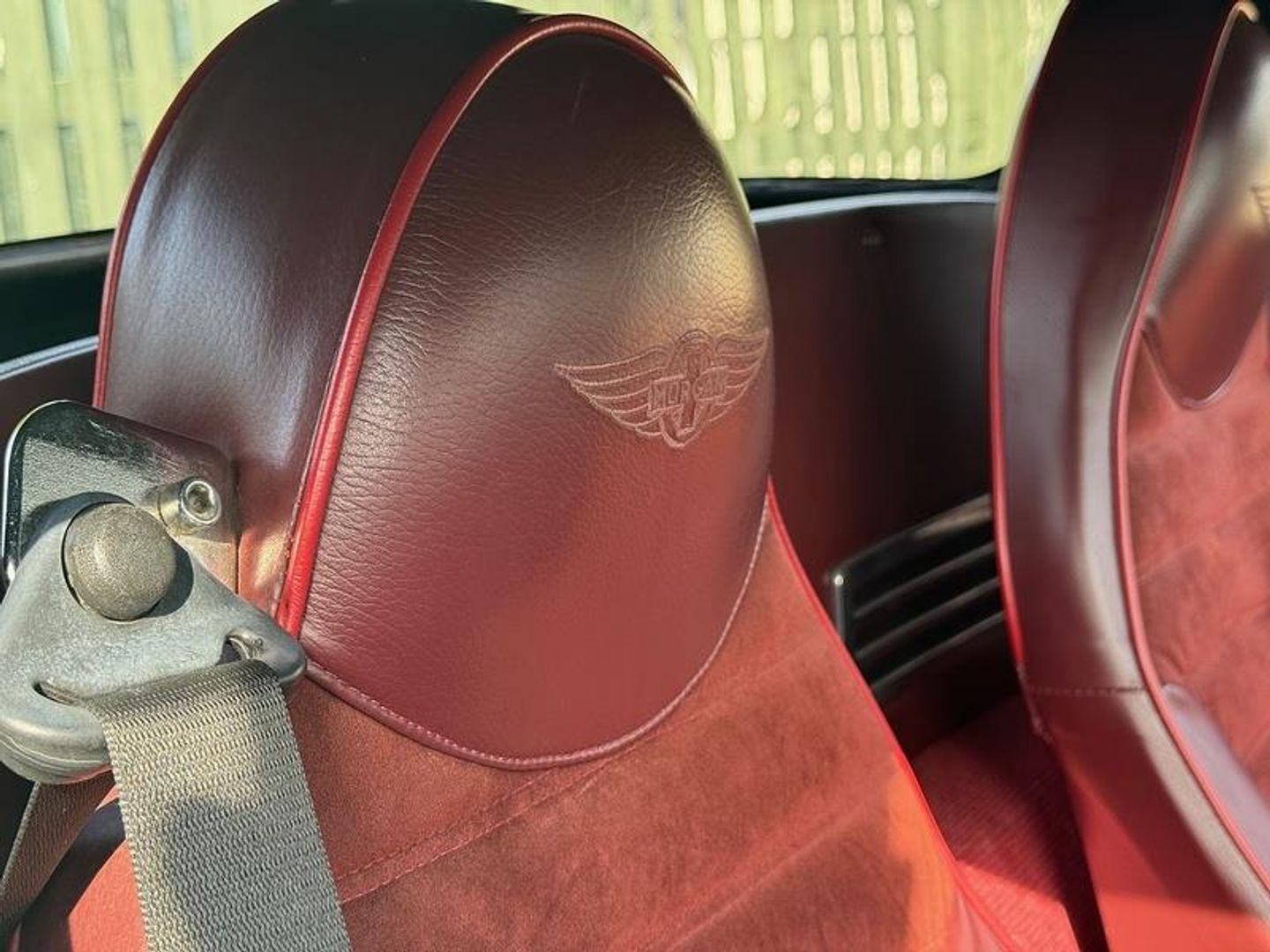• Burgundy leather + suede seat inserts. Red seat piping