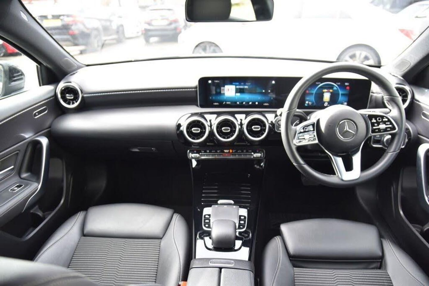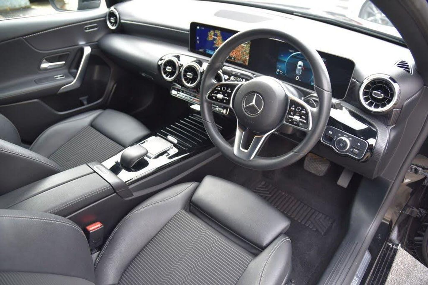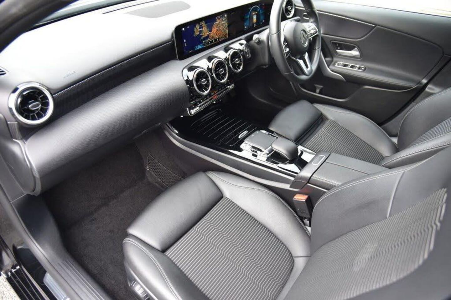 10.25" media display, 180 degree rear view camera with parking guidelines, 7" colour screen in instrument panel, Active lane keep assist, Active park assist with parktronic system including front and rear parking sensors, Attention assist, Brake pad wear indicator warning light, Car wash mode, Cruise control + speed limiter, Direct steering, Dual bluetooth interfaces, DYNAMIC SELECT with a choice of driving modes (ECO, Comfort, Sport and Individual), ECO start/stop function, Fluid level warning indicator for fuel, oil, coolant and washer fluid, Hard-disk navigation, Hey Mercedes Voice activation, Lamp failure indicator, MBUX multimedia system with DAB digital radio and touchpad including satellite navigation, Mercedes me connect including emergency call system, accident recovery, breakdown management and maintenance, Outside temperature gauge, Owners manual in English, Pre-installation for car sharing, Pre-installation for Vehicle Monitoring, Pre-installation for Vehicle Setup, Preinstallation for Mercedes Benz link, Service indicator (ASSYST), Smartphone integration with Apple CarPlay and Android auto, Speed sensitive power steering, Trip computer, Wireless charging, 3 rear 3 point seatbelts, ABS with Brake Assist, Active bonnet, Active brake assist includes forward collision warning system with autonomous braking, Adaptive brake assist with hold function and hill start assist, Black seatbelts, Childproof locks manually operated for rear doors and electrically operated for rear power windows, Crash responsive emergency lighting, Driver and passenger head and side airbags, Drivers knee airbag, Dual stage Driver/Passenger Airbags, Electronic parking brake, ESP curve dynamic assist, ESP with ASR, Front and rear seatbelt reminder, Tyre pressure monitoring system, Warning triangle and first aid kit, Window airbags, Alarm system/interior protection/immobiliser, Keyless Go, Remote central locking and crash sensor with emergency opening function, Urban guard vehicle protection system with immobiliser and interior protection, 2 USB ports (type C) in rear stowage compartment and one in front of center console, 6 speakers, DAB Digital radio, Mercedes-Benz sound system - 100W, 3 Spoke leather multi function steering wheel, 40:20:40 split folding rear seats, Artico man-made leather/Fleron fabric upholstery, Auto Mercedes-Benz child seat recognition sensor, Black air vents with surround in silver chrome, Black roof lining, Controller on centre console with chrome surround, Front centre armrest with storage compartment, Front comfort seats with adjustable head restraints, Front door sills with Mercedes benz lettering, Front seat backs luggage nets, Front seat cushion length adjustment, Gearshift paddles on steering wheel, Heated front seats, Height/reach adjustable steering column, Interior mirror with reading lamps in black and frameless, ISOFIX and top tether child seat fixing points in two outer rear seats, Manual height adjustable front seats, Rear head restraints, Seat occupancy sensor for front passenger seat, Stowage compartment in centre console with retractable cover, Sunvisors with illuminated vanity mirrors, Touchpad on center console, Twin front cupholders, Two zone thermotronic luxury automatic climate control, Velour floor mats, 4 Electric Front and Rear windows, Adaptive brake lights, Black weather strip, Body coloured bumpers, Body coloured door handles, Body coloured side skirt, Body coloured door mirrors, Chrome beltline, Diamond radiator grille with black pins with one louvre in silver + chrome insert, Electric adjustable and heated door mirrors with integrated LED side indicators, Exhaust system - Twin visible tailpipes in polished stainless steel, Headlamp assist automatic headlamp activation, Heated glass rear windscreen + timer control, LED high performance headlamps with integrated LED daytime running lights, LED tail lamp, LED third brake light, Radio aerial, Rain sensing windscreen wipers with two sensitivity settings, Rear fog lights, Rear wiper, Window line trim strip in chrome, Dark carbon fibre interior trim, 17" 5 twin spoke light alloy wheels painted in matt black with a high sheen finish, Summer tyres, Tirefit sealant kit, Light and sight pack - A Class, Mirror package - A Class, Seat comfort pack - A Class, Lowered comfort suspension, Rear axle torsion beam
