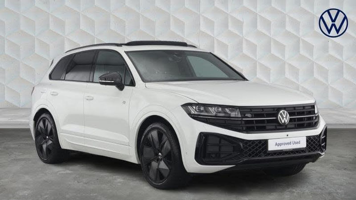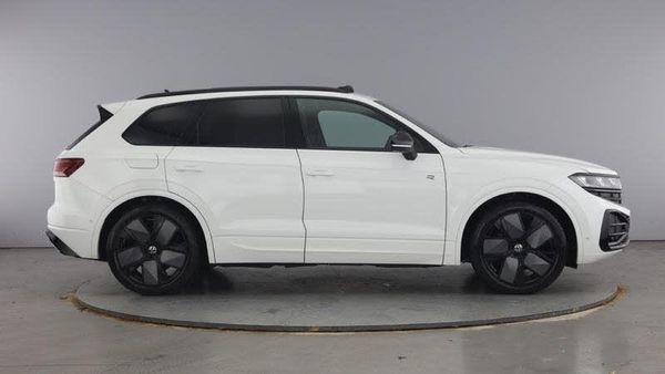 Solid - Pure white, Heat insulating darkened glass in side and rear windows, Rear wiper, Adaptive chassis control, Electric front tilt/slide panoramic sunroof and fixed rear sunroof, External USB type C socket and charging sockets, Gloss black roof rails, Rear side wing doors, Stainless steel door sill protection, Automatic coming/leaving home lighting function, Automatic headlights, Dynamic headlight range control with dynamic cornering light, HD LED Matrix beam plus digital headlight projection with variable light distribution, Headlight washers, Highway light, LED 3rd brake light, LED daytime running lights, LED rear combination lamp with variable lighting functions and special styling, Rear fog light with back up light on both sides, Rear light bar and illuminated logo, ABS, Generative braking with start and stop system, Driver profile selection, Intelligent park assist, PAS, Black door mirrors, Electrically power adjustable, heated, folding, auto dimming, front passenger exterior door mirror lowering function, 3 point seatbelts, outer rear with ECE lable, Child locks on rear doors, Curtain airbags, Driver and front passenger safety-optimised head restraints, Driver/Front Passenger airbags, Front seat side impact airbags, Height adjustable 3 point front seatbelts with pre tensioners, Passenger airbag deactivate switch, Three 3 point rear seatbelts, Two tone horn, Warning triangle and first aid kit, Front + rear carpet mats, 4 zone climate control, 12V socket in centre console, Airbag label on sun visor and B-pillar, Leather wrapped multifunction sports steering wheel, heated, with touch control and shift paddles, Double sun visors with illuminated vanity mirrors, Mobile phone interface with inductive charging, Diversity antenna for AM/ FM reception, eCall emergency system, 15 Screen Top infotainment system Premium (MIB3), Innovision cockpit, Multi-colour Active Info display, Warning signal and warning light for front and rear seatbelts not fastened, Aluminium decorative inserts, Gloss black decorative inserts in centre console, 3 rear headrests, 3 seat bench in 2nd row, Mechanical rear seat release, Power adjustable lumbar support in front, Power seats in front, right side with memory features and seat cushion depth adjustment, Rear seat backrest and split folding with center armrest, Single front passenger seat, Extra acoustics pack - Touareg, Memory pack plus - Touareg, Alarm system with interior protection, Easy open and close sensor controlled luggage compartment opening and closing with remote unlocking, Keyless Access Keyless locking and starting system with SAFELOCK, [Audio and Communications]E-Sim card for online connectivity, Wireless app connect, DAB Digital radio, We Connect and We Connect Plus functionality, [Drivers Assistance]Adaptive cruise control, Advanced driver attention and drowsiness monitor, Dynamic road sign display, Park Assist - Sensor controlled steering aid to assist parallel or bay parking, Tyre pressure loss indicator, [Exterior]Heated windscreen washer jets, Black style comfort bumpers, Rear exhaust tailpipe, Black decorative trims, [Interior]Poor weather light, Brushed stainless steel pedals, Front centre armrest, Tool kit, [Performance]Air suspension, [Safety and Security]Front assist, Extended pedestrian protection measures