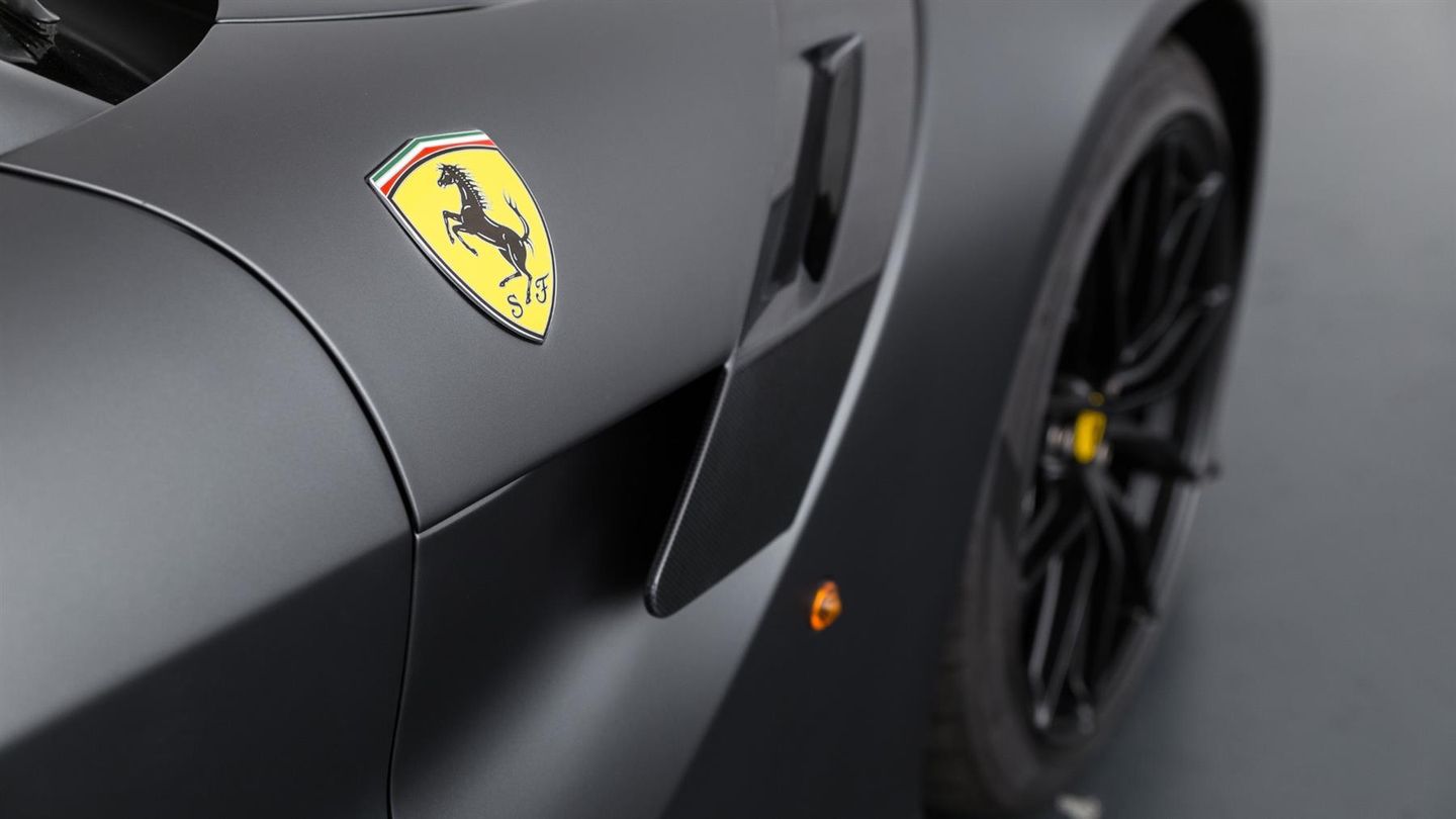 This F12 tdf was produced in 2016 in the Extra Range colour Grigio Stilverstone Opaco in combination with my black horizontal stripes on the bonnet. The first owner from Berlin received the vehicle for the first time at the handover from Ferrari Berlin on 30 June 2016. Even before the first delivery, the vehicle was registered to the owner's company and inspected by Ferrari, which led to a ‘Yellow Book’, the certificate for special vehicles. The tdf remained with the Berlin-based collection and received its first service at Ferrari Berlin in February 2018, even though it was not driven by the collector. In summer 2018, the car came into our hands for the first time and was sold a short time later to its second owner, a public limited company from Switzerland, even before it was publicly advertised for sale.