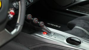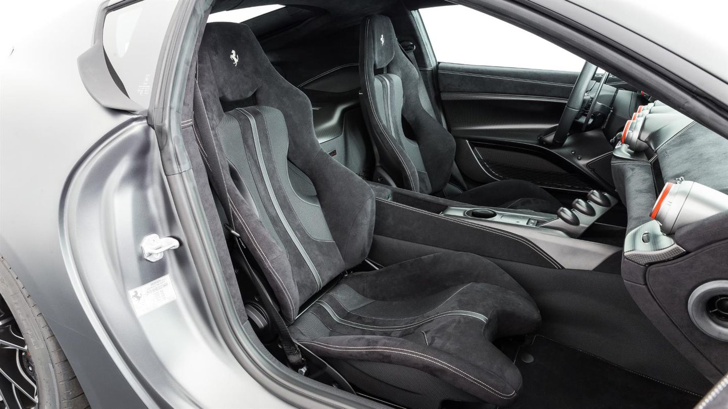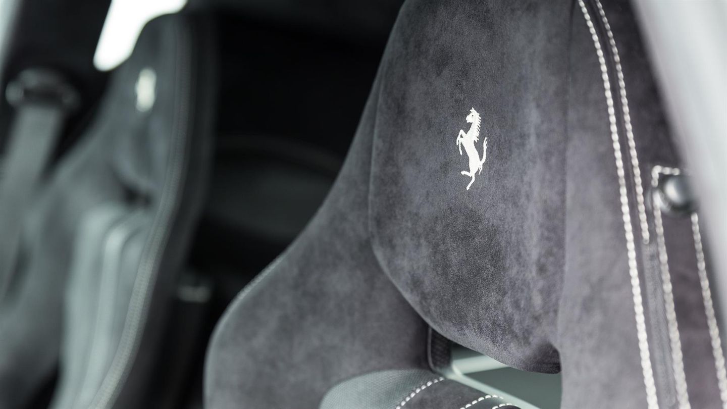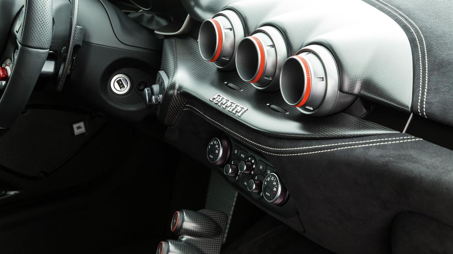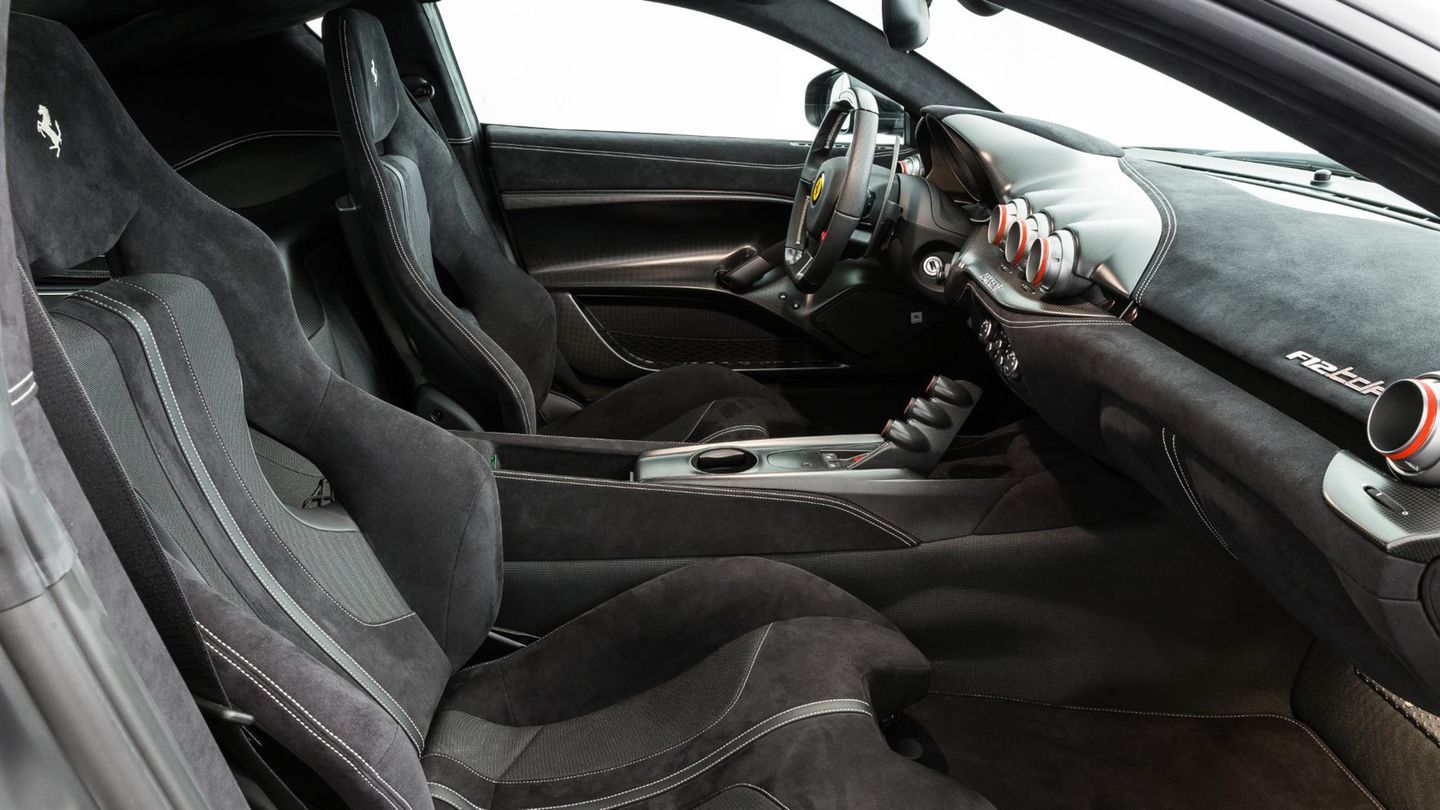 The interior has a race-orientated ambience. Lightweight sports bucket seats, generous use of Alcantara, carbon and aluminium as well as the extensive omission of unnecessary comfort elements underline the uncompromising character of the vehicle. Nevertheless, the F12 tdf remains suitable enough for everyday use to be driven on long journeys. The vehicle is a symbiosis of classic V12 Ferrari character, state-of-the-art racing technology and limited exclusivity. It combines the elegance and broad usability of a Gran Turismo with the uncompromising performance of a racing car, making it a vehicle that will thrill collectors and driving enthusiasts alike.