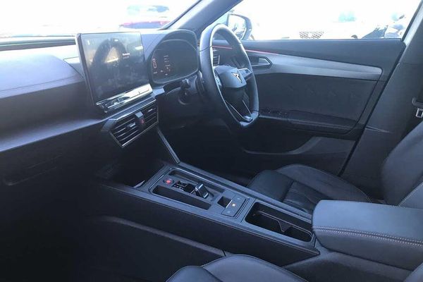 Exterior Features, Metallic paint, Paint - Metallic, Metallic - Nevada white, Exterior Features, Electric front/rear windows, Rain sensing wipers, Rear wash/wipe, Tinted rear windows, Standard suspension, Body colour door handles, Body coloured bumpers, Gloss black roof rails and window surrounds, Rear diffuser with black simulated exhaust pipes, Rear side wing doors, Daytime running light with automatic headlight control and coming home feature, Dynamic headlight range control, Front fog lamps with cornering function, LED Headlights, LED Taillights with dynamic indicator, Third brake light, Welcome lights, Safety, ABS, Brake control system - ESC and brake booster, Electronic parking brake, Front and rear disc brakes, Hill hold control, Driver alert system, Driving profile selection, Forward collision warning with automatic braking, Lane assist, Park assist (inc front/rear parking sensors), PAS, Predictive adaptive cruise control with speed limiter, Rear view camera, Auto dimming rear view mirror, Dark grey wing mirror, Electrically adjustable heated and folding door mirrors with memory function, 3 point seatbelts on all rear seats, Child proof door locks, Driver and front passenger airbags with front passenger airbag de-activation, Front side curtain airbags, Public e-call, Seat belt reminder for front and rear seats, Tyre pressure monitoring system, Audio / Communications, Voice control system, Wired Android Auto, Wireless apple carplay, 2 front and 2 rear USB type C sockets, DAB radio, Driver Convenience, Start/stop system with regenerative braking, Wireless phone charger, Miscellaneous, Digital cockpit and configurable dashboard, Navigation system with 12'' Touchscreen Display, RPM, trip computer, outside temp gauge, instrument light brightness, low fuel warning light, lights on reminder, gearshift indicator, Service interval indicator, Trim, Copper and aluminium interior detailing, 3 seat bench in 2nd row, 60/40 split rear bench seat with armrest and mechanical seat release, Front and rear head restraints, Isofix, Single front passenger seat, Interior Features, Dust/pollen filter, Three zone climate control with control panel in rear, 12V socket, Black headlining, Front centre armrest, Height/reach adjust steering wheel, Illuminated interior front door sills, Leather multi function heated steering wheel with gear shift paddles, 2 front and 2 rear reading lights, Wraparound lighting, Electronic locking differential and dynamic traction support, Illuminated sunvisor with mirror, Packs, Genuine Nappa leather Pack - Cupra, Security, Anti theft alarm system, Keyless entry and start system (KESSY), Locking wheel bolts, Vehicle Charging, 10 amp mode 2 charging cable, 16 amp mode 3 charging cable, 3.6 kw On-board charger, Wheels, 19" 'Exclusive' machined sport matte black and silver alloy wheels, Tyre repair kit
