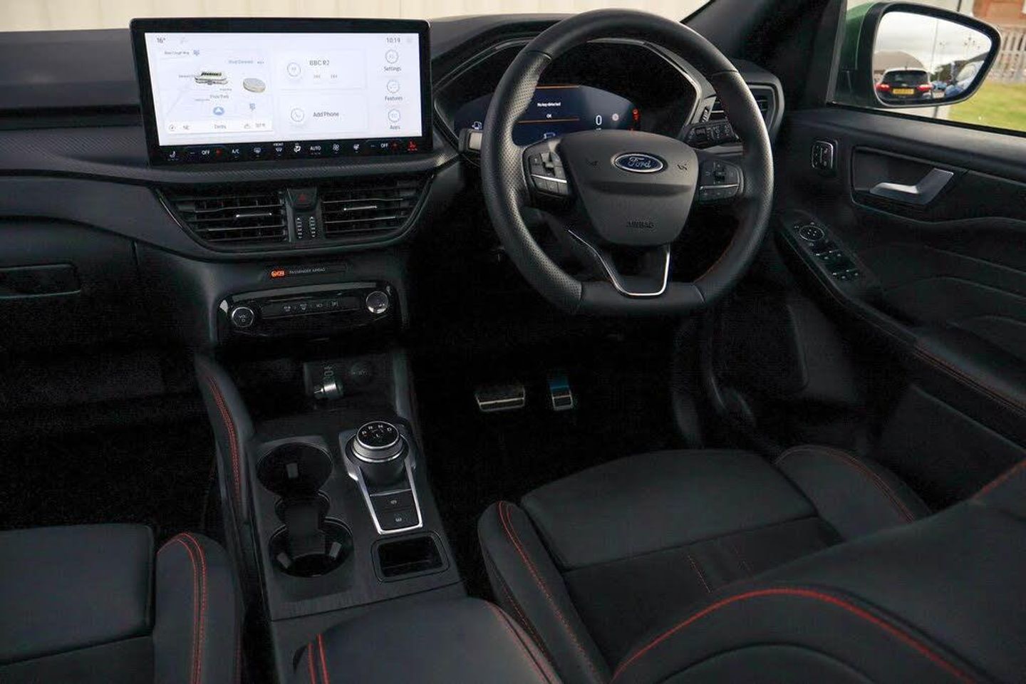 12.3" digital colour instrument cluster, 360 degree camera, Clear exit assist, Cross traffic alert with active braking, e-Call (emergency call), Ford easy fuel, Ford SYNC 4 Navigation with 13" touchscreen, DAB radio, emergency assistance, Andriod Auto/Apple CarPlay, 5G modem Ford Pass connect, Front and rear parking sensors, Hands free power tailgate, Lane centering assist, Lane keeping aid with lane departure warning, Power assist steering, Selectable drive modes, Service interval indicator, BO premium audio system with 10 speakers, subwoofer and 2 USB ports, Auto headlamps with high and low beam, Black roof rails, Body colour bumpers, Front LED fog lamps, Large rear spoiler, LED daytime running lights, LED rear lights, LED third brake light, Pop out door edge protectors, Power front/rear windows with global close, Power heated folding door mirrors with puddle lights, memory function and camera, Power opening panoramic roof, Quickclear heated windscreen, Rain sensing wipers, Rear privacy glass, Rear side wing doors, Rear wiper, ST-Line body styling kit, 2nd row sliding seats, Electronic automatic temperature control (EATC), Front and rear head restraints, Partial premium touch sensico upholstery, Rear centre head restraint, Single front passenger seat, Sports seats, Engine immobiliser, Keyless entry and Ford power start button (Keyless start), Locking wheel nuts, Remote powered central double locking doors, Thatcham category 1 alarm, Technology Pack, Single Phase Public Charge Cable and Cable Bag