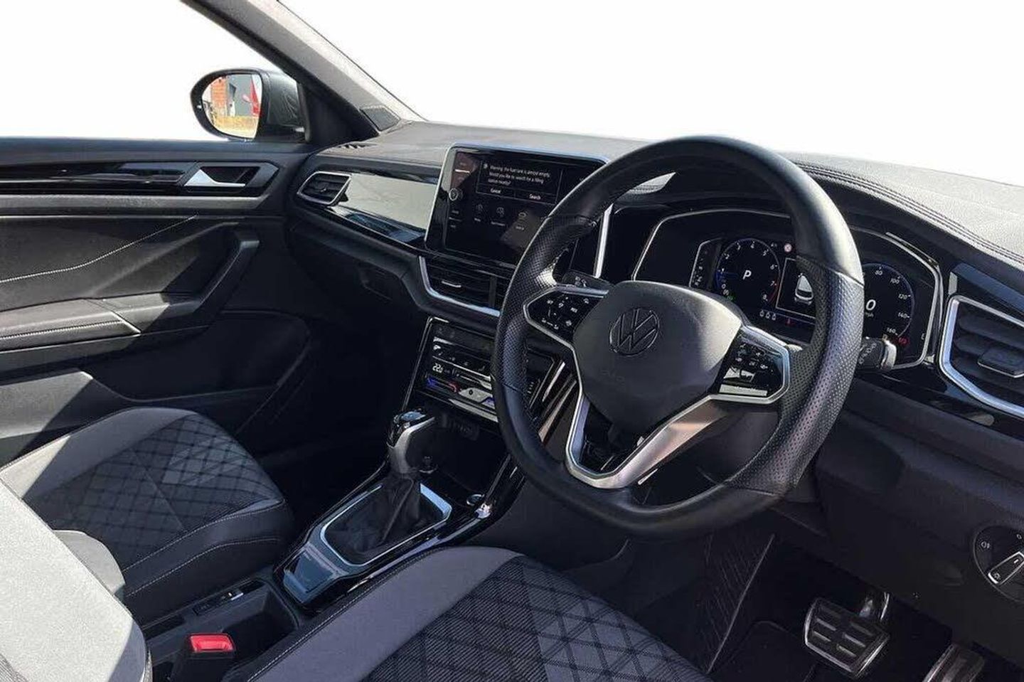 Rear view camera, Keyless entry and start, Front windscreen wiper with intermittent wipe and 4 position delay, Heated rear window, Power windows with comfort operation and circuit breaker, Rain sensor, Rear wash/wipe with intermittent wipe setting, Extended roof spoiler, External USB type C socket and charging sockets, R-Line design body coloured bumpers, Rear exhaust tailpipe, Rear side wing doors, 3rd brake light, Automatic hazard lights activation under emergency braking, Automatic headlight control with LED separate daytime running lights with coming/leaving home function, LED Plus headlamps, LED rear combination lamps, LED rear number plate lights, LED tail lamp rear comination lamps, Rear fog light on one side and reversing lights on both sides, ABS, Electronic parking brake, Electronic Stability Control (ESC) inc EDL (Electronic Differential Lock) and ASR (Traction Control), Front assist with city emergency braking and pedestrian monitoring, Hill start assist, Rear disc brakes, Volkswagen roadside assistance, Driver alert system with fatigue detection, Lane keeping system Lane Assist, Modified key software - reduce switch off time for key status change to Long no motion, Park assist including front and rear parking sensors, Auto dimming interior rear view mirror, Exterior mirrors aspherical on driver side, convex on front passenger side, Remote electrically foldable door mirrors, puddle lights and reverse activated passenger's door mirror, 3 point height adj front seatbelts + pretensioners, 3 point seatbelts in outer rear with ECE label, Child locks on rear doors, Driver and front passenger airbag with front passenger airbag deactivation, Driver and front passenger safety-optimised head restraints, Drivers seatbelt reminder, Front and rear passengers curtain airbag system including front side airbags, Front seat side impact airbags, Predictive pedestrian protection, Single tone horn, Tyre pressure loss indicator, Front + rear carpet mats, Air care climatronic air conditoning system with active combination filter and 2-zone temperature control, 12V power socket in centre console, 4 load lashing points in luggage compartment, Black roof lining, Chrome plated radiator grille inserts, air vent surrounds and light switch surrounds, Door and side trim panel with leatherette insert, Drawer under drivers seat, Front centre armrest, Front cupholders x 2, Front scuff plates with R logo, Leather gearshift handle, Load-through provision with cup holder when folded down ('Unsplit rear seat bench, split folding backrest, with centre armrest), Stainless steel pedals, Storage compartment in left and right luggage area, Storage compartment in rear doors, Storage compartments in driver and front passenger doors, Variable boot floor, height adjustable and removable, Front footwell illumination, Front reading light, Instrument lighting, white adjustable panel illumination, Interior ambient lighting and surround lighting, Interior light delay, Luggage compartment lighting, Sunvisors with illuminated vanity mirrors, Bluetooth mobile phone interface, Online services, Wireless app connect, Diversity antenna for FM reception, Front and rear 6 speakers, Music playback - MP3, WMA and AAC files, Premium USB cable in choice of either Apple or Android smartphone compatibility, SD card slot, Simultaneous pairing of 2 compatible mobile devices, Title and cover art display, We Connect and We Connect Plus functionality, Tailgate/trunk lid release from outside, 10.25'' Digital cockpit pro, Driver tips and journey analysis, Emergency call service, Service interval indicator, Think blue trainer driver tips and journey analysis, Warning sound and light for front seatbelts unfastened, Battery regeneration during braking, Start/stop function with battery regeneration, Driver assistance pack without proactive passenger protection - T-Roc, 3 rear head restraints, 3 seat bench in 2nd row, Isofix child seat preparation, Single front passenger seat, Alarm with inte