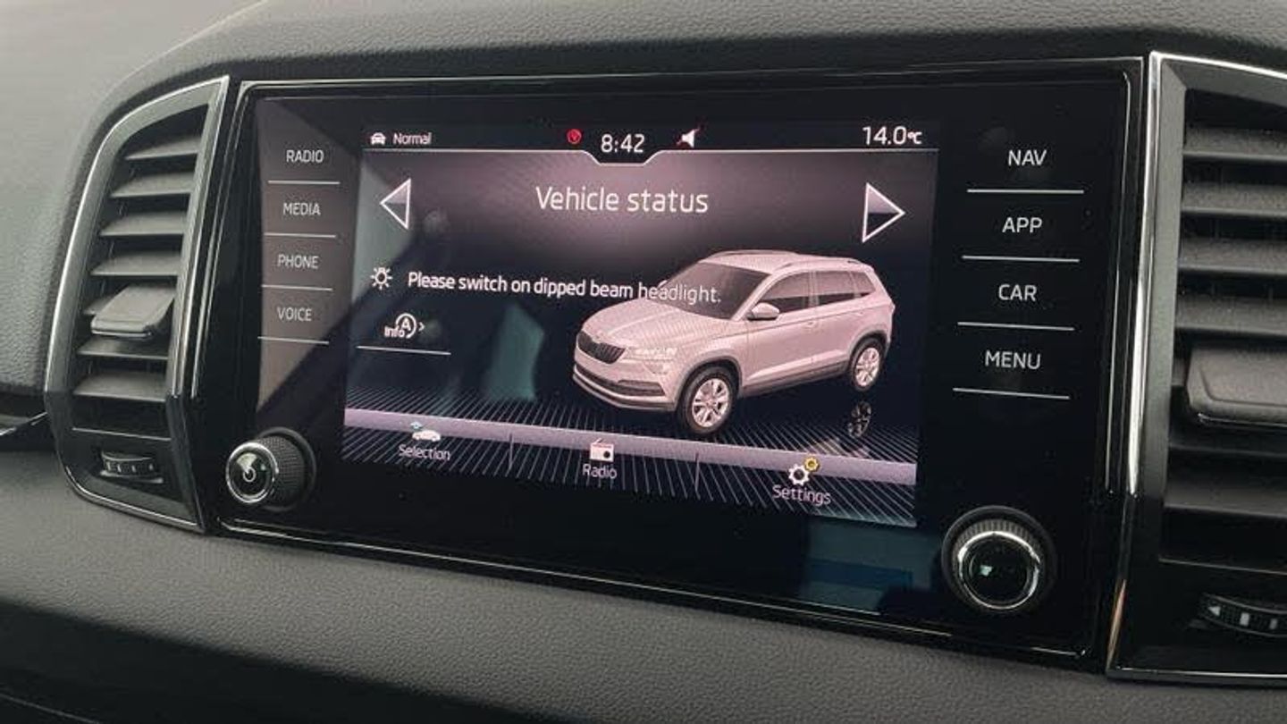 Virtual Cockpit - 10.25 digital display, Metallic - Brilliant silver, Acoustic glass, Headlight washers, Light assistant (coming/leaving home/tunnel light), MSR, ASR, EDS, HBA, DSR, RBS, MKB and traction control, Front assist radar scanning of the space in front of the car with automatic braking, Hill hold control, Driver alert system, Driver profile selection, Driver airbag, 4 lashing points on luggage floor, Height/reach adjust steering wheel, Sunvisors with illuminated vanity mirrors, Start/stop system with regenerative braking, Outside temperature gauge, Service interval indicator, Backrest release, Front seat and rear pockets, SD card slot, USB connection, [Audio and Communications]12V socket in boot, DAB radio with Bluetooth, [Drivers Assistance]Drive mode selector, Rear view camera, Tyre pressure display, Tyre pressure monitor, Driver fatigue sensor, Multifunction colour trip computer, [Exterior]Electric front and rear windows with child proof lock, Heated rear windscreen, Privacy glass, Body colour door mirrors and handles, Body coloured bumpers, Chrome roof rails + chrome pack - Kodiaq, [Illumination]Automatic headlight control system, Full LED headlights + adaptive front light system + LED daytime running lights and front cornering fog lights, LED rear lights with high functionality, Third brake light, [Interior]Aero front windscreen wipers with intermittent function, Black electric window control buttons, Safety reflectors on front doors, Textile floor mats, Dual zone climate control, Pollen filter, 1.5 litre bottle holders in driver and front passenger door panels, 12v socket in front centre armrest with storage compartment and rear air vents, 2 Folding hooks and nets in boot, 4 foldable roof handles with rear coat hooks, Chrome inner door handles, Folding tables on the front seat backrests, Ice scraper, Illuminated and cooled glovebox, Net programme in boot, Pen holder, Rear boot cover, Retractable parcel shelf attachable to tailgate, Storage box in upper central dashboard closed, Storage compartment below the passenger seat, Umbrella under passenger seat, 2 Front readings lights for driver and passenger, Cargo elements in boot, Illuminated luggage compartment, Rear reading lights, Removable LED torch in the boot, Safety vest holder, Chrome framed air vents, Height adjustable passenger seat, Rear seats fixed folding and divided 60:40, VarioFlex seats with retractable parcel shelf, Storage on wheel cover, [Safety and Security]Electronic parking brake with auto hold function, Emergency rear braking signal, ESC including ABS, Airbags - Front side, head, knee and curtain, Automatic door unlocking in case of crash, Automatic fuel cut off in case of crash, Passenger airbag with switch-off function, Pedestrian monitor, Seatbelt reminder signalisation and pretensioner for all seats, Three point seatbelts rear, Two tone horn, 3 rear height adjustable headrests, Height adjustable front three point seats belts with tensioners, Isofix child seat preparation outer rear, Alarm with interior monitoring, back up horn and tilt sensor with safe function, Electronic engine immobiliser, Keyless entry and keyless start with safe system, Remote central locking with 2 remote folding keys