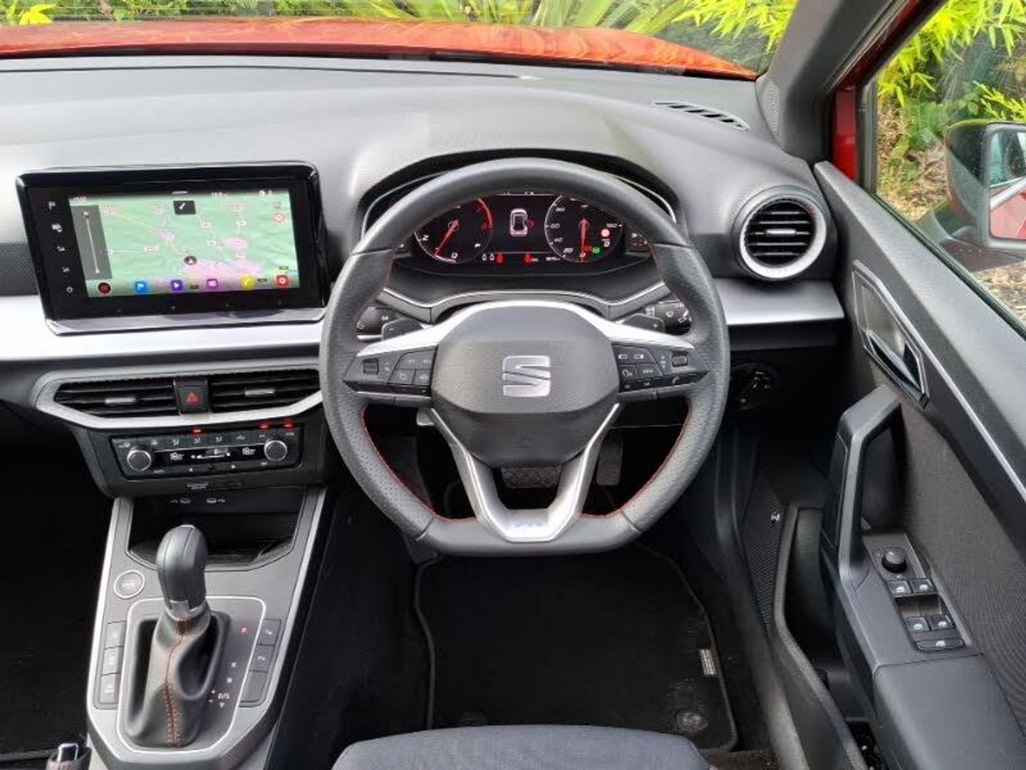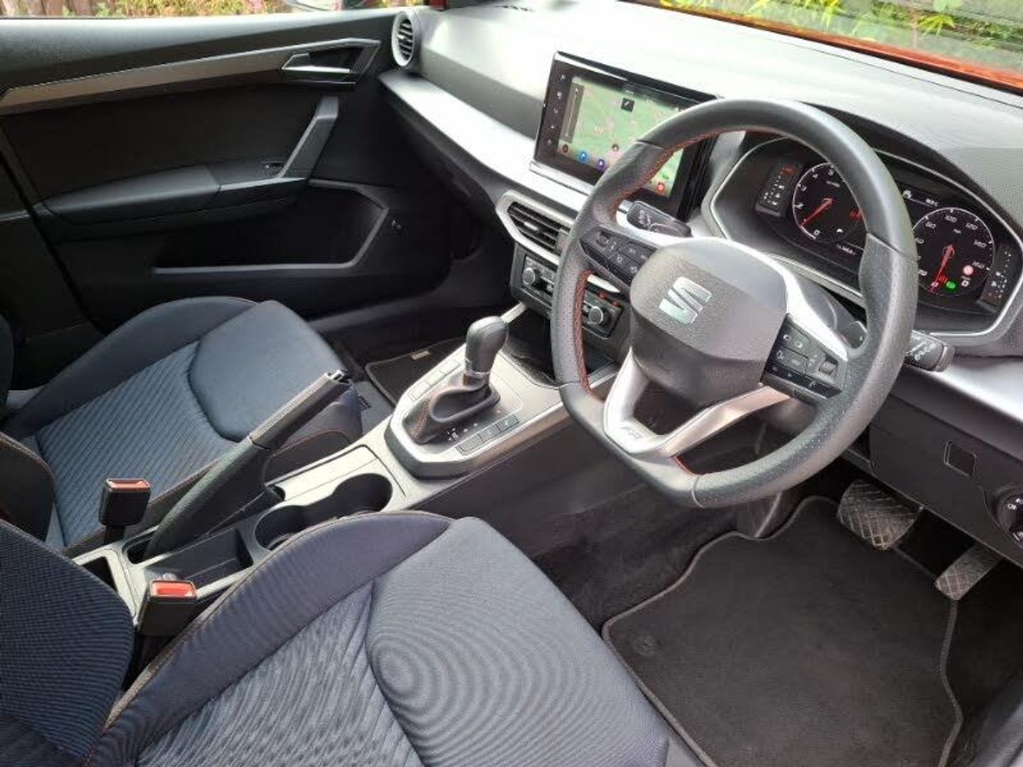 Android Auto, Apple CarPlay, LED daytime running lights, LED Headlights, MirrorLink, Rear parking sensor, Steering wheel audio controls, 10" Digital cockpit, Electric speed sensitive power steering, Full Link Smartphone Integration with Mirror Link, Apple Car Play, Google Android Auto with USB Type C cable for Apple and Android compatibility, Lane keeping system, Park assist system, Rear view camera, SEAT Drive profile - Four different models normal-sport-eco-individual, steering response, throttle response and gear shifts mode, Wireless phone charger, Cruise control and speed limiter, 9.2" colour touchscreen with navigation system, voice control and USB port (type c), Bluetooth interface for hands free and audio streaming, Steering wheel mounted audio controls, Auto dimming interior rear view mirror, Dark tinted rear windows, Electrically adjustable, heated and folding door mirrors, Rain sensing wipers, Twin exhaust pipe styling hidden exhaust pipe, 60/40 split folding rear seat, Height adjustable front seats, ISOFIX points in outer rear seats with top tether anchorage points, Interior ambient lighting, Microsuede cloth upholstery + sports bucket seats, Perforated flat bottomed leather steering wheel/gear knob/handbrake with red stitching and FR logo, Safe and driving pack (S) - Arona, Interior chrome pack - Arona, ABS, Electronic Stability Control (ESC), Emergency Brake Assist (EBA) and front assist, Multi-Collision braking, Hill hold control, KESSY Keyless entry and go, Electronic engine immobiliser, Titan black dashboard, 18" Performance Cosmo grey alloy wheels