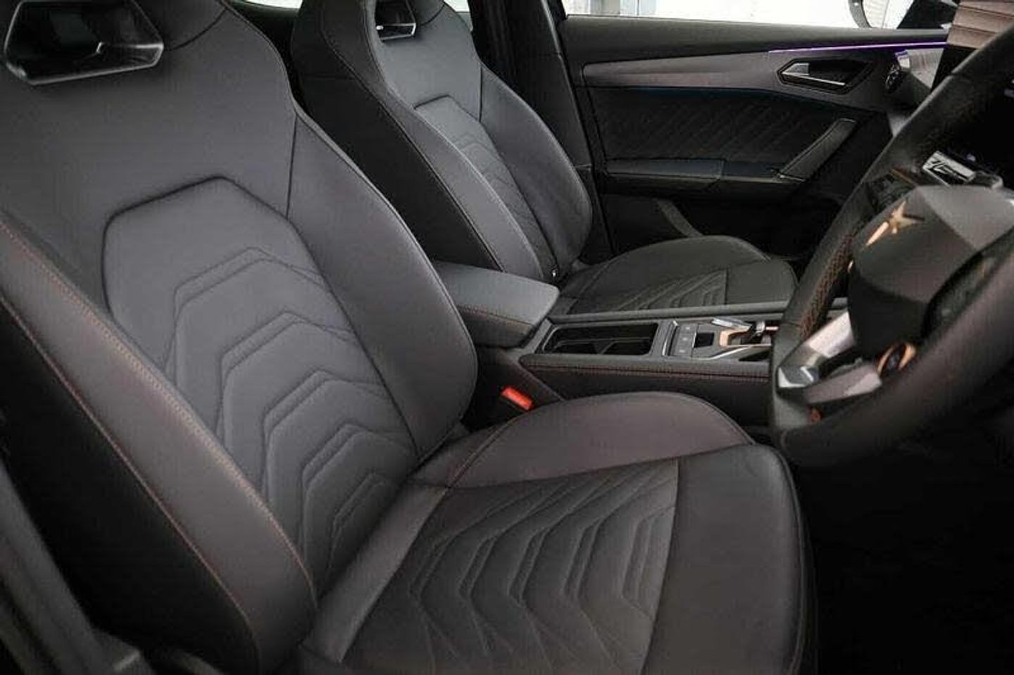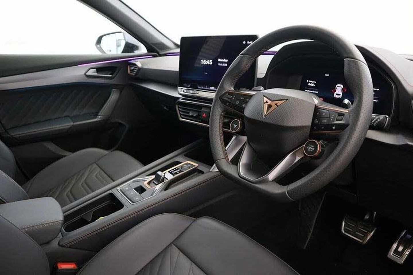 Electronic Stability Programme ESP, Welcome Lights (with Exterior Mirror Housing), Parking Assistant (Parking Assistant) Intelligent Park Assist, Third Brake Light Thrid Brake Light, Computer (Driver Information System) Dynamic Chassis Control incl.: Driving Profile Selection (Comfort-Sport-CUPRA-Individual), In Car Entertainment (Internet Connection) Full Link Phone Integration (Wireless Apple Carplay, Wired Google Android Auto), AM/FM Radio, On-Board Monitor (Head Up Display) 10.25in Digital Cockpit, CUPRA Connect PLUS: Online Infotainment 3 Years Subscriptions incl.: Online Map Update, Online Traffic Information, Online Route Calculation, Parking and Petrol Stations, Speakers (Seven) Seven Speakers, Touch Screen Monitor (Touch Screen Monitor) 12.9in Touchscreen Display, Voice Activated Controls (Navigation System) Voice Control, Electric Windows (Front/Rear) Electric Front and Rear Windows, Heated Rear Screen, Power Socket (Front) 12V Power Supply in Centre Console, Rear Wash/Wipe (Rear) Rear Wash/Wiper, Remote Hatch Opener (Remote Hatch Opener) Virtual Pedal with Electric Tailgate, Seat Height Adjustment (Memory Driver/Passenger) Electrically Adjustable Seats with Memory Function, Seat Lumbar Support (Driver/Passenger Electric) Electrically Adjustable Lumbar Supports with Memory Function, Seating Capacity (Five Seats) Five Seats, Steering Wheel Mounted Controls (Audio/Cruise Control/Telephone) Steering Wheel Mounted Controls with Satellite Buttons and Gearshift Paddle, Upholstery Cloth/Leather Moon Slate Metallic Leather and Sides in PVC with Coppper Stitching, Seat - ISOFIX Anchorage Point (Five Seats - Front & Rear) Isofix, Tele Aid CUPRA Connect Safety & Service:10 Year Subs.incl.: Private Emerg.Call, Breakdown Call, Service Scheduling, CUPRA Connect Remote Access:10 Year Subs.incl.:Driving Data, Remote Climatisation, Parking Position, Remote Lock, [Audio and Communications]Satellite Navigation Navigation System, USB Connection 2 Front & 2 Rear USB Type C Sockets, [Drivers Assistance]Adaptive Cruise Control (Adaptive Cruise Control) Adaptive Cruise-control with Follow-to-stop, Blind Spot Assist (Blind Spot Assist) Side Assist (Blind Spot Monitor), Parking Aid (Front/Rear) Front and Rear Parking Sensors, Rear View Camera, Top View Camera, Speed Limiter, Tyre Pressure Control (Passive Tyre Pressure Control) Tyre Pressure Monitoring, [Exterior]Rear Fog Lamp, Mirrors External (Memory Electric/Heated/Folding) Electrically Adjustable, Folding and Heated Door Mirrors with Memory Function, Tinted Glass (Rear Windows) Tinted Rear Windows, Roof Rails Gloss Black Roof Rails and Window Surrounds, [Illumination]Exterior Lighting (LED Daytime Running Lights) Daytime Running Lights with Coming and Leaving Home Function, Matrix LED with Multifunction Camera, LED Taillights with Dynamic Indicator, Dynamic Headlight Range Control, Headlight Elevation (Automatic) Automatic Headlight Control, [Interior]Armrest (Front/Rear) Front Centre Armrest, Rear Armrest, Climate Control Three Zone Climate Control with Control Panel in Rear, Interior Lights Smart Wraparound Interior Lighting, Reading Lights (Two in Front, Two in Rear), Illuminated Front Door Sill, Mirrors Internal (Automatic Dimming Rear View) Auto-dimming Rear View Mirror, Rain Sensor Rain Sensing Wipers, Seats Heated (Driver/Passenger) Heated Front Seats, Seats Split Rear 60:40 Rear Seats, Seats Sports (Front) Bucket Seats, Steering Wheel Leather Leather Steering Wheel, Steering Wheel Sports Supersports Multifunction Steering Wheel, Sun Visor Illuminated Sunvisor with Mirror, Extra Storage Storage Pockets on Rear of Front Seats, Variable Luggage/Load Compartment Floor, Head Restraints (Front/Rear) Front & Rear Head Restraints, [Performance]Brake Control System (ESC and Brake Booster), Start/Stop System (Start/Stop System) Start Stop System with Regenerative Braking, [Safety and Security]Key (Keyless Entry) Keyless Entry and Start (KESSY) with Safelock, Air Bag Driver Airbag on Driver,