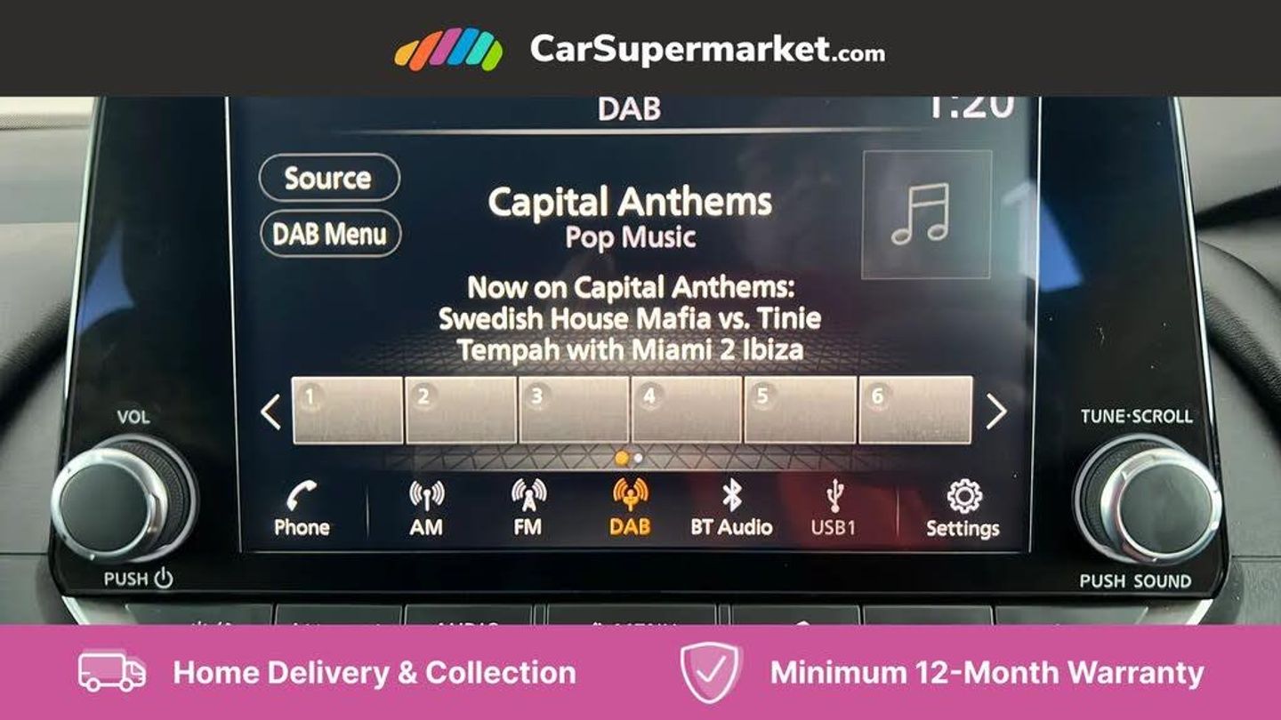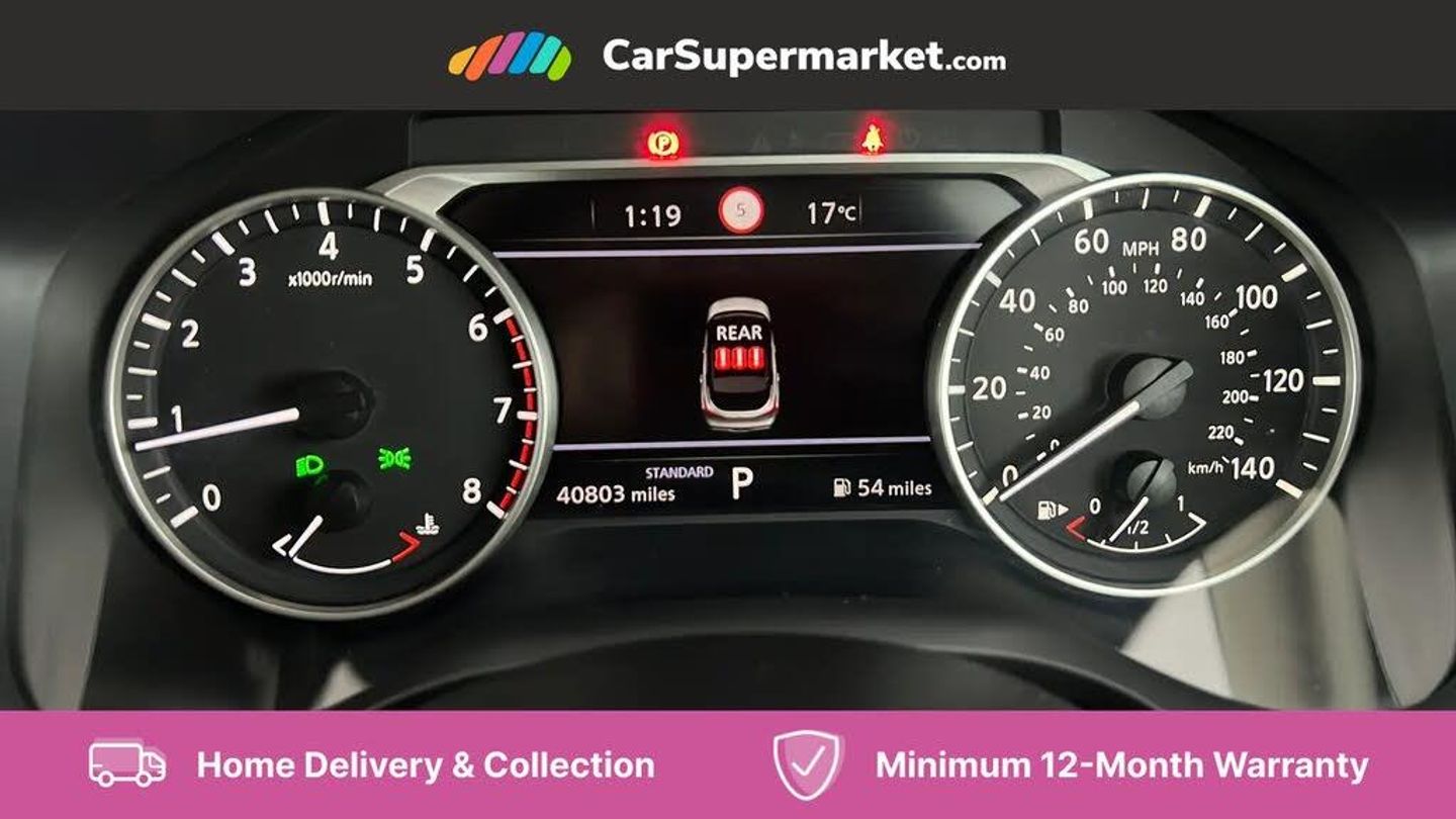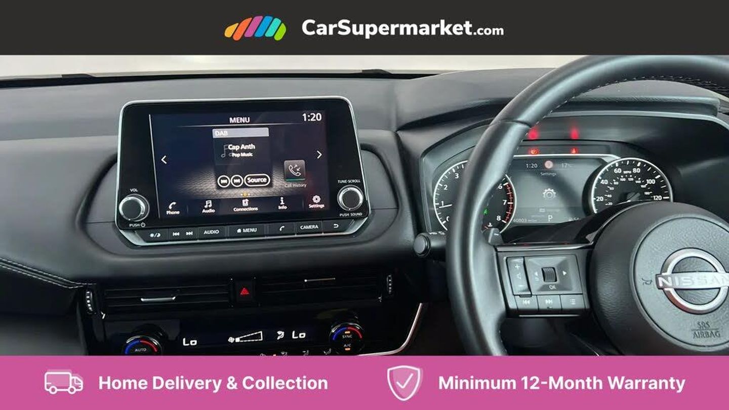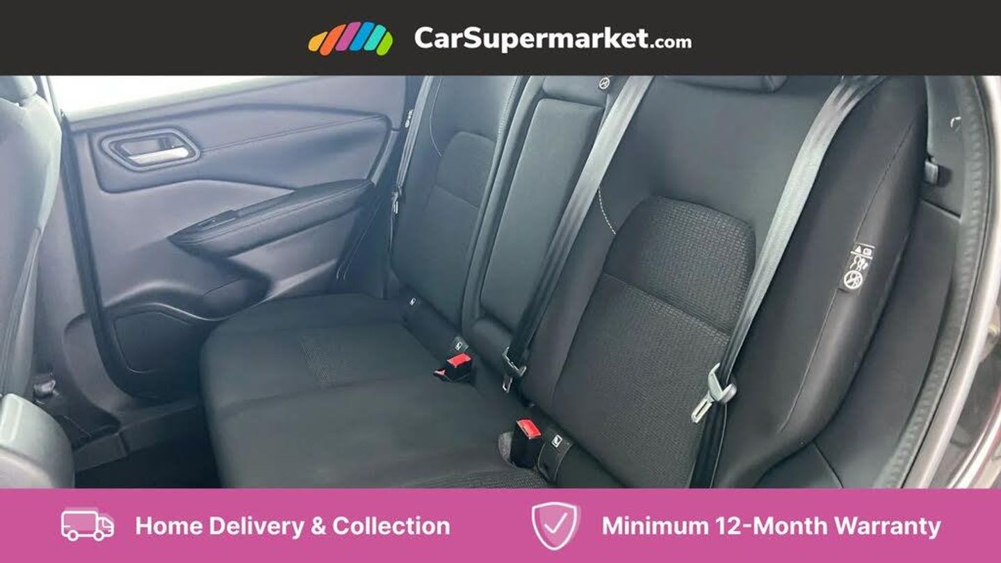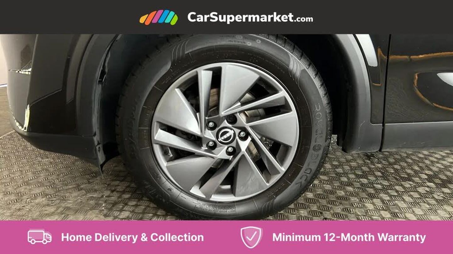7" High definition full colour TFT screen combimeter,Android auto/Apple CarPlay (Wired),Blind spot warning,Drive modes (sport, normal, eco),Electric speed sensitive power steering,Emergency and breakdown call,Idle stop/start system,Intelligent Cruise control (ICC),Intelligent driver alert system,Intelligent forward collision warning,Intelligent lane intervention,Lane departure prevention,Lane departure warning system,Maximum speed limiter,Nissan connect 8" touchscreen infotainment system,Push button starter,Rear cross traffic alert,Rear parking sensors,Rear view camera,Traffic sign recognition with legal speed adjustment,Trip computer,6 speakers,AM/FM audio system with DAB,Bluetooth audio streaming,Front USB connections (Type-A and Type-C),Auto dimming rear view mirror,Auto rear wiper when reversing,Automatic hazard signal with emergency stop signal,Body colour mirror caps,Body coloured door handles,Bodyside mouldings,Chrome side window finisher,Door handle with button,Electric auto folding door mirrors,Electrically adjustable and heated door mirrors with LED turn indicator,Follow me home headlights,High beam assist,Intelligent auto headlights,LED 3rd brake light,LED daytime running lights,LED Headlights,LED rear lights,One touch front and rear electric windows with remote opening and closing,Partially body coloured bumpers,Rear reversing light (bulb lighting),Rear roof spoiler,Rear side wing doors,Shark fin antenna,Splash free rain sensing wipers,Three blink turn signal,12v power socket in dashboard and luggage,2x Rear coat hooks,3 bench rear seats in 2nd row,3 rear headrests,4 folding assist grip,6-way manually adjustable driver's seat,60/40 split folding rear seat bench,Centre console storage tray,Chrome interior door handles,Cloth monoform upholstery,Driver and front passenger sunvisors with illuminated vanity mirrors,Dual zone automatic climate control with pollen filter,Electrically adjustable lumbar support for driver,Front and rear door storage,Front centre console and armrest,Front cupholders x 2,Front door with bottle holders,Glovebox with light,Hard trunk cover,Height adjustable driver's seat,Height adjustable front headrests,Height adjustable passenger seat,Luggage space lighting,Manually adjustable passenger (slide recline + lifter),Multifunction steering wheel,Passenger seat back pocket,Rear armrest with 2 cupholders,Rear door bottle holders,Single front passenger seat,Steering wheel gearshift paddles,Steering wheel switches,Sunglasses holder,Tilt/telescopic adjustable steering wheel,Two rear isofix child seat anchorage points with top tether,3x3 point rear seatbelt pretensioners + load limiters,ABS with EBD and brake assist,Active brake limited slip,Auto hold function,Child locks on rear doors,Curtain and front side, far side airbags,Driver and passenger airbags,Driver, passenger and 2nd row rear seat belt reminder,Electronic parking brake,Front seatbelt pretensioners + load limiters,Height adjustable front seatbelts,Hill start assist,Intelligent blind spot intervention,Intelligent front emergency braking with pedestrian, cyclist recognition and junction assist,Intelligent rear automatic braking,Tyre pressure monitoring system,Vehicle dynamic control,Capless fuel filler,Engine immobiliser,Intelligent Key,Remote central door locking with deadlocking,Thatcham Cat.1 alarm,Interior instrumental panel A finisher,17" Alloy wheels,Tyre puncture repair kit