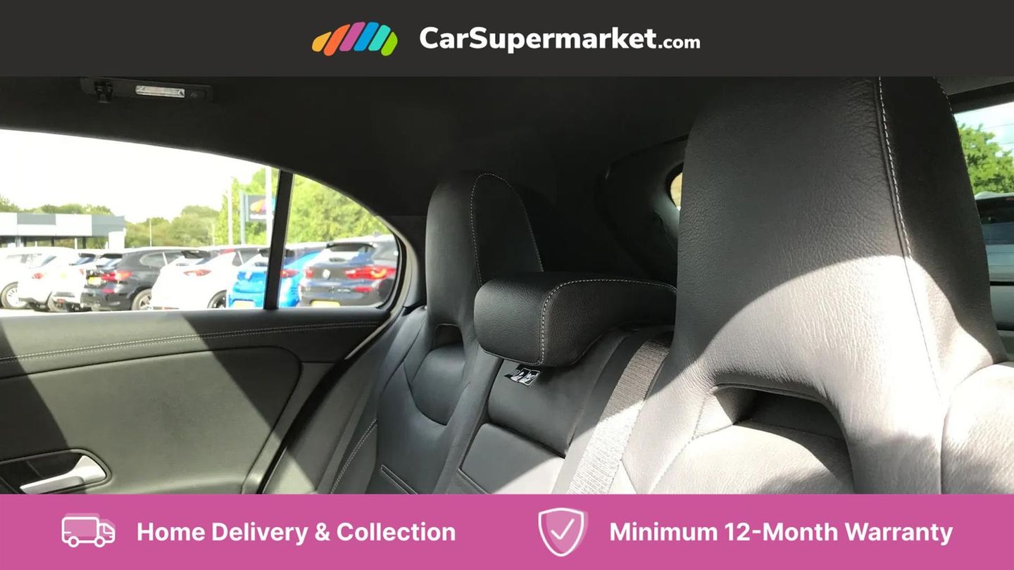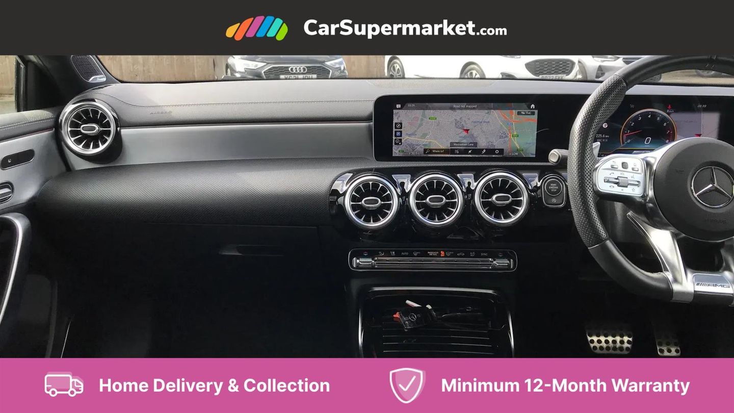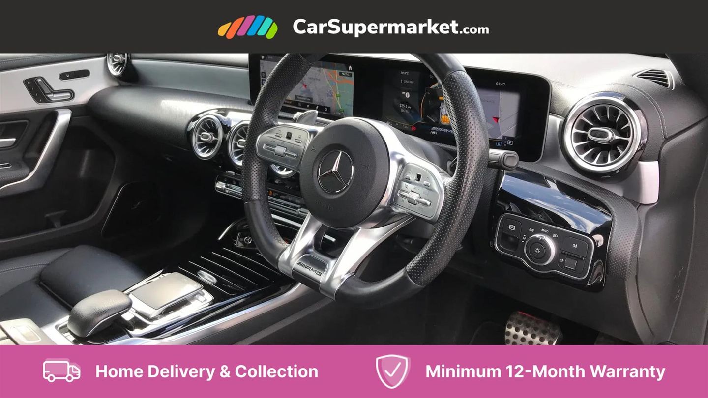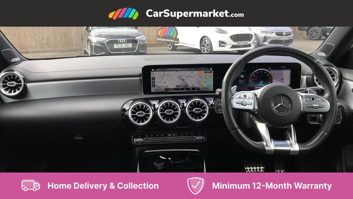 10.25" Digital instrument cluster display screen,180 degree rear view camera with parking guidelines,Attention assist,Brake pad wear indicator warning light,Direct steering,DYNAMIC SELECT with driving programs (Slippery, Comfort, Sport, Sport+ and Individual),ECO start/stop function,Fluid level warning indicator for fuel, oil, coolant and washer fluid,Hard-disk navigation,Hey Mercedes Voice activation,Lamp failure indicator,Mercedes me connect including emergency call system, accident recovery, breakdown and maintenance management,Outside temperature gauge,Service indicator (ASSYST),Speed sensitive power steering,Trip computer,DAB Digital radio,MBUX multimedia system with DAB digital radio and touchpad including satellite navigation,4 Electric Front and Rear windows,Adaptive brake lights,Body colour bumpers,Body colour side skirt,Electric adjustable and heated door mirrors with integrated LED side indicators,Heated glass rear windscreen + timer control,LED daytime running lights,LED tail lamp,Panoramic sliding sunroof,Privacy glass,Rear fog lights,Rear wiper,Wider wheel arches for AMG wheels,40:20:40 split folding rear seats,AMG Performance steering wheel in nappa leather,Auto Mercedes-Benz child seat recognition sensor,Black roof lining,Brushed stainless steel sports pedals with rubber studs,Controller on centre console with chrome surround,Front centre armrest with storage compartment,Front seat backs luggage nets,Height/reach adjustable steering column,Interior lighting - 64 colour Ambient lighting,Rear head restraints,Seat occupancy sensor for front passenger seat,Sports seats with integrated headrests,Stowage compartment in centre console with retractable cover,Sunvisors with illuminated vanity mirrors,Twin front cupholders,Two zone thermotronic luxury automatic climate control,Light and sight pack - A Class,Mirror package - A Class,Seat comfort pack - A Class,3 rear 3 point seatbelts,ABS with Brake Assist,Active bonnet,Adaptive brake assist with hold function and hill start assist,Childproof locks manually operated for rear doors and electrically operated for rear power windows,Crash responsive emergency lighting,Driver and passenger head and side airbags,Drivers knee airbag,Dual stage driver/passenger airbags,Electronic parking brake,ESP curve dynamic assist,ESP with ASR,Front and rear seatbelt reminder,Perforated front brake discs,Tyre pressure monitoring system,Warning triangle and first aid kit,Window airbags,Alarm system/interior protection/immobiliser,Keyless entry lock/unlock,Remote central locking and crash sensor with emergency opening function,Light aluminium with longitudinal grain interior trim,Summer tyres,Tirefit sealant kit,Active lane keep assist,Active park assist with parktronic system including front and rear parking sensors,Radio aerial integrated into roof spoiler,Burmester surround sound system,Dual bluetooth interface, 2 USB ports (type C),AMG front, rear apron and side skirts,AMG radiator grille with twin louvre,Blue tinted glass,Body colour door handles,Body coloured door mirrors,Chrome beltline trim,Illuminated front door sill panels with Mercedes-Benz lettering,LED third brake light,Multibeam LED with adaptive highbeam assist plus,Rain sensor windscreen wipers,Two round tailpipes attached to rear apron,12V socket,Air vents surround and cruciform nozzle in silver chrome,AMG leather on door centre panels,Beltline double topstitching,Cup holder and stowage compartment lighting,Electric front seats with memory function,Freight packaging without tie-down hooks,Front door sills with Mercedes Benz lettering,Front footwell lights,Front reading lamps in left and right console downlighter,Front seat cushion length adjustment,Front signal exit lamp,Front vanity lights,Gearshift paddles on steering wheel,Handle recess/closing light,Illuminated glove compartment stowage,ISOFIX Child seat top tethers and anchor fixings,Luggage compartment cover,Oddments tray lighting,Rear armrest,Rear Reading Lamps,Spectacles compartment for driver,Storage compartment under load area floor,Touchpad,Touchpad illumination,Front brake callipers with Mercedes Benz lettering