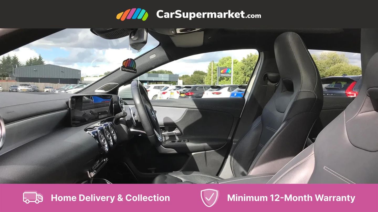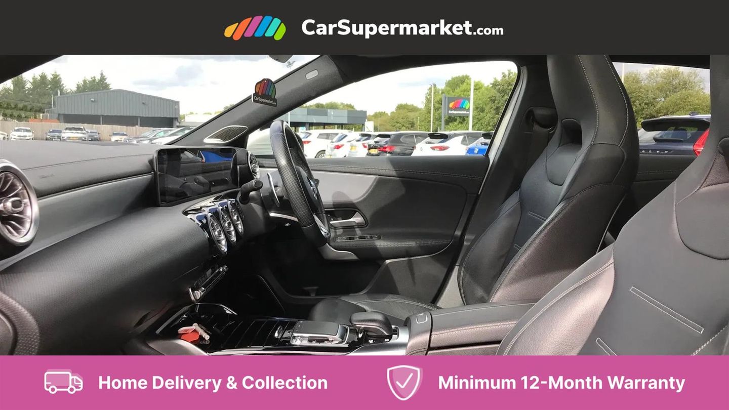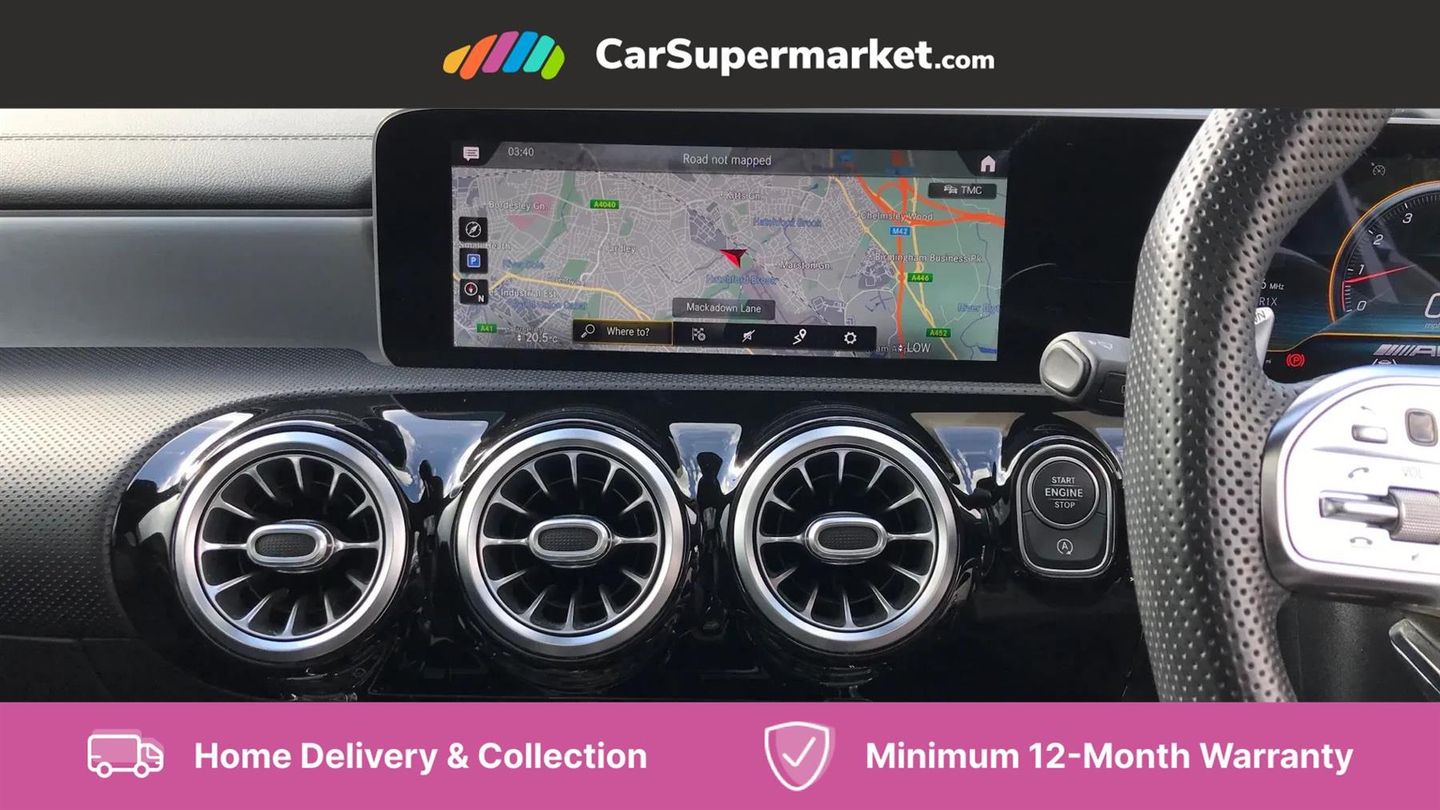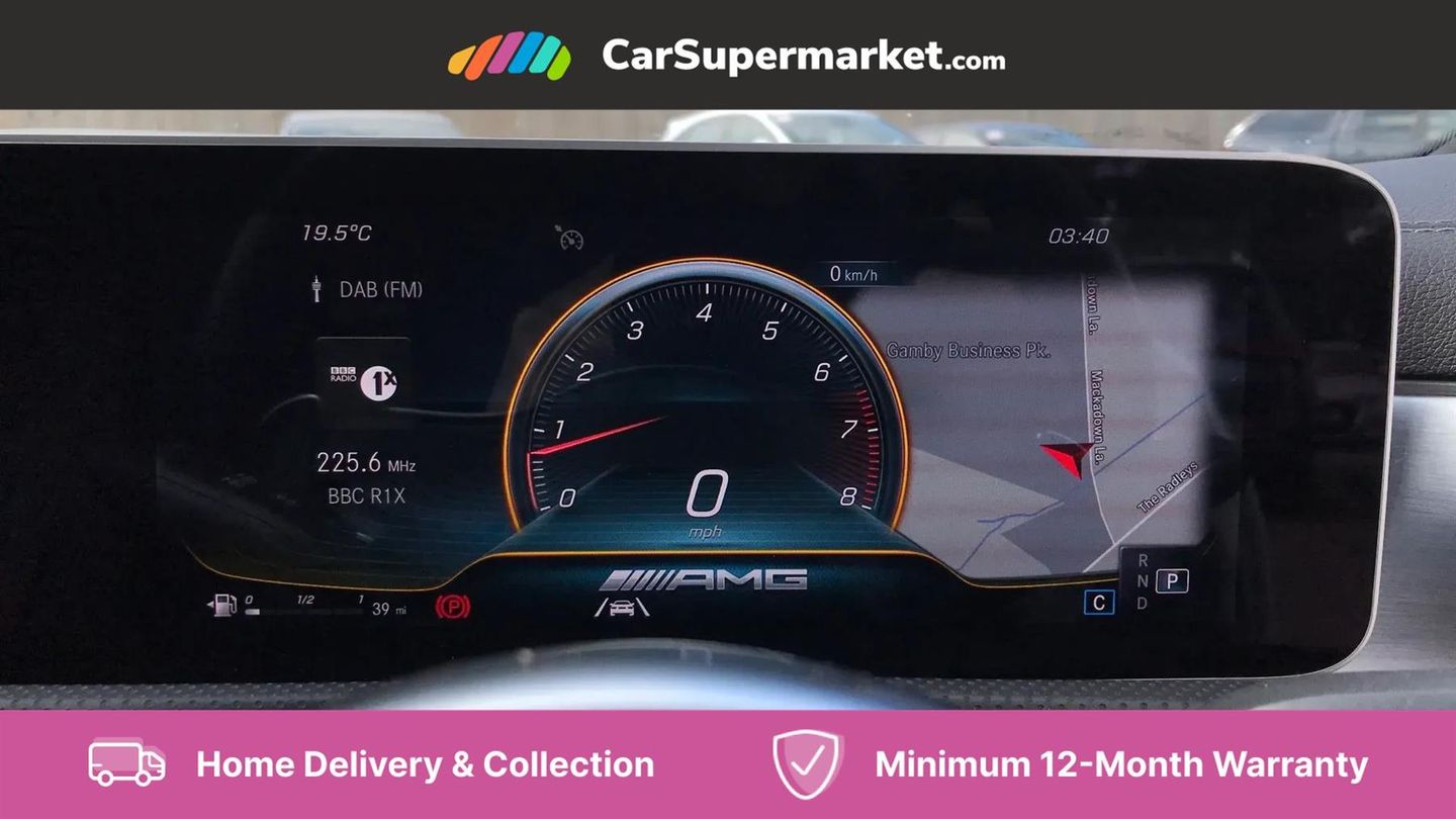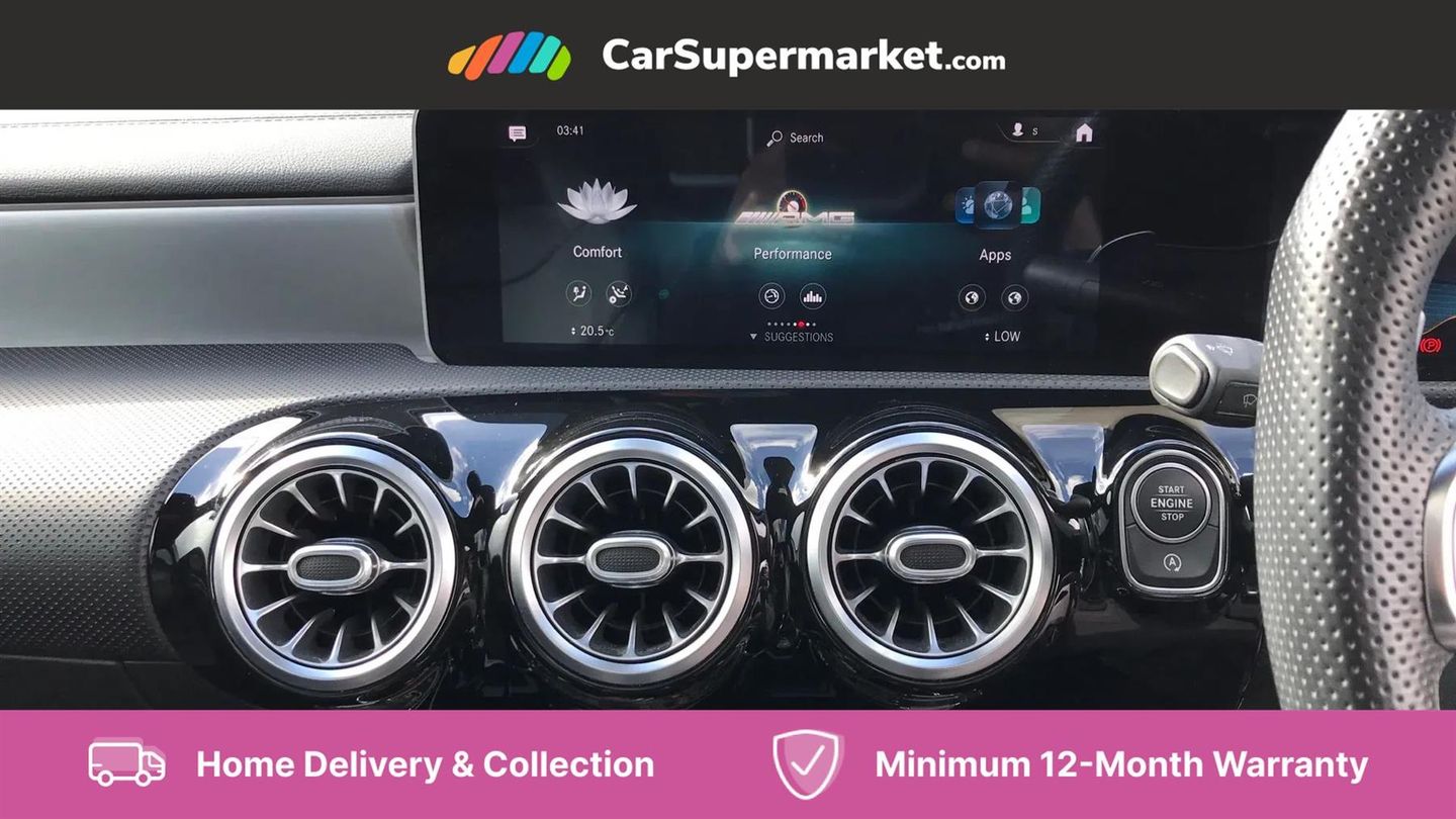10.25" Digital instrument cluster display screen,180 degree rear view camera with parking guidelines,Attention assist,Brake pad wear indicator warning light,Direct steering,DYNAMIC SELECT with driving programs (Slippery, Comfort, Sport, Sport+ and Individual),ECO start/stop function,Fluid level warning indicator for fuel, oil, coolant and washer fluid,Hard-disk navigation,Hey Mercedes Voice activation,Lamp failure indicator,Mercedes me connect including emergency call system, accident recovery, breakdown and maintenance management,Outside temperature gauge,Service indicator (ASSYST),Speed sensitive power steering,Trip computer,DAB Digital radio,MBUX multimedia system with DAB digital radio and touchpad including satellite navigation,4 Electric Front and Rear windows,Adaptive brake lights,Body colour bumpers,Body colour side skirt,Electric adjustable and heated door mirrors with integrated LED side indicators,Heated glass rear windscreen + timer control,LED daytime running lights,LED tail lamp,Panoramic sliding sunroof,Privacy glass,Rear fog lights,Rear wiper,Wider wheel arches for AMG wheels,40:20:40 split folding rear seats,AMG Performance steering wheel in nappa leather,Auto Mercedes-Benz child seat recognition sensor,Black roof lining,Brushed stainless steel sports pedals with rubber studs,Controller on centre console with chrome surround,Front centre armrest with storage compartment,Front seat backs luggage nets,Height/reach adjustable steering column,Interior lighting - 64 colour Ambient lighting,Rear head restraints,Seat occupancy sensor for front passenger seat,Sports seats with integrated headrests,Stowage compartment in centre console with retractable cover,Sunvisors with illuminated vanity mirrors,Twin front cupholders,Two zone thermotronic luxury automatic climate control,Light and sight pack - A Class,Mirror package - A Class,Seat comfort pack - A Class,3 rear 3 point seatbelts,ABS with Brake Assist,Active bonnet,Adaptive brake assist with hold function and hill start assist,Childproof locks manually operated for rear doors and electrically operated for rear power windows,Crash responsive emergency lighting,Driver and passenger head and side airbags,Drivers knee airbag,Dual stage driver/passenger airbags,Electronic parking brake,ESP curve dynamic assist,ESP with ASR,Front and rear seatbelt reminder,Perforated front brake discs,Tyre pressure monitoring system,Warning triangle and first aid kit,Window airbags,Alarm system/interior protection/immobiliser,Keyless entry lock/unlock,Remote central locking and crash sensor with emergency opening function,Light aluminium with longitudinal grain interior trim,Summer tyres,Tirefit sealant kit,Active lane keep assist,Active park assist with parktronic system including front and rear parking sensors,Radio aerial integrated into roof spoiler,Burmester surround sound system,Dual bluetooth interface, 2 USB ports (type C),AMG front, rear apron and side skirts,AMG radiator grille with twin louvre,Blue tinted glass,Body colour door handles,Body coloured door mirrors,Chrome beltline trim,Illuminated front door sill panels with Mercedes-Benz lettering,LED third brake light,Multibeam LED with adaptive highbeam assist plus,Rain sensor windscreen wipers,Two round tailpipes attached to rear apron,12V socket,Air vents surround and cruciform nozzle in silver chrome,AMG leather on door centre panels,Beltline double topstitching,Cup holder and stowage compartment lighting,Electric front seats with memory function,Freight packaging without tie-down hooks,Front door sills with Mercedes Benz lettering,Front footwell lights,Front reading lamps in left and right console downlighter,Front seat cushion length adjustment,Front signal exit lamp,Front vanity lights,Gearshift paddles on steering wheel,Handle recess/closing light,Illuminated glove compartment stowage,ISOFIX Child seat top tethers and anchor fixings,Luggage compartment cover,Oddments tray lighting,Rear armrest,Rear Reading Lamps,Spectacles compartment for driver,Storage compartment under load area floor,Touchpad,Touchpad illumination,Front brake callipers with Mercedes Benz lettering
