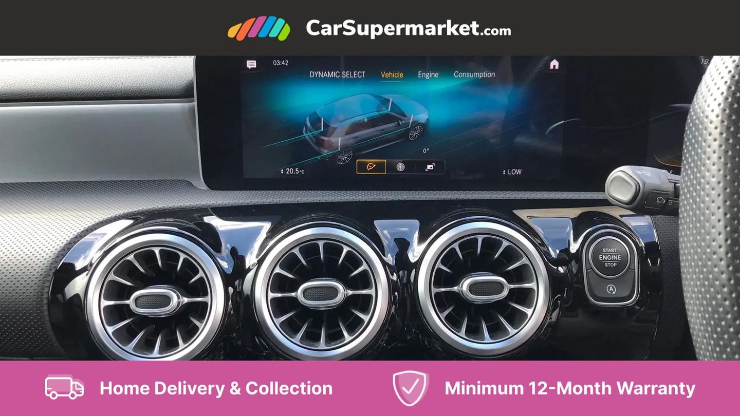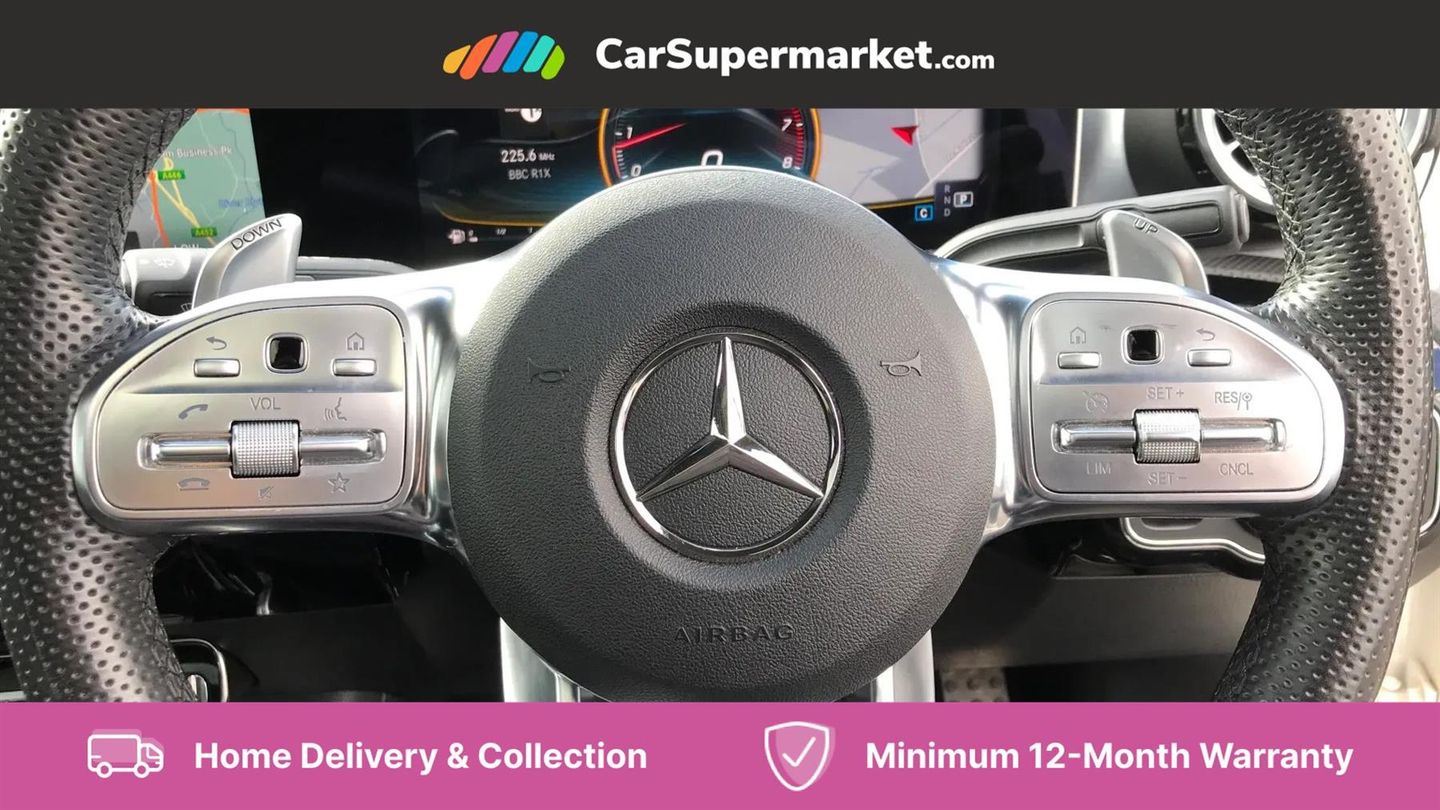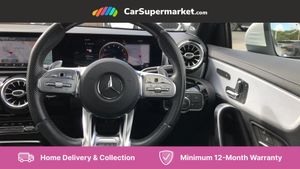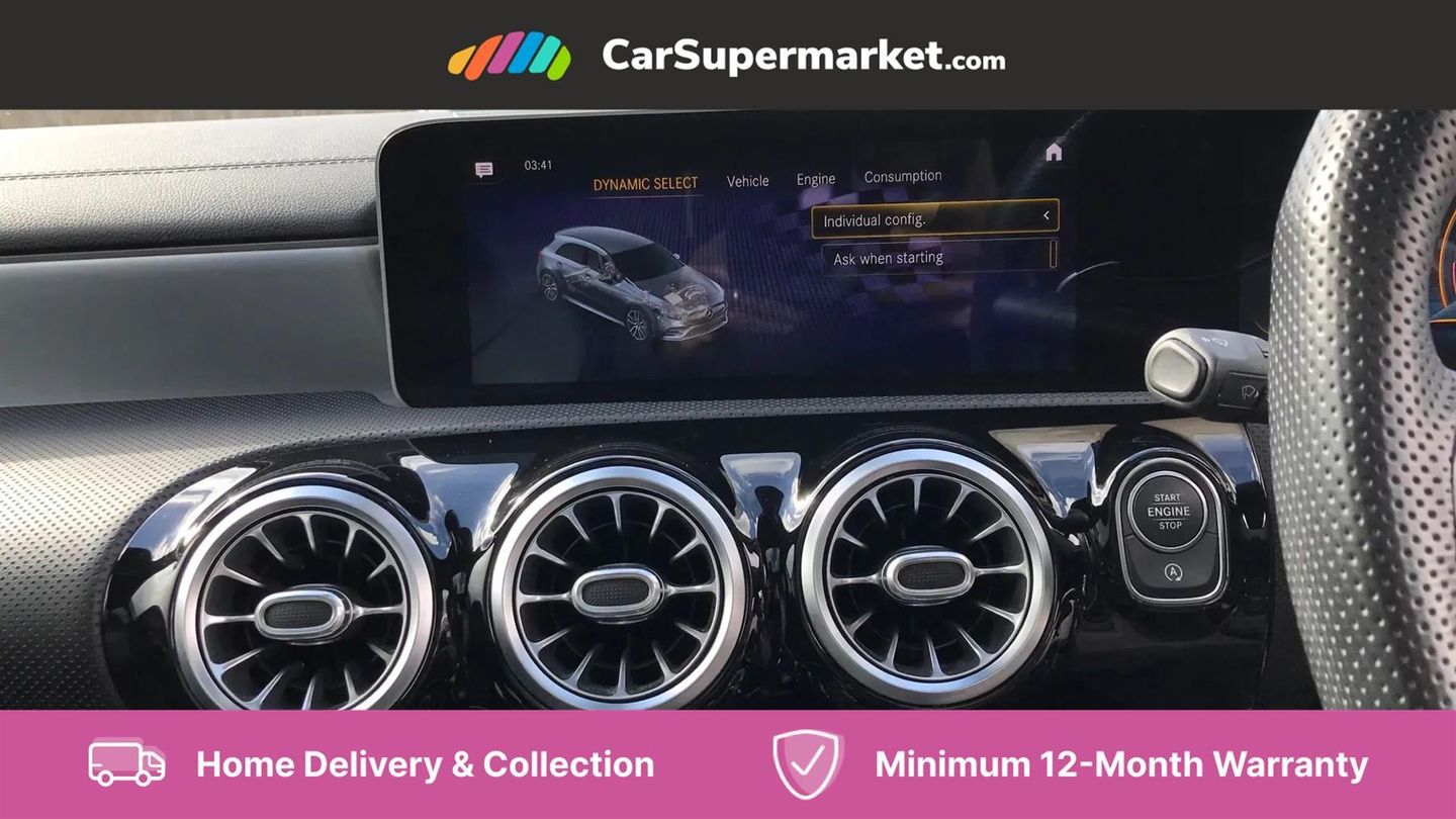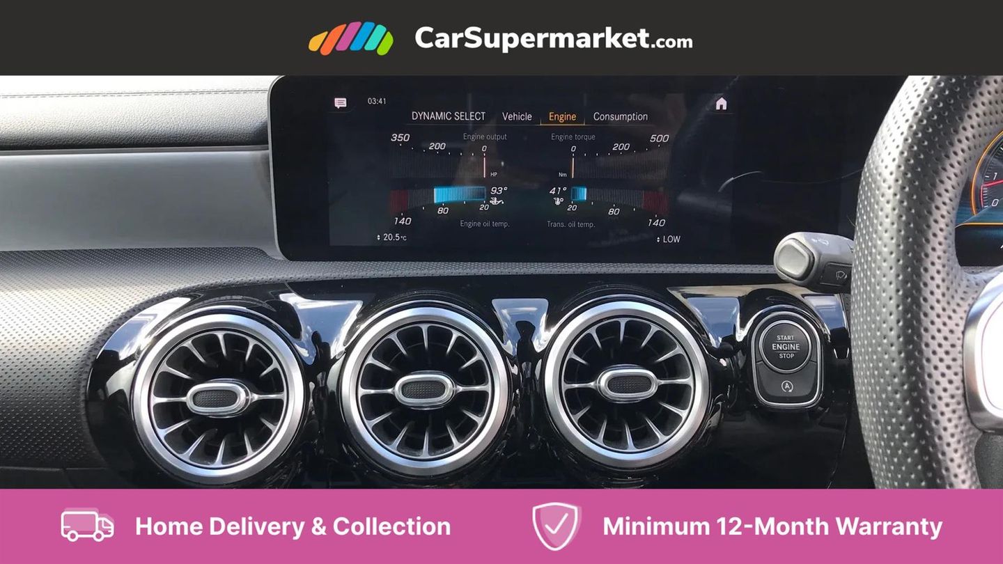 10.25" Digital instrument cluster display screen,180 degree rear view camera with parking guidelines,Attention assist,Brake pad wear indicator warning light,Direct steering,DYNAMIC SELECT with driving programs (Slippery, Comfort, Sport, Sport+ and Individual),ECO start/stop function,Fluid level warning indicator for fuel, oil, coolant and washer fluid,Hard-disk navigation,Hey Mercedes Voice activation,Lamp failure indicator,Mercedes me connect including emergency call system, accident recovery, breakdown and maintenance management,Outside temperature gauge,Service indicator (ASSYST),Speed sensitive power steering,Trip computer,DAB Digital radio,MBUX multimedia system with DAB digital radio and touchpad including satellite navigation,4 Electric Front and Rear windows,Adaptive brake lights,Body colour bumpers,Body colour side skirt,Electric adjustable and heated door mirrors with integrated LED side indicators,Heated glass rear windscreen + timer control,LED daytime running lights,LED tail lamp,Panoramic sliding sunroof,Privacy glass,Rear fog lights,Rear wiper,Wider wheel arches for AMG wheels,40:20:40 split folding rear seats,AMG Performance steering wheel in nappa leather,Auto Mercedes-Benz child seat recognition sensor,Black roof lining,Brushed stainless steel sports pedals with rubber studs,Controller on centre console with chrome surround,Front centre armrest with storage compartment,Front seat backs luggage nets,Height/reach adjustable steering column,Interior lighting - 64 colour Ambient lighting,Rear head restraints,Seat occupancy sensor for front passenger seat,Sports seats with integrated headrests,Stowage compartment in centre console with retractable cover,Sunvisors with illuminated vanity mirrors,Twin front cupholders,Two zone thermotronic luxury automatic climate control,Light and sight pack - A Class,Mirror package - A Class,Seat comfort pack - A Class,3 rear 3 point seatbelts,ABS with Brake Assist,Active bonnet,Adaptive brake assist with hold function and hill start assist,Childproof locks manually operated for rear doors and electrically operated for rear power windows,Crash responsive emergency lighting,Driver and passenger head and side airbags,Drivers knee airbag,Dual stage driver/passenger airbags,Electronic parking brake,ESP curve dynamic assist,ESP with ASR,Front and rear seatbelt reminder,Perforated front brake discs,Tyre pressure monitoring system,Warning triangle and first aid kit,Window airbags,Alarm system/interior protection/immobiliser,Keyless entry lock/unlock,Remote central locking and crash sensor with emergency opening function,Light aluminium with longitudinal grain interior trim,Summer tyres,Tirefit sealant kit,Active lane keep assist,Active park assist with parktronic system including front and rear parking sensors,Radio aerial integrated into roof spoiler,Burmester surround sound system,Dual bluetooth interface, 2 USB ports (type C),AMG front, rear apron and side skirts,AMG radiator grille with twin louvre,Blue tinted glass,Body colour door handles,Body coloured door mirrors,Chrome beltline trim,Illuminated front door sill panels with Mercedes-Benz lettering,LED third brake light,Multibeam LED with adaptive highbeam assist plus,Rain sensor windscreen wipers,Two round tailpipes attached to rear apron,12V socket,Air vents surround and cruciform nozzle in silver chrome,AMG leather on door centre panels,Beltline double topstitching,Cup holder and stowage compartment lighting,Electric front seats with memory function,Freight packaging without tie-down hooks,Front door sills with Mercedes Benz lettering,Front footwell lights,Front reading lamps in left and right console downlighter,Front seat cushion length adjustment,Front signal exit lamp,Front vanity lights,Gearshift paddles on steering wheel,Handle recess/closing light,Illuminated glove compartment stowage,ISOFIX Child seat top tethers and anchor fixings,Luggage compartment cover,Oddments tray lighting,Rear armrest,Rear Reading Lamps,Spectacles compartment for driver,Storage compartment under load area floor,Touchpad,Touchpad illumination,Front brake callipers with Mercedes Benz lettering