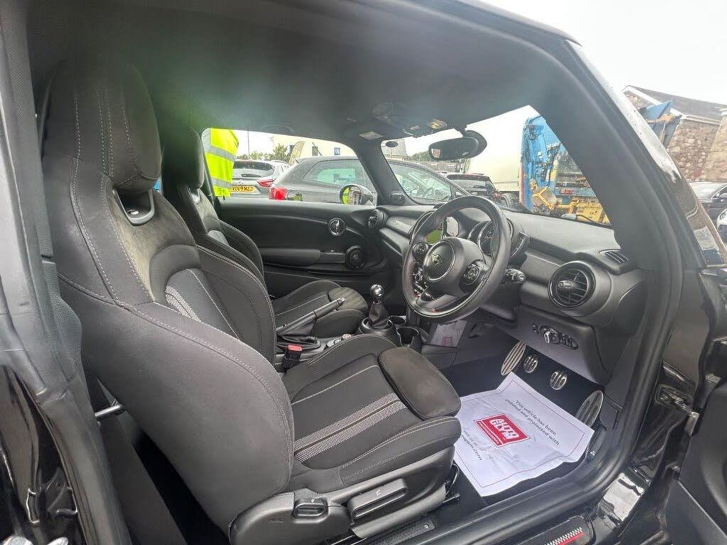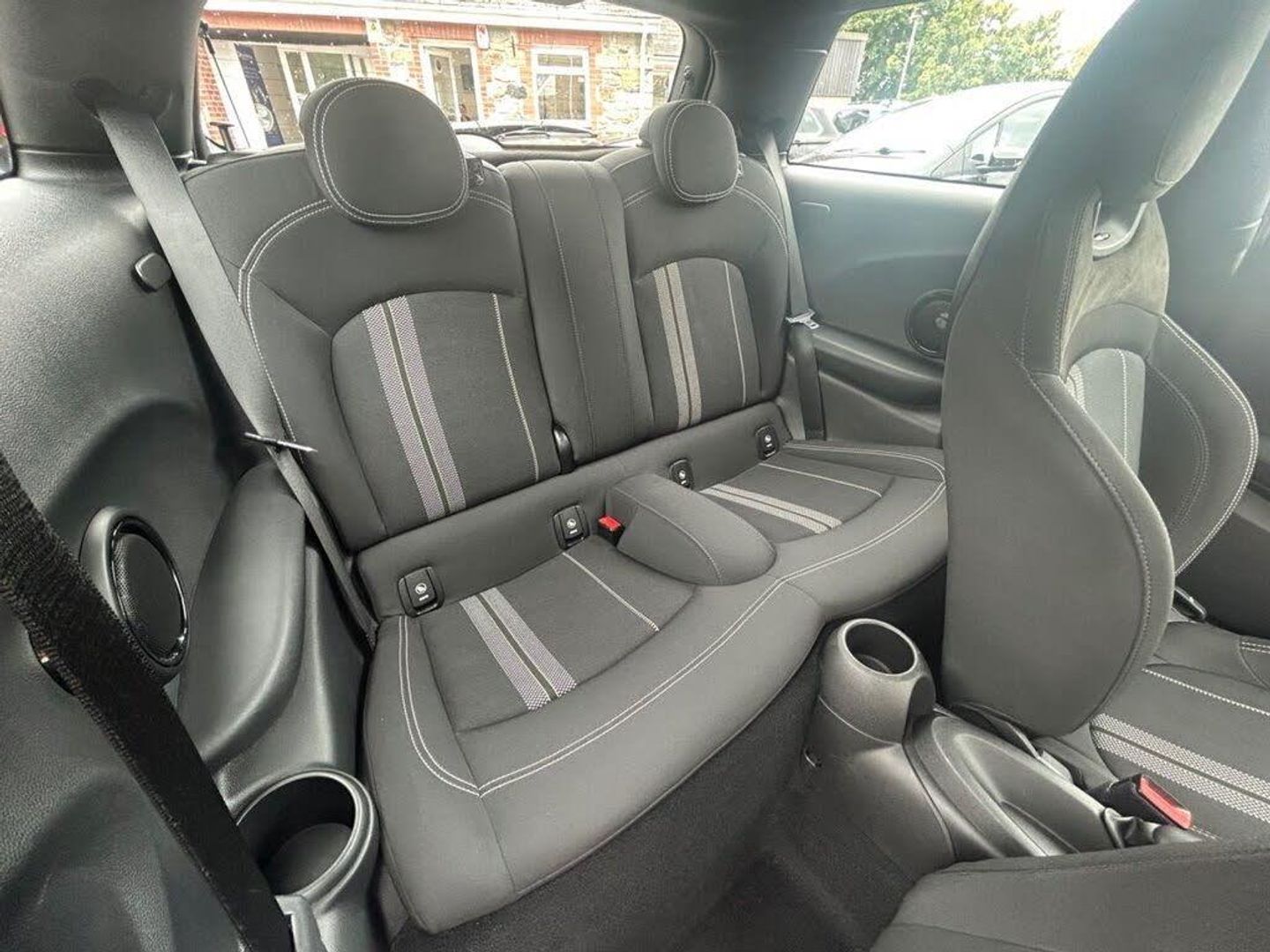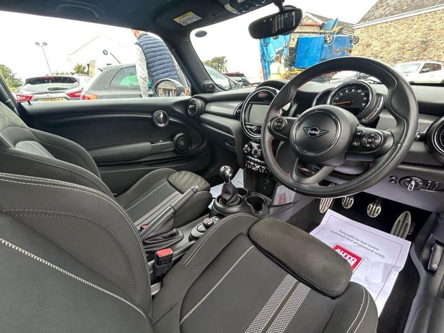 12V Socket in Centre Console, 17in Alloy Wheels - John Cooper Works Track Spoke in Black with Run-Flat Tyres, 3 Point Seatbelts on all Seats, 4 Lashing Eyes in Luggage Compartment, 4 Speakers - in Front Door Trims and Underneath Front Seats, 6.5in Screen with LED Ring, Air Conditioning - Manual, Airbags, Alarm System, Anti-Lock Braking System - ABS, Automatic Headlight Activation Switch, Bluetooth for Compatible Mobile Phone - with Audio Streaming, Carbon Black Colour Line - Knee Roll and Door Armrests, Chrome Highlights, Cruise Control with Brake Function, Cup Holders, Dinamica-Cloth - Carbon Black, Door Storage Compartments, Dynamic Brake Lights, Dynamic Stability Control - DSC, Electric Windows - Front, Electro-Mechanical Steering with Speed Dependant Steering Assistance, Electronic Vehicle Immobiliser, Exhaust Tailpipe - Left with Chrome Finisher, FM Tuner and DAB Digital Radio, Foldable Rear Seats 60-40, Front and Rear ISOFIX - including Front Passenger Airbag Deactivation, Fuel Filler Cap in Body Colour, Gear-Change Indicator Display, Glove Compartment, Harman Kardon Hi-Fi System, Headliner - Anthracite, Heated Rear Window, Heated Windscreen Washer Jets, Instrument Cluster, Interior Lighting, Interior Surface - Hazy Grey, John Cooper Works Aerodynamic Kit, John Cooper Works Leather Steering Wheel, John Cooper Works Roof Spoiler, John Cooper Works Sport Seats, Leatherette Gearshift Lever and Handbrake Gaiters, LED Headlights with Closed Ring as Daytime Driving Lights, LED Reading Lights - Vanity Mirror Lights - Front Footwell Lights - Spotlights on Front Seats, Mechanical Seat Adjustment, Midnight Black, MINI E-Call, MINI Logo Projection on Floor from Drivers Exterior Mirror, MINI TeleServices, Model Logo Cooper on Right of Tailgate, Multifunction Controls for Steering Wheel, On-Board Computer, Performance Control, Radiator Grille - Chrome Border with Black High-Gloss Slats, Rain Sensor Window Wipers, Rear Fog Light, Rear LED Lights with Union Jack Design, Rear Window Wiper, Roof and Mirror Caps - Body-Colour, Side Scuttle Panels with Integrated Indicators, Single Tone Fanfare Horn, Start-Stop Toggle including Keyless Go, Steering Column Height and Length Adjustment, Sun Visor with Vanity Mirrors, Sun-Heat Protection Glass, Tool Kit in Luggage Compartment, Tyre Pressure Monitoring System, White Indicator Lenses