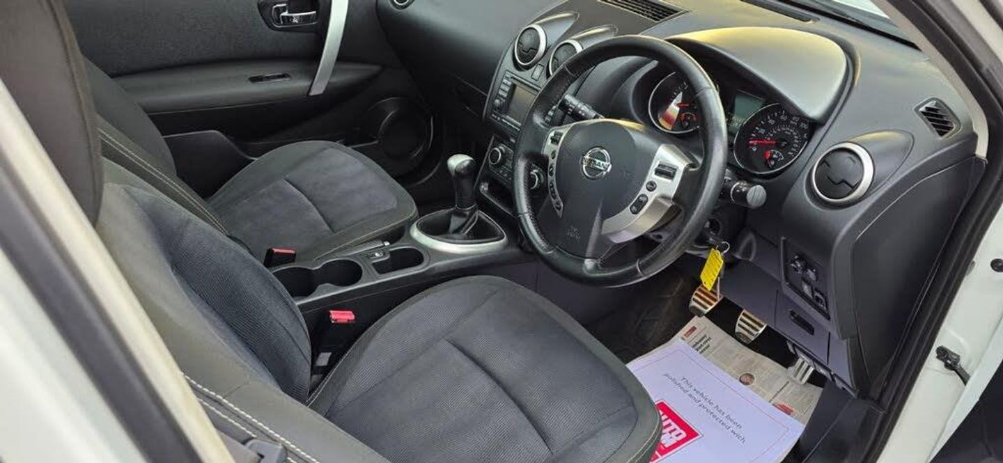 2013 White Nissan Qashqai 1.6 N-tec Plus (Petrol, Manual) - ONLY 4995 - , White colour, 1.6 petrol manual, 18 alloy wheels, panoramic glass roof, rear privacy glass, roof rails, 5 touch screen SAT NAV system, electronically adjusted folding and heated door mirrors, rear view camera with intelligent 360 around view monitor, rear parking sensors, front and rear electric windows, dual zone climate control, brake assist, cruise control and speed limiter, automatic lighting system, auto rain sensing wipers, bluetooth hands free system, CD Radio, AUX, 5 seater, 6 speed manual, half leather interior, leather steering wheel with multifunctions, isofix, remote control locking, 1598cc, 115 bhp, 86000 miles, insurance group 17E, comes with new 12 month MOT, drives great, very clean vehicle, 215 annual tax, ULEZ Compliant. @ FINANCE AVAILABLE @ INDOOR VIEWING AVAILABLE @ WARRANTY. For more information please do not hesitate to contact me on 07471656020 or 01522698880