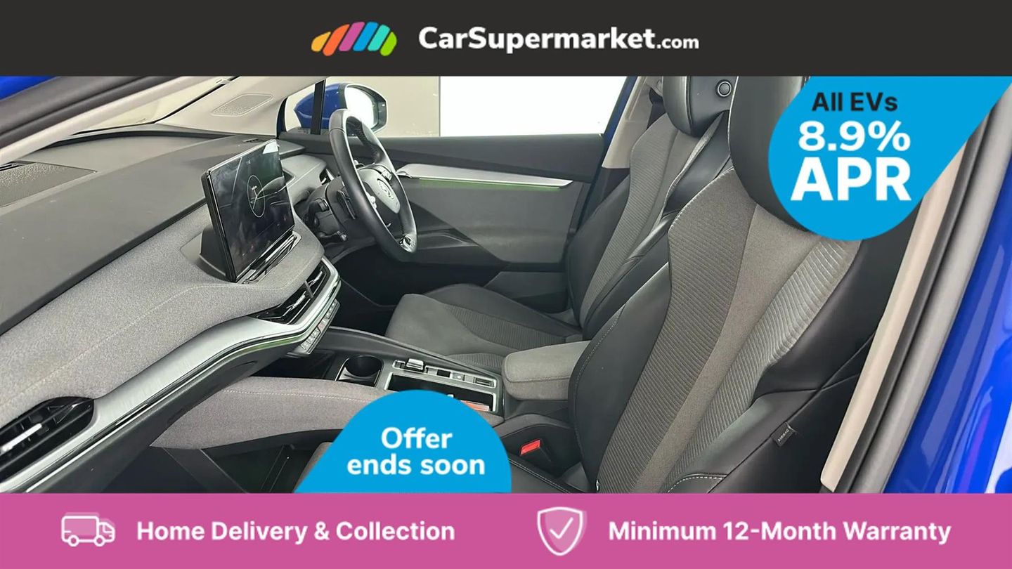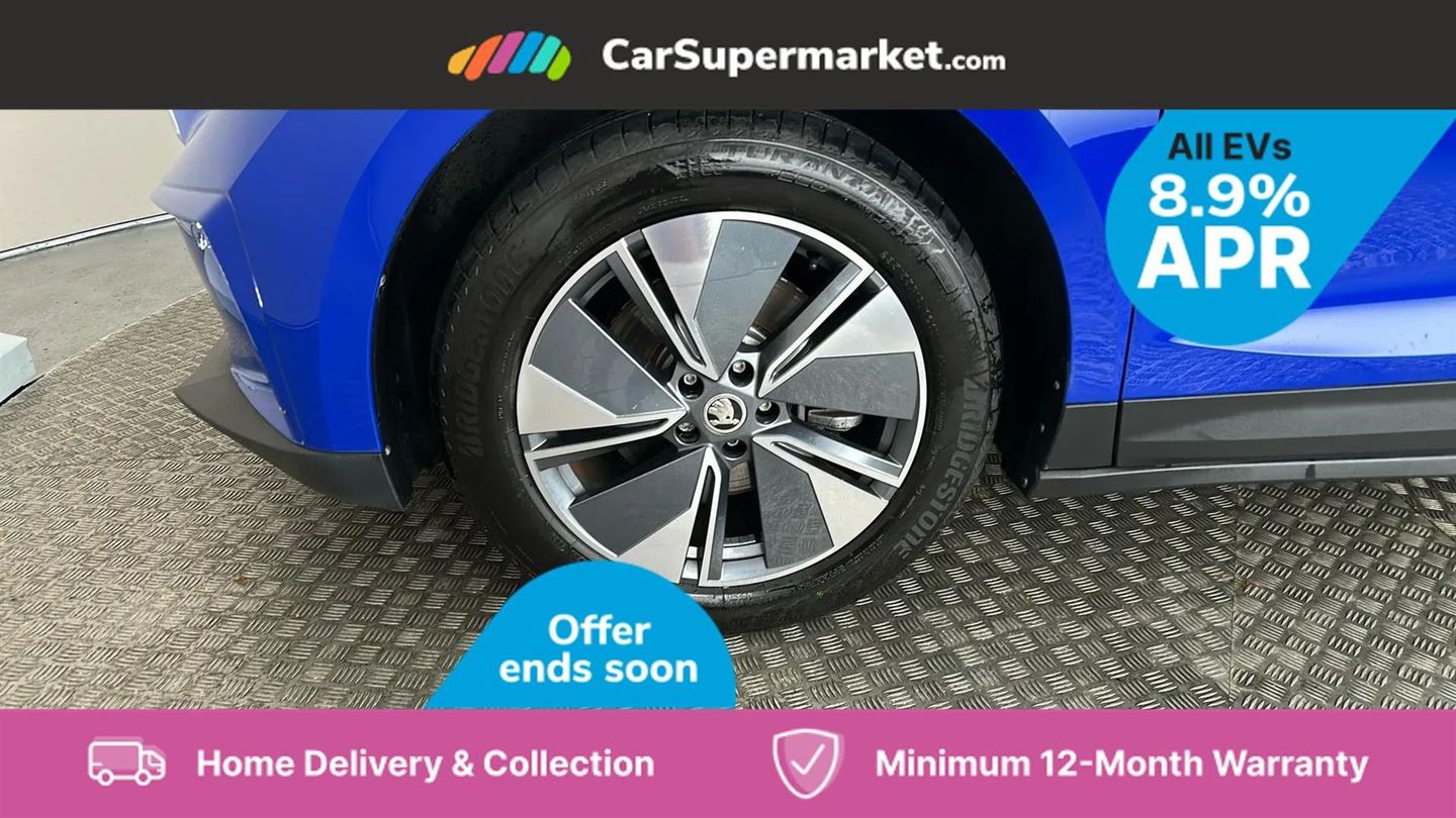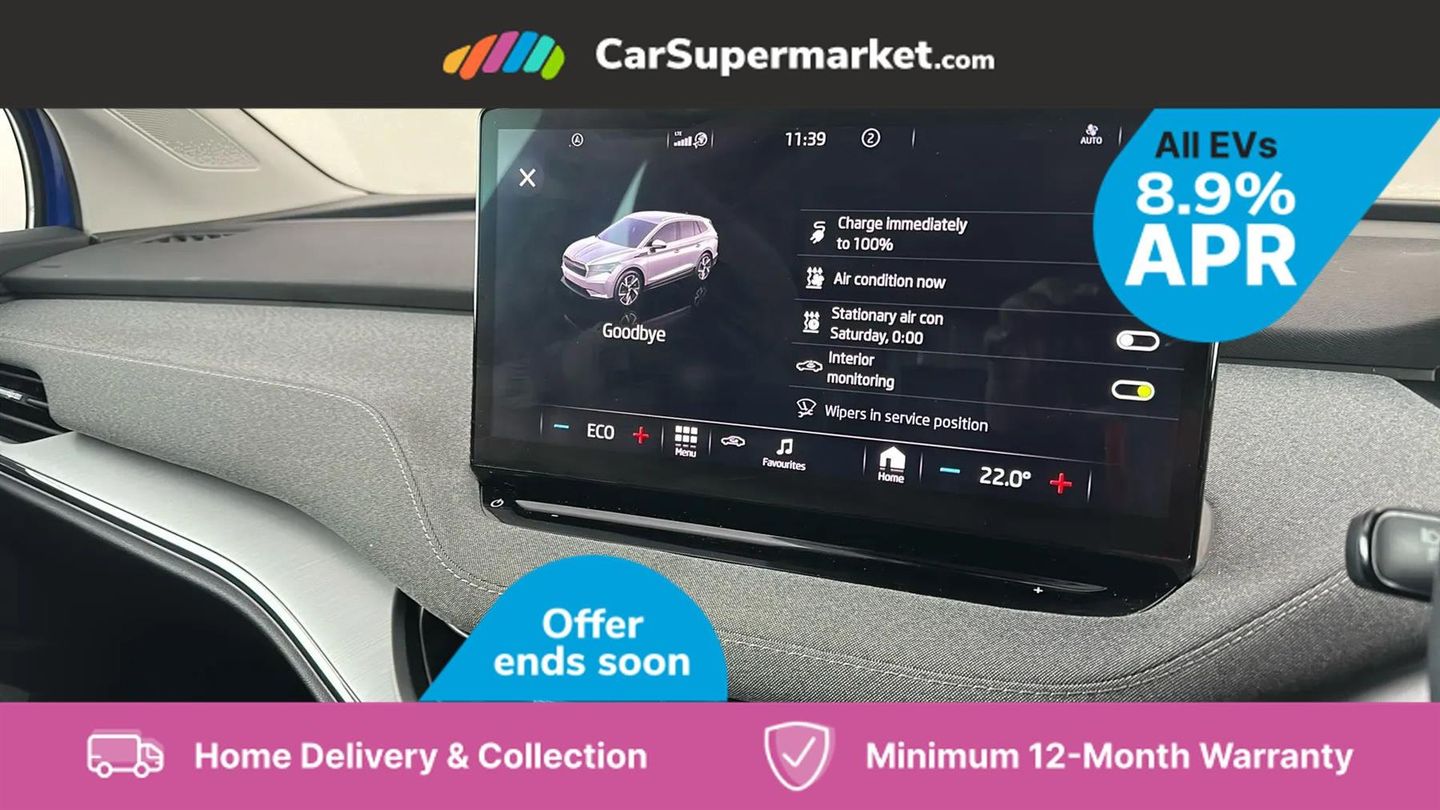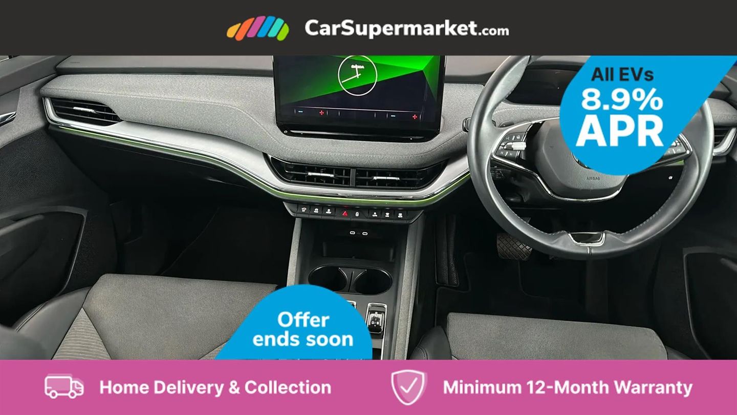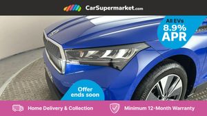 13" touchscreen display,Bluetooth system,Cruise control,E-call,Electronic engine sound,Exterior temperature indicator,Front and rear parking sensors,Gesture control,Lane assist,Power assist steering,Rear view camera,Satellite navigation system,Skoda Connect iV remote services with charging, air conditioning and smart schedules,Speed limiter,Tailgate,Tailgate unlocking from outside,Virtual cockpit,Voice control system,Washer fluid level indicator,Wi-Fi hotspot,Wireless smartlink,135 kW DC charging,6m mode 3 cable (32A),8 Speakers,DAB Digital radio,USB-C ports (charging + data),Auto dimming rear view mirror,Body colour bumpers,Body colour door mirrors and handles,Chrome roof rails,Chrome side window surrounds,Dashboard and door moulding light in multiple colours,Electric adjustable heated folding door mirrors with boarding spots and welcome logo,Electric front and rear windows,Heat insulating darkened glass in side and rear windows,Heat insulating glass in windshield,Heated rear window,LED headlights with LED daytime running lights and headlight range control,LED rear lights,LED third brake light,Light assistant (coming home/tunnel light),Radiator grille frame in matt black with chrome strip,Rain and light sensors,Rear side wing doors,Rear spoiler,Rear window wiper with washer system and intermittent control,Safety reflectors on front and rear doors,Variable front intermittent wipers,12V socket in boot,2-spoke black leather multifunction steering wheel with black stitching,3 rear headrests,3 seat bench in 2nd row,4 foldable roof handles with rear coat hooks,60:40 foldable rear seat with sliding adjustment and backrest angle adjustment,Boot lighting,Coat hooks on B pillar,Dual zone climate control,Front and rear footwell lighting,Front and rear height adjustable headrests,Front centre armrest,Front courtesy lights,Front headrests,Front reading lights,Front seat manual lumbar support for driver,Height adjustable drivers seat,Height adjustable front passenger seat,High centre console,Illuminated and cooled glovebox,Interior door handle lighting in front and rear,Isofix child seat fittings in outer rear seats with top tether,Isofix child seat preparation for front passenger seat,Laminated soft-touch plastic knee rest,LED ambient lighting,Manual lumbar support for front passenger seat,Manually adjustable steering column,Pollen filter,Rear reading lights,Single front passenger seat,Sliding boot cover,Sunvisors with illuminated vanity mirrors,Umbrella in door panel,ECO Suite design pack - Enyaq,3 point height adj front seatbelts + pretensioners,Auto door release and activation of warning lights in the event of an accident,Central interaction airbag,Child safety lock,Driver and front passenger airbags,ESC (incl. ABS+MSR+ASR+EDS+HBA+DSR+RBS+MKB),Front and rear three point safety belt on all seats,Front assist with assisted automatic braking,Front disc brakes,Front passenger airbag deactivation switch,Front side airbags with curtain airbags,Rear drum brakes,Single tone horn,Tyre pressure monitor,Visual and acoustic seat belt reminder,Warning lights in front doors,Anti theft alarm system with interior monitoring, backup horn and towing protection,Keyless start/stop,Remote central locking with SAFE system,Anti-theft wheel bolts protection,Tyre repair kit with compressor