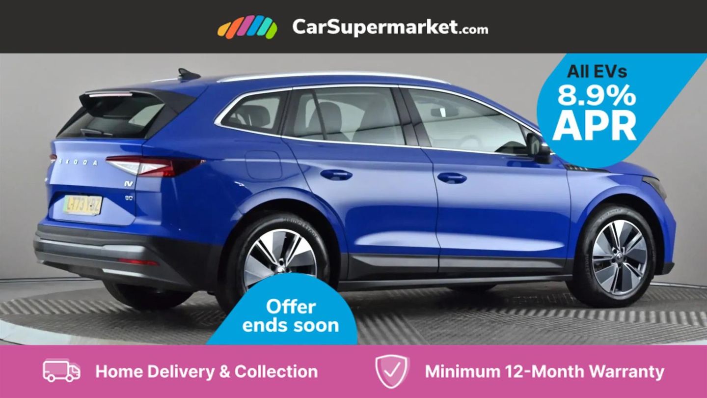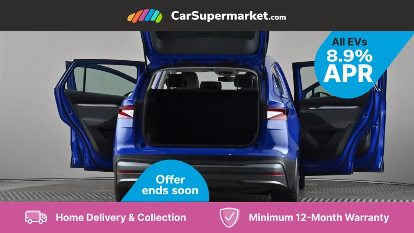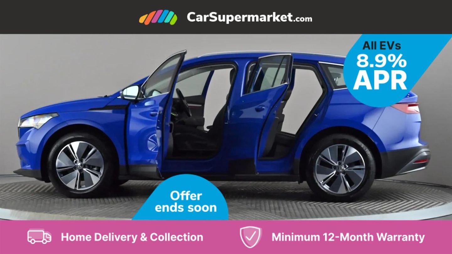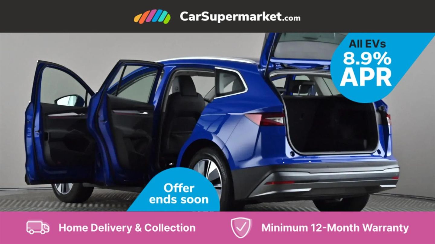 13" touchscreen display,Bluetooth system,Cruise control,E-call,Electronic engine sound,Exterior temperature indicator,Front and rear parking sensors,Gesture control,Lane assist,Power assist steering,Rear view camera,Satellite navigation system,Skoda Connect iV remote services with charging, air conditioning and smart schedules,Speed limiter,Tailgate,Tailgate unlocking from outside,Virtual cockpit,Voice control system,Washer fluid level indicator,Wi-Fi hotspot,Wireless smartlink,135 kW DC charging,6m mode 3 cable (32A),8 Speakers,DAB Digital radio,USB-C ports (charging + data),Auto dimming rear view mirror,Body colour bumpers,Body colour door mirrors and handles,Chrome roof rails,Chrome side window surrounds,Dashboard and door moulding light in multiple colours,Electric adjustable heated folding door mirrors with boarding spots and welcome logo,Electric front and rear windows,Heat insulating darkened glass in side and rear windows,Heat insulating glass in windshield,Heated rear window,LED headlights with LED daytime running lights and headlight range control,LED rear lights,LED third brake light,Light assistant (coming home/tunnel light),Radiator grille frame in matt black with chrome strip,Rain and light sensors,Rear side wing doors,Rear spoiler,Rear window wiper with washer system and intermittent control,Safety reflectors on front and rear doors,Variable front intermittent wipers,12V socket in boot,2-spoke black leather multifunction steering wheel with black stitching,3 rear headrests,3 seat bench in 2nd row,4 foldable roof handles with rear coat hooks,60:40 foldable rear seat with sliding adjustment and backrest angle adjustment,Boot lighting,Coat hooks on B pillar,Dual zone climate control,Front and rear footwell lighting,Front and rear height adjustable headrests,Front centre armrest,Front courtesy lights,Front headrests,Front reading lights,Front seat manual lumbar support for driver,Height adjustable drivers seat,Height adjustable front passenger seat,High centre console,Illuminated and cooled glovebox,Interior door handle lighting in front and rear,Isofix child seat fittings in outer rear seats with top tether,Isofix child seat preparation for front passenger seat,Laminated soft-touch plastic knee rest,LED ambient lighting,Manual lumbar support for front passenger seat,Manually adjustable steering column,Pollen filter,Rear reading lights,Single front passenger seat,Sliding boot cover,Sunvisors with illuminated vanity mirrors,Umbrella in door panel,ECO Suite design pack - Enyaq,3 point height adj front seatbelts + pretensioners,Auto door release and activation of warning lights in the event of an accident,Central interaction airbag,Child safety lock,Driver and front passenger airbags,ESC (incl. ABS+MSR+ASR+EDS+HBA+DSR+RBS+MKB),Front and rear three point safety belt on all seats,Front assist with assisted automatic braking,Front disc brakes,Front passenger airbag deactivation switch,Front side airbags with curtain airbags,Rear drum brakes,Single tone horn,Tyre pressure monitor,Visual and acoustic seat belt reminder,Warning lights in front doors,Anti theft alarm system with interior monitoring, backup horn and towing protection,Keyless start/stop,Remote central locking with SAFE system,Anti-theft wheel bolts protection,Tyre repair kit with compressor