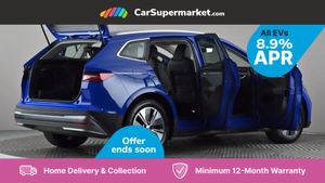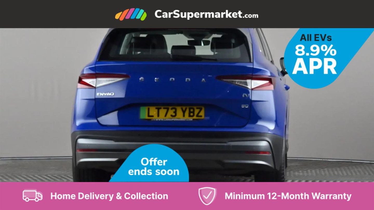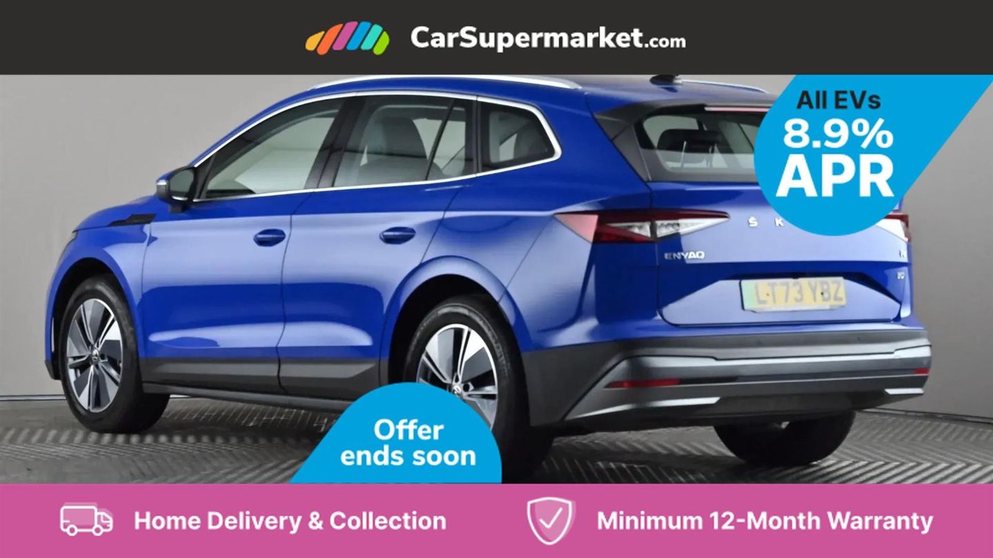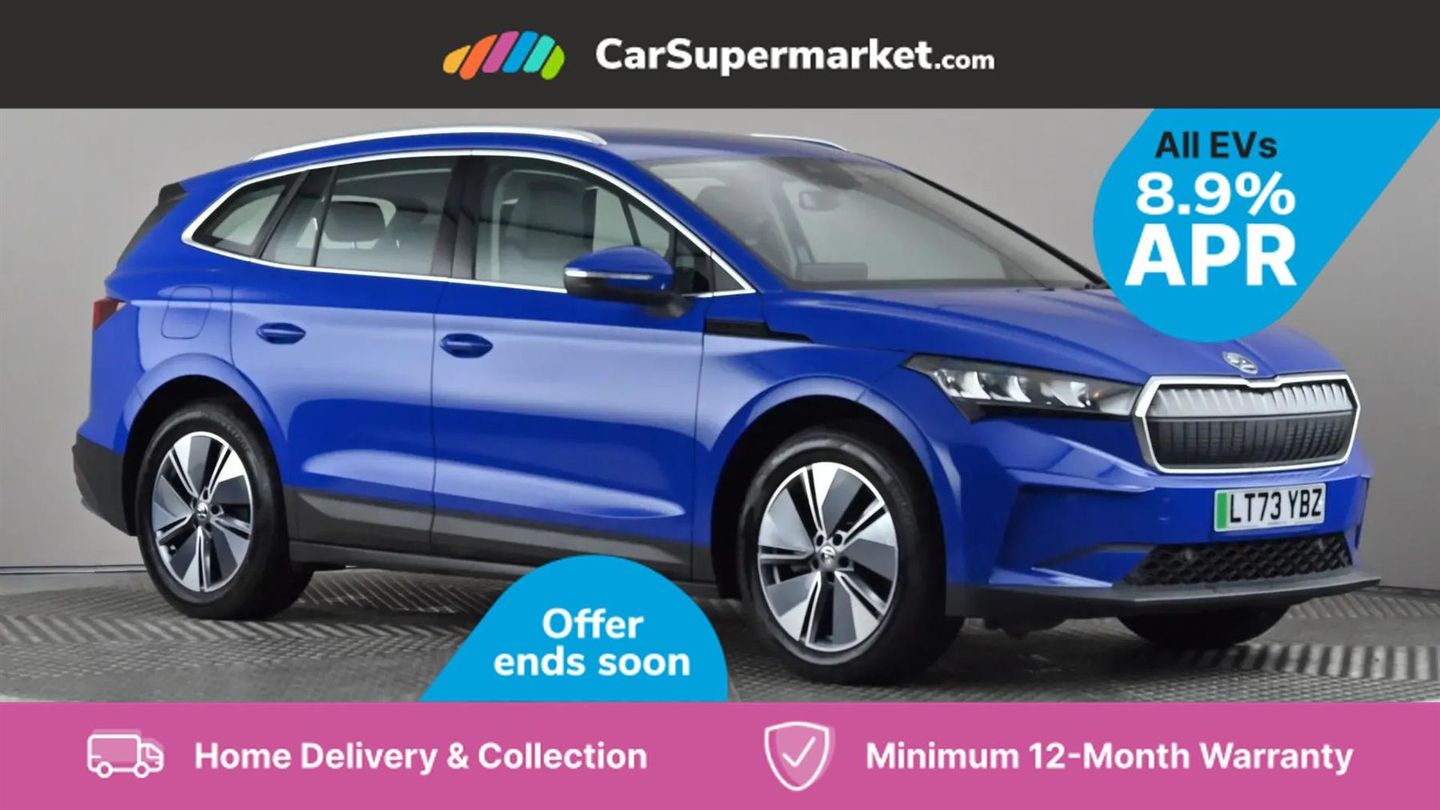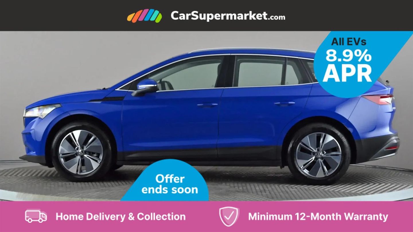 13" touchscreen display,Bluetooth system,Cruise control,E-call,Electronic engine sound,Exterior temperature indicator,Front and rear parking sensors,Gesture control,Lane assist,Power assist steering,Rear view camera,Satellite navigation system,Skoda Connect iV remote services with charging, air conditioning and smart schedules,Speed limiter,Tailgate,Tailgate unlocking from outside,Virtual cockpit,Voice control system,Washer fluid level indicator,Wi-Fi hotspot,Wireless smartlink,135 kW DC charging,6m mode 3 cable (32A),8 Speakers,DAB Digital radio,USB-C ports (charging + data),Auto dimming rear view mirror,Body colour bumpers,Body colour door mirrors and handles,Chrome roof rails,Chrome side window surrounds,Dashboard and door moulding light in multiple colours,Electric adjustable heated folding door mirrors with boarding spots and welcome logo,Electric front and rear windows,Heat insulating darkened glass in side and rear windows,Heat insulating glass in windshield,Heated rear window,LED headlights with LED daytime running lights and headlight range control,LED rear lights,LED third brake light,Light assistant (coming home/tunnel light),Radiator grille frame in matt black with chrome strip,Rain and light sensors,Rear side wing doors,Rear spoiler,Rear window wiper with washer system and intermittent control,Safety reflectors on front and rear doors,Variable front intermittent wipers,12V socket in boot,2-spoke black leather multifunction steering wheel with black stitching,3 rear headrests,3 seat bench in 2nd row,4 foldable roof handles with rear coat hooks,60:40 foldable rear seat with sliding adjustment and backrest angle adjustment,Boot lighting,Coat hooks on B pillar,Dual zone climate control,Front and rear footwell lighting,Front and rear height adjustable headrests,Front centre armrest,Front courtesy lights,Front headrests,Front reading lights,Front seat manual lumbar support for driver,Height adjustable drivers seat,Height adjustable front passenger seat,High centre console,Illuminated and cooled glovebox,Interior door handle lighting in front and rear,Isofix child seat fittings in outer rear seats with top tether,Isofix child seat preparation for front passenger seat,Laminated soft-touch plastic knee rest,LED ambient lighting,Manual lumbar support for front passenger seat,Manually adjustable steering column,Pollen filter,Rear reading lights,Single front passenger seat,Sliding boot cover,Sunvisors with illuminated vanity mirrors,Umbrella in door panel,ECO Suite design pack - Enyaq,3 point height adj front seatbelts + pretensioners,Auto door release and activation of warning lights in the event of an accident,Central interaction airbag,Child safety lock,Driver and front passenger airbags,ESC (incl. ABS+MSR+ASR+EDS+HBA+DSR+RBS+MKB),Front and rear three point safety belt on all seats,Front assist with assisted automatic braking,Front disc brakes,Front passenger airbag deactivation switch,Front side airbags with curtain airbags,Rear drum brakes,Single tone horn,Tyre pressure monitor,Visual and acoustic seat belt reminder,Warning lights in front doors,Anti theft alarm system with interior monitoring, backup horn and towing protection,Keyless start/stop,Remote central locking with SAFE system,Anti-theft wheel bolts protection,Tyre repair kit with compressor