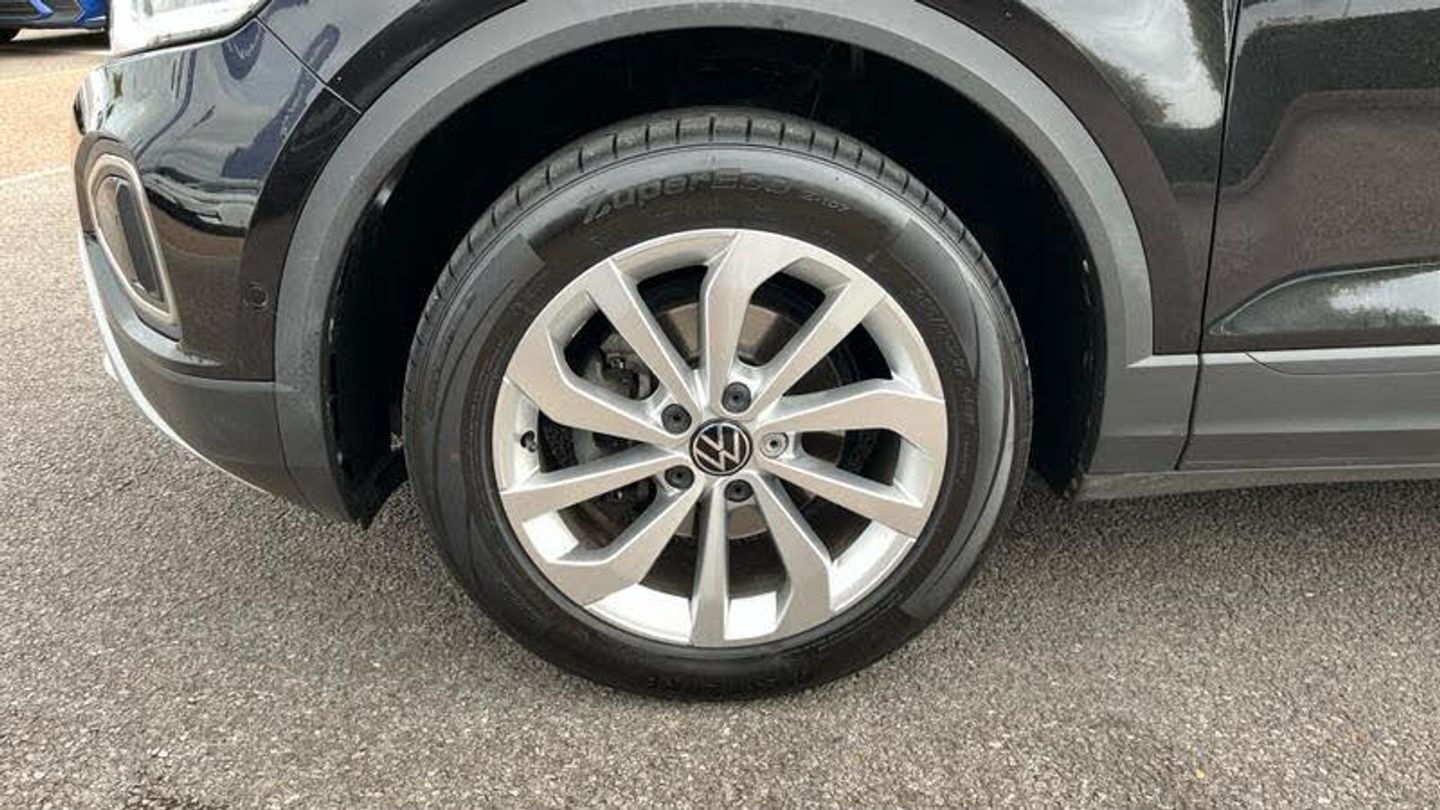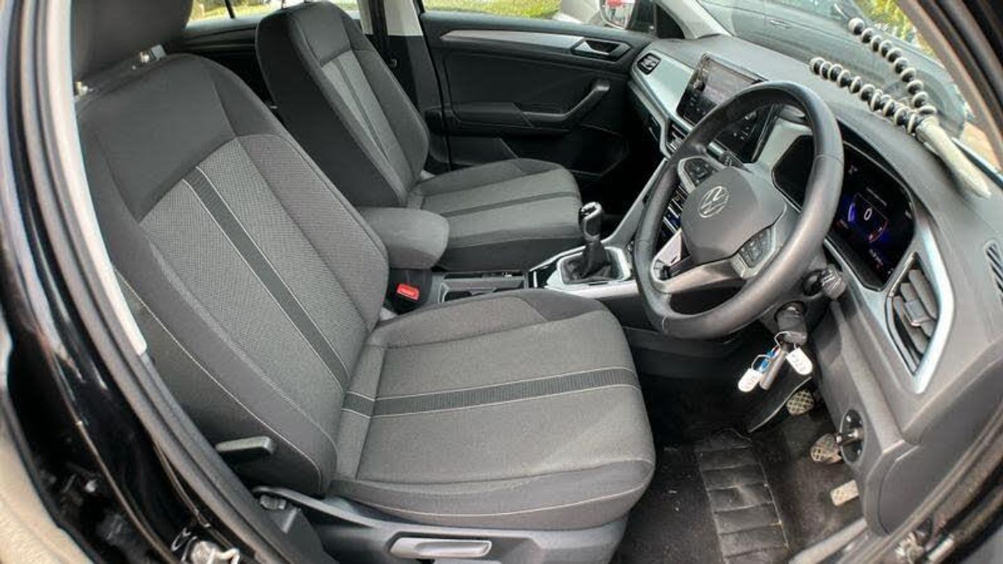 Winter pack - T-Roc, Pearl - Deep black, Cloth - Titanium Black - Ceramique, 17 Johannesburg alloy wheels with low rolling resistance and anti-theft wheel bolts, Front windscreen wiper with intermittent wipe and 4 position delay, Heated rear window, Rear wash/wipe with intermittent wipe setting, Rear shock absorption chassis with increased ride height, Black roof rails, Body coloured exterior mirror housings and door handles, Extended roof spoiler, External USB type C socket and charging sockets, Rear side wing doors, 3rd brake light, Automatic hazard lights activation under emergency braking, Automatic headlight control with LED separate daytime running lights with coming/leaving home function, LED rear number plate lights, LED tail lamp rear comination lamps, ABS, Electronic parking brake, Electronic Stability Control (ESC) inc EDL (Electronic Differential Lock) and ASR (Traction Control), Front assist with city emergency braking and pedestrian monitoring, Front disc brakes, Rear disc brakes, Volkswagen roadside assistance, Driver alert system with fatigue detection, Modified key software - reduce switch off time for key status change to Long no motion, Park assist including front and rear parking sensors, Power assisted speed sensitive steering, Auto dimming interior rear view mirror, Exterior mirrors aspherical on driver side, convex on front passenger side, Remote electrically foldable door mirrors, puddle lights and reverse activated passenger's door mirror, 3 point height adj front seatbelts + pretensioners, 3 point seatbelts in outer rear with ECE label, Child locks on rear doors, Driver and front passenger safety-optimised head restraints, Drivers seatbelt reminder, Front and rear passengers curtain airbag system including front side airbags, Front seat side impact airbags, Single tone horn, Online services, Wireless app connect, DAB Digital radio, Front and rear 6 speakers, Music playback - MP3, WMA and AAC files, Premium USB cable in choice of either Apple or Android smartphone compatibility, SD card slot, Simultaneous pairing of 2 compatible mobile devices, Title and cover art display, We Connect and We Connect Plus functionality, Tailgate/trunk lid release from outside, Driver tips and journey analysis, Emergency call service, Service interval indicator, Think blue trainer driver tips and journey analysis, Warning sound and light for front seatbelts unfastened, Battery regeneration during braking, Start/stop function with battery regeneration, Pewter matt decorative inserts for intrument panel, centre console and door panels at the front, 3 seat bench in 2nd row, Driver/front passenger seat height adjustment, Front comfort sports seats, Lumbar support for driver's and front passengers seat, Single front passenger seat, Air care climatronic air conditoning system with active combination filter and 2-zone temperature control, 12V power socket in centre console, 4 load lashing points in luggage compartment, Cloth upholstery, Door and side trim panel in cloth, Drawer under drivers seat, Front cupholders x 2, Load-through provision with cup holder when folded down ('Unsplit rear seat bench, split folding backrest, with centre armrest), Storage compartment in left and right luggage ar, [Audio and Communications]Bluetooth mobile phone interface, [Drivers Assistance]Rear View Camera, Rear view camera, Tyre pressure loss indicator, [Exterior]17in Alloy Wheels - Johannesburg, Power windows with comfort operation and circuit breaker, Body coloured bumpers and radiator grille with chrome trim and front fog lamps with chrome bezel, Rear exhaust tailpipe, Rear fog light on one side and reversing lights on both sides, [Illumination]LED Headlights, LED rear combination lamps, [Interior]Winter Pack, Rain sensor, Diversity antenna for FM reception, 3 rear head restraints, Non-folding front passenger seat backrest, Front centre armrest, Leather gearshift handle, [Performance]Front shock absorption, [Safety and Security]Hill start a