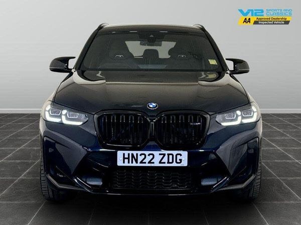 Additional Storage Compartment, Alarm System - Thatcham 1 with Remote Control and Electronic Engine Immobiliser, Armrest - Front - Fixed with Storage Compartment, BMW Mobility System, Battery Safety Cut Off, Bottle Holders Integrated into Door Trim Storage Compartments - Front - up to 1 litre - Rear - Up to 750ml, Brake Pad Wear Indicator - Front and Rear, Bumper System Front and Rear - Replaceable Deformation Elements for Impacts Up to 9mph, Central Locking Switch for All Doors - Fuel Filler Cap - Luggage Compartment, Check Control Warning System for Monitoring of Lights and Door-Luggage Compartment Open Warning, Child Proof Locking System - Rear Doors, Child Seat ISOFIX Attachment - Rear, Condition Based Service, Digital Cockpit, Direction Indicator - Side Repeaters - Integrated in Exterior Mirrors, Door Sill Finishers - Front - High-Gloss Black Front with X3M Competition Designation, Dynamic Brake Lights, Electric Windows - Front and Rear with Open-Close Fingertip Control - Anti-Trap Facility and Comfort Closing Function, Exterior Air Inlets - Mirror Caps and Air Breather in High Gloss Black, Exterior B Pillar - Black, First Aid Kit and Warning Triangle, Grab Handles - Integrated in Roof Linings - Four, Head-Up Display, Heat Protection Glazing with Green Tint, Incorrect Fuelling Protection System, Interior Lighting - Front Centre Over Interior Mirror with Soft-Light - Rear Centre and Front and Rear Footwell, LED Tailights, Lights-On Warning by Audio Warning Signal When Ignition is Switched Off, Luggage Compartment Storage, M Competition Bodystyling, M Double Slats Kidney Grille in High Gloss Black with Black Slats, M Exhaust Tailpipes - Quad - Round - Split Left and Right with High Gloss Black Finisher, M Gear Knob, OBC - On Board Computer, Oil Sensor For Level and Grade - Warning by Check Control System, Passive Protection for Pedestrians, Performance Control, Personal Profile, Rain Sensor with Automatic Headlight Activation, Rear Seat Headrests - Three, Remote Control Including Integrated Key - 2, Shark Fin - Antenna, Start-Stop Button with Comfort Go Keyless Engine Start and Auto Start-Stop Deactivation Button, Storage Compartment - Rear Centre Console and Front-Rear Door Trim, TPMS - Tyre Pressure Monitoring System, Tailgate Operation - Automatic, Three-Point Seat Belts - All Seats, Twin Horns, Visible VIN, Welcome Light, Windscreen Wipers with Adjustable Intervals, iDrive Controller - 8 Favourite Buttons, [Audio and Communications]12V Power Socket in Front Centre Console, BMW Connected Package Professional, BMW ConnectedDrive Online Services, BMW Emergency Call, BMW TeleServices, DAB Tuner, Loudspeaker System - Harman Kardon, [Drivers Assistance]Attentiveness Assistant, Cruise Control with Brake and Speed Limiting Function, PDC - Park Distance Control - Front and Rear, Parking Assistant, Reversing Assist Camera, [Exterior]21in Alloy Wheels - M Double Spoke - Bi-Colour - Jet Black, Acoustic Glazing, BMW Individual Lights - Shadowline, Exterior Mirrors - Electrically Folding with Anti Dazzle, Exterior Parts in Body Colour, Exterior Trim - High-Gloss Shadowline, M Sport Exhaust System, Roof Rails - Shadowline High-Gloss Black, Sun Protection Glass, Windscreen Washer Jets - Heated, [Illumination]BMW Icon Adaptive LED Headlights, High Level Third Brake Light Using LED Technology, High-Beam Assistant, [Interior]Air Conditioning - Automatic, Ambient Lighting, Armrest - Rear Centre with Two Cupholders, BMW Gesture Control, BMW Live Cockpit Professional, Cup Holders - Front - Two, Electric Front Seat Adjustment with Memory, Floor Mats - Velour, Front M Sport Seats, Headlining - Anthracite, Interior Trim - Carbon Fibre, Luggage Compartment - Light, Lumbar Support - Driver and Front Passenger, M Leather Steering Wheel, Rear-View Electrochromatic Mirror - Automatically Dimming, Seat Backrest Adjustment - Rear Seats, Seat Heating - Front and Rear, Sensatec Dashboard, Side Armrests - Front and Rear Integrated into Door Trim, Split F