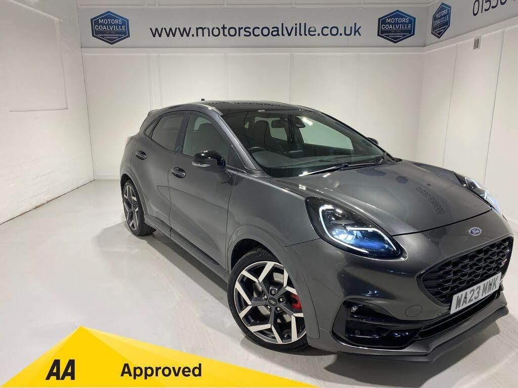 2023 23 Reg Ford Puma 1.5 EcoBoost (200PS) ST 6 spd Manual 5dr. Magnetic Grey metallic with Ford Performance Part LEATHER/ALCANTARA interior, Front and Rear Parking Sensors, 19 inch alloy wheels, ST BODY KIT with LARGE REAR SPOILER, SYNC 3 DAB SATELLITE NAVIGATION, B&O sound system, LED headlights, selectable drive modes- Normal, Eco, Sport, Slippery & Trail, drivers & passenger seat lumbar & heights adjust, FORD MEGABOX EXTENDED BOOT SPACE, EATC AIR CON, KEYLESS entry and start with FORD power start button, PRIVACY GLASS, power folding door mirrors, Drivers Assistance features to include traffic sign recognition, auto high beam & driver alert, auto light and rain sensing wipers, centre console with arm rest, tyre pressure monitoring system, Thatcham alarm, NCAP Pack (lane-keeping alert & lane-keeping aid, speed limiter, rear seat belt minder, rear centre head restraint & auto-headlamps), front fog lamps with cornering lights, heated front screen, remote central locking, electric front windows, ESP, Hill start assist, trip computer, ambient lighting, 13,302 miles (WA 23 MWK).