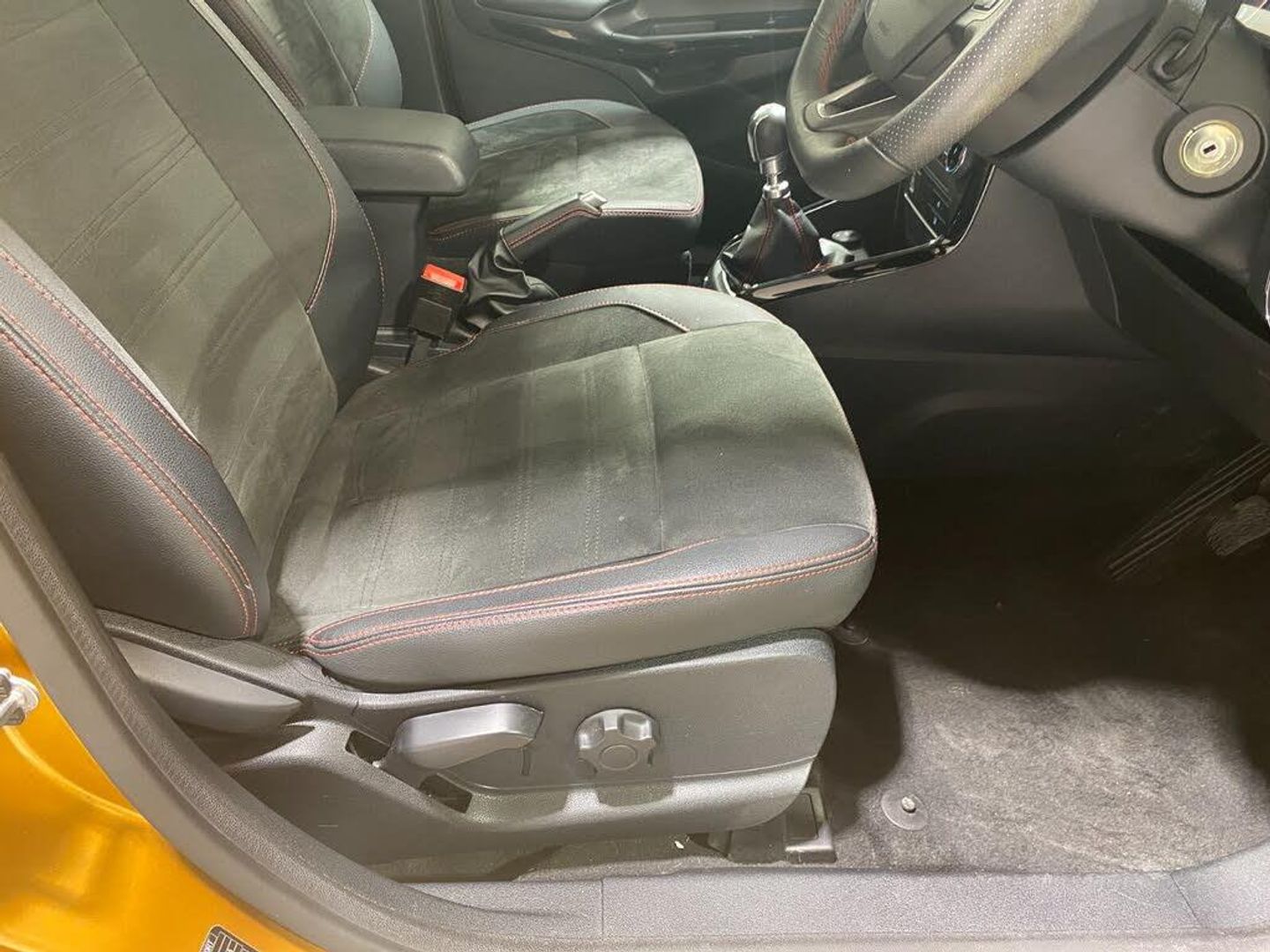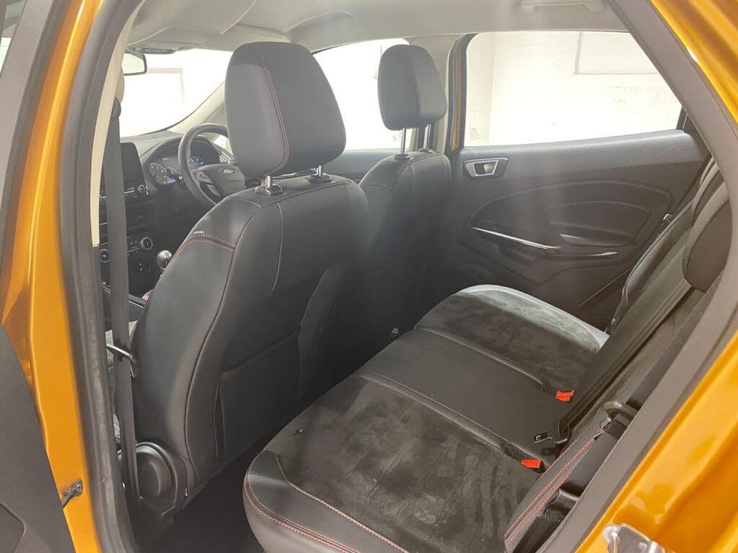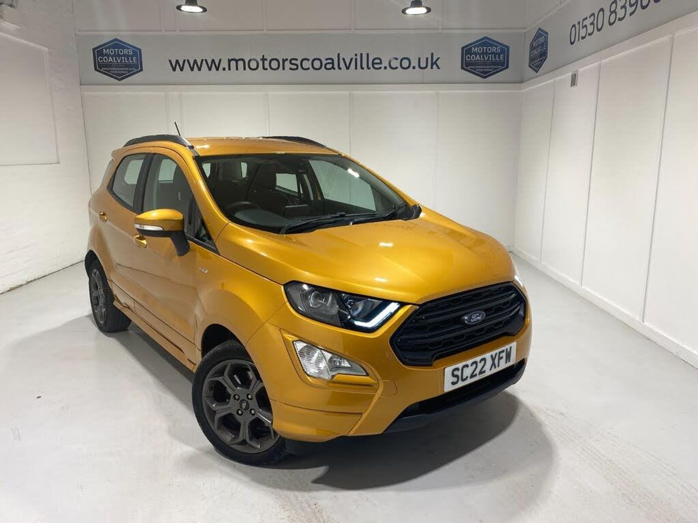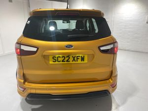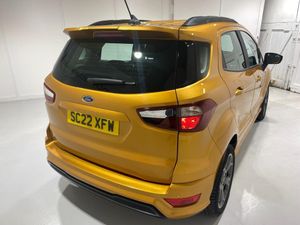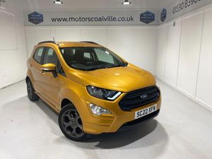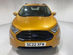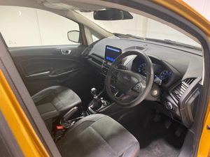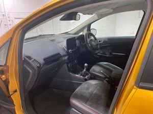 2022 22 Reg EcoSport 1.0 Turbo Ecoboost (125PS) 6 spd ST-LINE 5dr. Luxe Yellow metallic, Ebony part LEATHER interior, WINTER PACK with HEATED FRONT SEATS and HEATED STEERING WHEEL, SYNC 3 DAB SATELLITE NAVIGATION with 8 inch touch screen with REAR VIEW CAMERA, REAR PARKING SENSORS, Bluetooth USB, Apple CarPlay, Android Auto, 17 inch alloys, tyre pressure monitoring system, Thatcham alarm, front fog lamps with cornering lights, heated front screen, remote central locking, electric front windows, ESP, Hill start assist, trip computer, ambient lighting, 24,640 miles (SC 22 XFW).