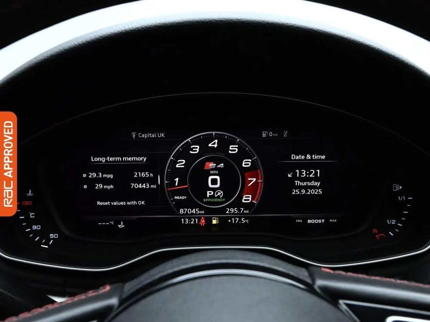 19in Alloy Wheels - 10-V Spoke Design,Aluminium-Effect Door Mirror Housings,Anti Theft Locking Wheel Bolts,Brake Calipers Painted in Black with S4 Logo at the Front,Door Handles with Chrome Trim,Door Mirrors - Electrically Adjustable and Heated with Built-in LED Indicators,Electric Windows - Front and Rear,High Gloss Package,Key with S4 Logo,Rear Spoiler,S Radiator Grille in Twilight Grey Matt with Dual Struts in Aluminium and S4 Logo,S Rear Diffuser in Twilight Grey - Matt and Honeycomb Grille in Black,S Specific Air Inlets in Titan Black with Chrome Inlays in Unique S Design,S Specific Dual-Branch Chrome Tailpipes with Twin Oval Pipes Each on Left and Right,Space Saver Spare Wheel,Windscreen with Acoustic Glazing,4-Way Electric Lumbar Support,Auto-Dimming Rear-View Mirror,Cloth Headlining in Black,Deluxe 3-Zone Electronic Climate Control,Electric Boot Lid Release,Electrically Adjustable Front Seats,Extended Interior Upholstery Pack,Flat Bottomed 3-Spoke Leather High Multi-Function Steering Wheel,Front Centre Armrest,Gear-lever Knob in Black Leather,Gear-lever with Diamond S Badge,Heated Front Seats,Illuminated Door Sill Trims with S Logo,Inlays - Matt Brushed Aluminium,Keyless Go,LED Interior Light Package,Pedals and Footrest - Stainless Steel,S Instrument Dials,Split-Folding Rear Seat Bench in 3 Parts - 40-20-40 with Rear Centre Armrest,Sun Visors - with Vanity Mirror,Tool Kit and Car Jack,6-Airbag System,Anti-Theft Alarm,ESC - Electronic Stabilisation Control inc ABS - ASR and EDL,First Aid Kit and Warning Triangle,ISOFIX Child Seat Mounting and Top Tether,Multi Collision Brake Assist,Parking System Plus,Pop-Up Bonnet for Pedestrian Protection,Pre-Sense City,Remote Central Locking,Seat Belt Monitoring,Audi Beam - Exterior Puddle Lighting with Audi Rings Logo,High-Beam Assist,LED Headlights with LED Rear Lights and Dynamic Rear Indicators,Light and Rain Sensor,Audi Connect (3 Year Subscription From New),Audi Connect Safety and Service - e-call,Audi Smartphone Interface,Audi Sound System,Bluetooth Interface,CD Drive,DAB Digital Radio,Driver Information System - 7in Colour Display,MMI Navigation Plus with 8.3in High Resolution Colour Screen,Towbar Preparation,Two USB Charging Ports,Audi Drive Select,Cruise Control System with Freewheeling Capability and Speed Limiter,MMI Touch Control Panel,Tyre Pressure Warning Light,Voice Control,Electromechanical Power Steering,S Model Enhanced Braking System,S Sport Suspension