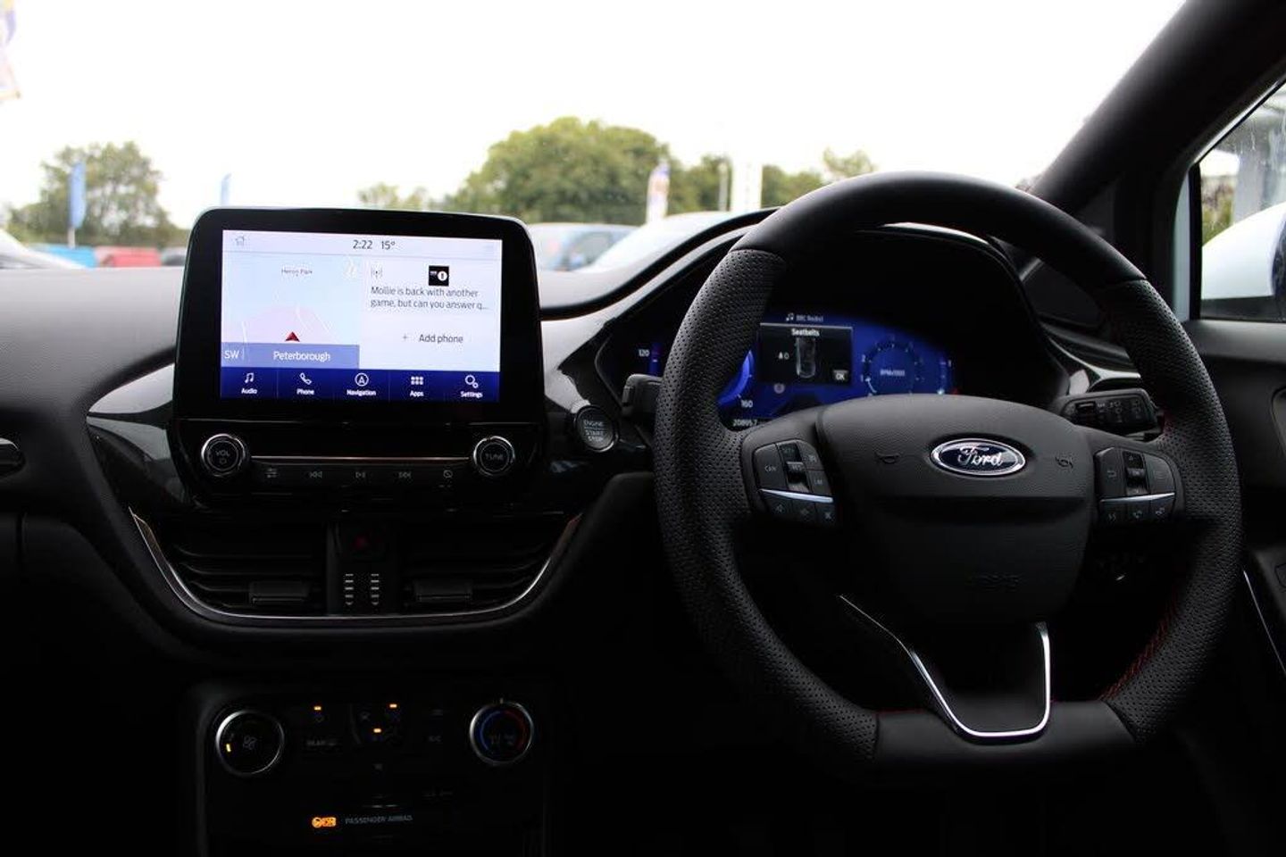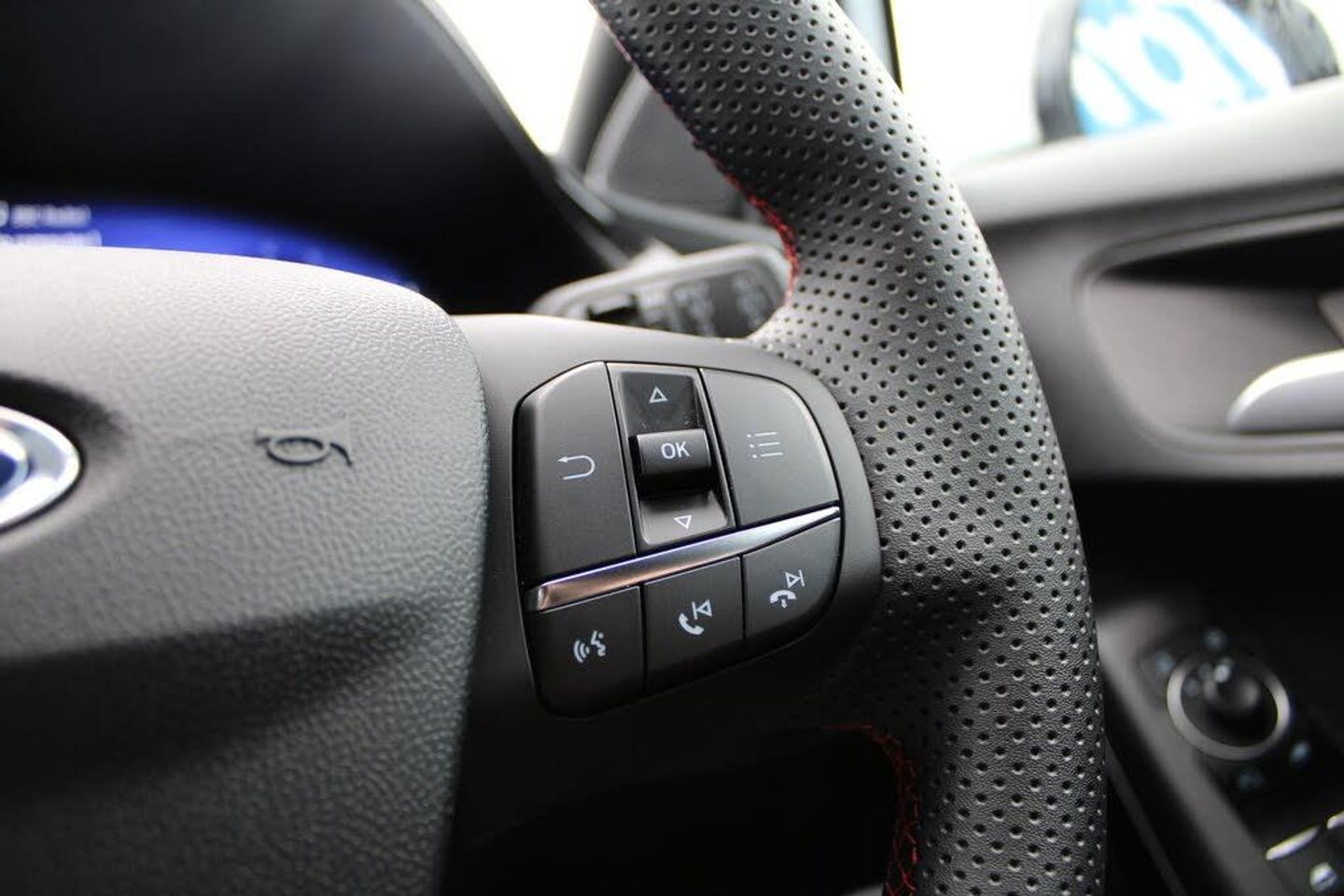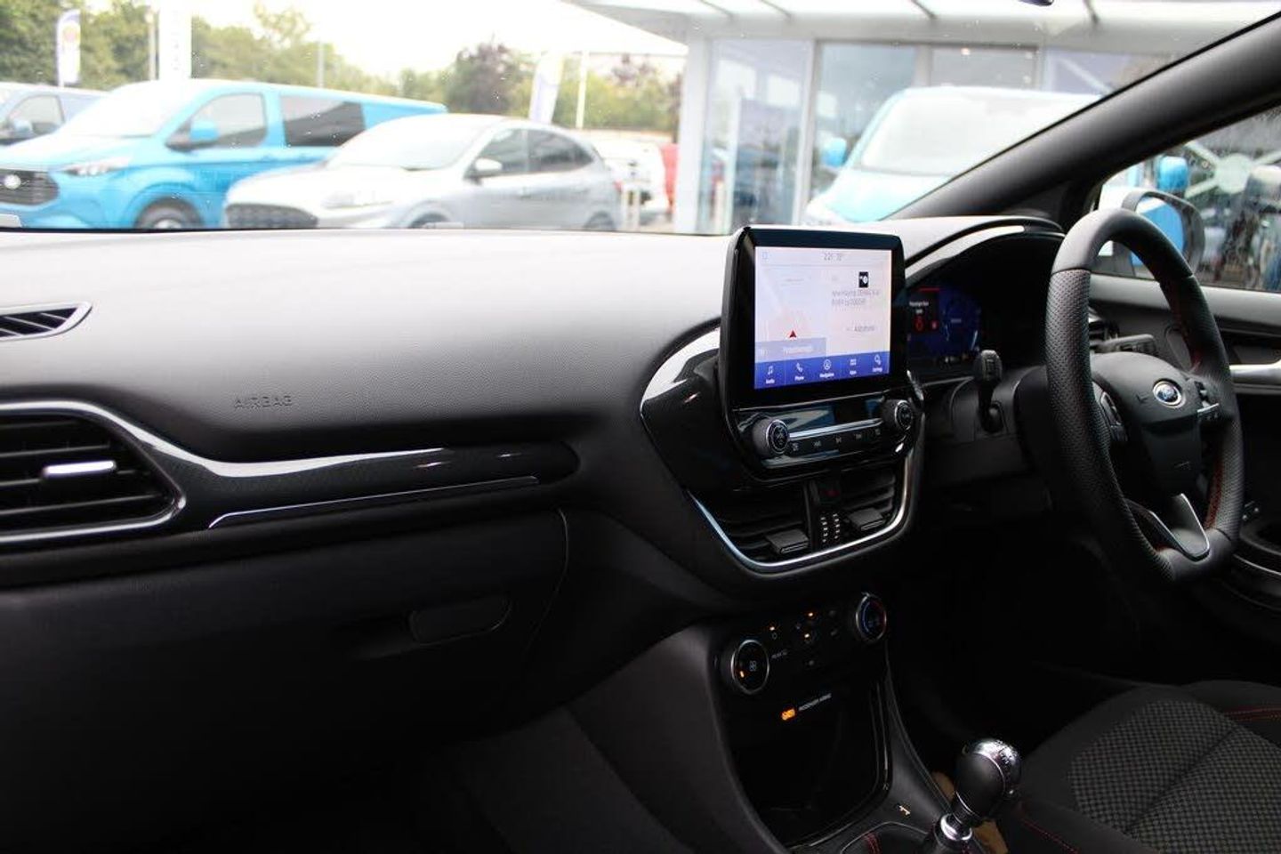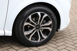 Driver impairment monitor, Emergency call service, Ford easy fuel, Full digital 12.3" instrument cluster, Lane keeping aid with lane departure warning, Power assist steering, Power start button, Rear parking sensor, Selectable drive modes(Normal, sport, Eco, trail, slippery), Speed sign recognition, Automatic headlights with auto high beam, Automatic rain sensing wipers, LED rear lamps, Power foldable heated door mirrors with puddle lamps, Projector headlamps with LED day time running lights and front fog lamps, Quickclear heated windscreen, Rear side wing doors, Rear wiper, ST-Line body styling kit with unique grille, Third brake light, 3 seat bench in 2nd row, Centre console with armrest and stowage, Ford megabox extended bootspace, Front and rear head restraints, Front floor mats, Manual 2 way passenger seat adjustment, Manual 4 way driver seat adjust with lumbar adjustment, Single front passenger seat, ST- Line cloth trim with red stitching, ST-Line flat bottomed sensico leather steering wheel with leather handbrake and aluminium gear knob, Thatcham alarm, Cloth - Black with Red Stitching, Privacy glass