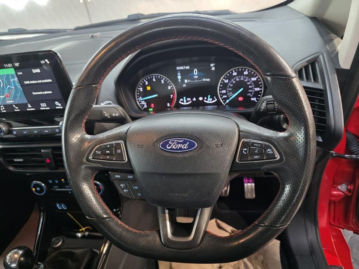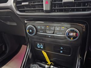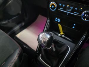 This Ford ST-Line stands out with 17in 5-Spoke Dark Tarnish alloys, ST-Line bumpers and skirts, roof rails, rear spoiler, body-coloured cladding, Quickclear heated windscreen, LED daytime running lights, halogen projector headlights, rear parking sensors, and reversing camera. Sporty touches include sports suspension, stainless steel pedals, red stitching details, and ST-Line threshold plates. Inside, it offers SYNC 3 with navigation, Apple CarPlay/Android Auto, ambient lighting, leather-trimmed steering wheel, gear knob and handbrake, climate control, rain-sensing wipers, and keyless start. Safety is covered with multiple airbags, ABS with stability control, hill launch assist, tyre pressure monitoring, ISOFIX mounts, and Fords Intelligent Protection System.