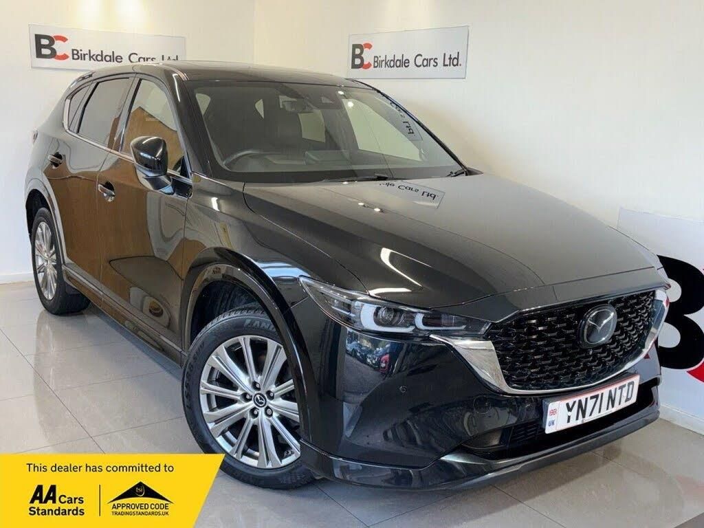 Jet Black Mica, Nappa Leather - Brown, 10.25in TFT Colour Centre Display with Mazda Connect Infotainment, 12V Electrical Power Outlet, 19in Alloy Wheels - Exclusive Bright, 360 Degree View Monitor, 7in Colour TFT Display, ABS - Anti Lock Braking System, Adaptive Cruise Control, Advanced Smart City Brake Support, Apple CarPlay and Android Auto, B-Pillar and C-Pillar Garnish - Gloss Black, Blind Spot Monitoring with Rear Cross Traffic Alert, Body Coloured Door Mirrors, Connected Services, DSC - Dynamic Stability Control, Dashboard Panel - Real Wood Inlay, Digital Radio, Door Panel Trim - Vinyl with Real Wood Inlay, Door Pockets - Driver and Front Passenger, Driver Attention Alert - DAA, Drivers Seat - Power Slide - Recline - Height and Lumbar Adjustment with Memory Function linked to Smart Key, Dual Front Airbags, Dual Zone Climate-Controlled Air-Conditioning with Rear Air Vents, Electric Windows - Front and Rear, Electronic Parking Brake with Auto Hold Function, Emergency Stop Signalling System - ESS, Emergency Tyre Repair Kit, Engine Start-Stop Button, Flat Fit Cargo Board, Frameless Auto Dimming Rear-View Mirror, Front Centre Storage with Two Cupholders, Front Grille Accent - Gloss Black, Front Parking Sensors, Front Passenger Airbag Cut-Off Switch, Front Passengers Seat Power Slide Recline and Height Adjustment, Front Side Airbags, Front Wiper De-Icer, Front and Rear Curtain Airbags, Front and Rear Lower Bumper Mouldings - Full Body Coloured, Gear Shift - Leather-Wrapped, Gear Shift Indicator, Gloss Black Finish Grille, Glovebox with Interior Illumination, Grab Handles - Front Passenger and Two Rear with Coat Hooks, Headlights - Adaptive LED, Headlights - Coming-Leaving Home, Headlights - Dusk-Sensing Lights, Heated Auto Power-Folding Door Mirrors, Heated Front Seats with 3-Stage Settings, Heated Outer Rear Seats, Heated Steering Wheel, Hill Hold Assist, ISOFIX Child Seat Anchorage for Outer Rear Seats, Integrated Bluetooth System, Integrated Mazda Navigation System with 5-Years Free European Map Updates, Interior LED Lighting, Karakuri Tonneau Cover, LED Rear Signature Combination Lights, LED Signature Daytime Running Lights, Lane Keep Assist with Lane Departure Warning System, Large Single Tailpipe - Chrome Tip, Larger Tail Pipe Garnish, Leather-Wrapped with Unique Steering Wheel Stitching and Chrome Centre Bezel, Luggage Compartment - Light, Luggage Compartment - Power Outlet, Multimedia Commander, Power Assisted Steering, Power Liftgate, Premium BOSE Sound System, Privacy Glass - Rear and Rear Side Windows, QI Wireless Mobile Phone Charging, Rain-Sensing Front Wipers with Adjustable Sensitivity and Speed, Rear Parking Sensors, Rear Roof Spoiler - Body Coloured, Rear Seats - Manual Recline Adjustment, Rear Smart City Brake Support, Rear Wiper, Remote Central Locking with Deadlocking and Automatic Door Lock when Driving, Roof Headlining Dark - Ceiling and Pillars, Roof Mounted Sunglasses Holder, Seat - 40-20-40 Karakuri Fold Flat Rear, Seat Ventilation - Driver and Front Passenger, Seatback Pocket - Driver and Front Passenger, Seatbelt Reminder for Front and Rear, Seatbelts - Front - 3 Point - ELR x 2 with Pre-Tensioners, Seatbelts - Rear - 3-Point - ELR, Seats - Driver Electric 8-Way Power Adjustment with Memory, Seats - Drivers Power Lumbar Adjustment, Seats - Front Passenger Electric 6-Way Power Adjustment, Seats Rear - Folding Centre Armrest Equipped with USB Input, Service Indicator, Shark Fin Antenna, Signature Wing - Bright Finish, Smart Keyless Entry, Steering Wheel - Mounted Audio and Bluetooth Controls, Steering Wheel - Tilt and Height Adjustment, Sunroof - Power Tilt and Slide, Sunvisors - Drivers and Front Passengers with Covered Vanity Mirror and Drivers Ticket Holder, TCS - Traction Control System, Thatcham Accredited Alarm and Immobiliser, Three Height Adjustable Head Restraints, Tire Arch and Side Mouldings - Body Coloured, Trip Computer, Tyre Pressure Monitoring System, USB Connection - 2x Front and 2x Rear Inputs, Upper Dashboard and Door Cards - Wood Trim, Windscreen Projected Colour Active Driving Display - HUD with Memory