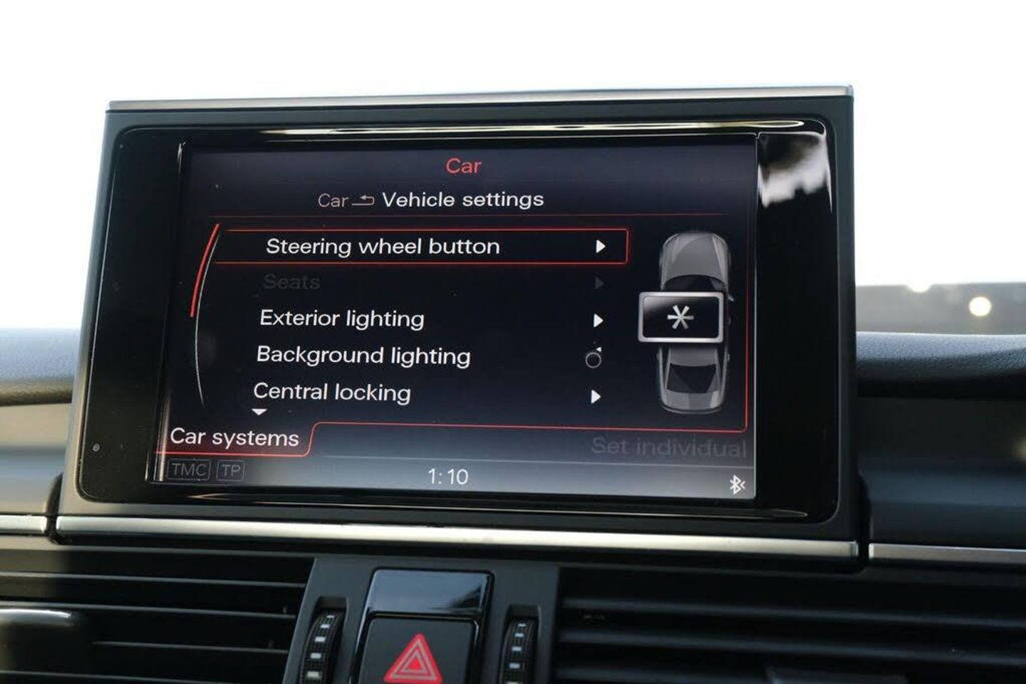 12V Power Socket, 17in Alloy Wheels - 10-Arm Turbine Design, ABS - Anti-Lock Braking System, AUX-IN Socket, Acoustic and Visual Parking System - Front, Acoustic and Visual Parking System - Rear, Airbags - Driver, Airbags - Front Passenger, Airbags - Front Side System, Airbags - Head System, Amplifier - 180 Watt, Amplifier - 6 Channel, Anti Theft Locking Wheel Bolts, Anti-Theft Alarm, Audi Drive Select, Audi Hill Hold Assist, Audi Sound System, Auto-Dimming Rear-View Mirror, Automatic Wipers with Rain Sensor, Body Coloured Door Mirrors, Car Jack, Climate Control - Electronic Deluxe 4-Zone, Cloth Headlining, Colour Drivers Information System - DIS, Cruise Control, Display Screen Colour 8in, Door Mirrors - Automatic Kerb View Dipping Function When Reversing, Door Mirrors - Electrically Adjustable and Heated, Door Sill Trims with Aluminium Inlay, Dynamic Suspension, ESP - Electronic Stability Programme, Electric Sunroof - Slide and Tilt, Electric Windows - Front and Rear, Electromechanical Parking Brake, First Aid Kit, Front Centre Armrest, Front and Rear Floor Mats, Halogen Headlights, Hard Drive - 20GB, Headlights - Automatic Adjustment, ISOFIX Child Seat Mounting for Front Passenger with Airbag Deactivation and Outer Rear Seats, Inlays - Aluminium Trigon, Keyless Go, MMI Navigation Plus including MMI Touch, MMI Radio Plus, Mobile Telephone Preparation - Bluetooth Interface, Non-Smoking Package, Power Steering - Electromechanical/Servotronic Speed Sensitive, Remote Central Locking, SD Card Reader, Seats - Drivers Manual Height Adjustment, Speakers x10, Split-Folding Rear Seats, Steering Wheel - 4-Spoke Leather/Shift Paddles, Steering Wheel - Multi-function, Tool Kit, Towbar Preparation, Tyre Pressure Monitoring System, Tyre Repair Kit, Warning Triangle, Audi Entertainment Mobile, Audi Entertainment Module, BOSE Surround Sound System, Mobile Telephone Preparation - Low with Bluetooth and Voice Control, Park Assist, Door Mirrors - Heated-Electrically Adjustable-Folding, Privacy Glass, Heated Front Seats, Sunroof
