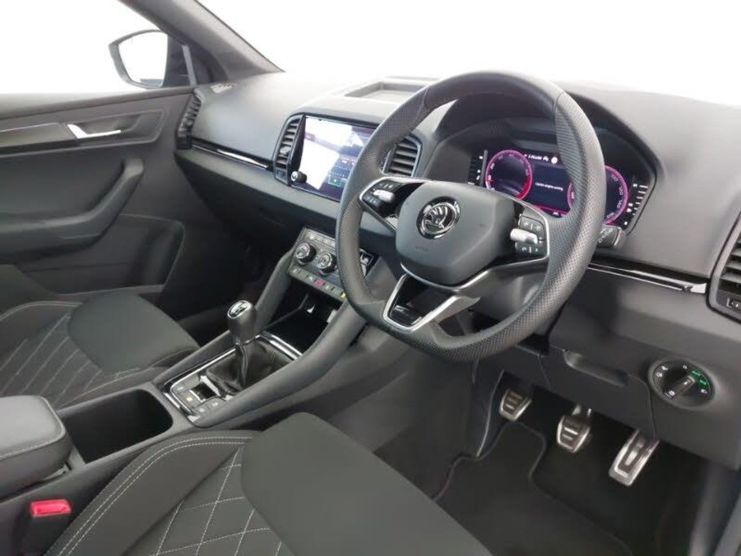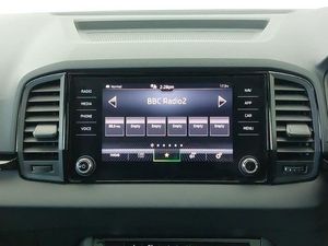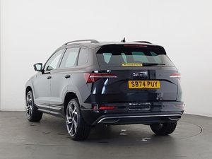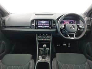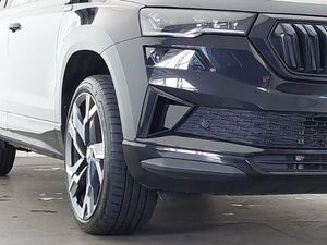 SmartLink wireless for Apple and wired for Android, Virtual Cockpit - 10.25" digital display, Wireless smartphone charging, Virtual pedal with electrically operated boot door, Light Pack - Karoq, LED Interior lighting pack with Skoda welcome logo - Karoq, Non Smokers pack, USB C Port x 2 in front centre console, USB connection, DAB radio with Bluetooth, Auto dimming rear view mirror with light and rain sensors, Black electric window control buttons, Electric front and rear windows with child proof lock, LED daytime running lights, LED rear lights with high functionality welcome effect and dynamic indicators, Panoramic sliding sunroof, Privacy glass, 3 spoke sports leather heated multifunction steering wheel, 3 seat bench in 2nd row, Isofix child seat preparation for front passenger seat, Isofix child seat preparation outer rear, Automatic door unlocking in case of crash, Automatic fuel cut off in case of crash, Electronic parking brake with auto hold function, ESC (incl. ABS+MSR+ASR+EDS+HBA+DSR+RBS+MKB), Head airbags, Front side airbags, Hill hold control, Knee airbags, Pedestrian monitor, Keyless entry and start/stop, Electronic engine immobiliser, Alarm with interior monitoring, back up horn and tilt sensor with safe function, 19" Sagittarius anthracite alloy wheels