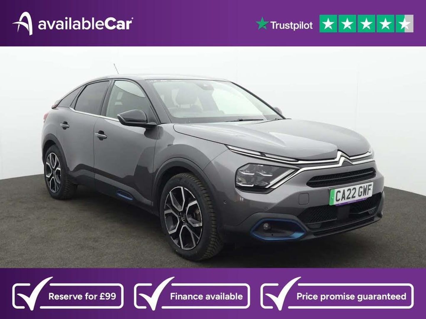 10in High Resolution Touchscreen User Interface,18in Alloy Wheels - Bi-Tone Crosslight Diamond Cut,5.5in Backlit Full-TFT Drivers Instrument Cluster,7.4kW Single-Phase Onboard Charger,ABS - Anti-Lock Braking System,Active Blind Spot Detection,Adaptive Cruise Control with Speed Limiter,Anodised Blue Colour Pack,Anti-Theft Alarm - Volumetric Protection,Automatic Dual Zone Air Conditioning,Automatic Headlight Activation with High Beam Assist,Boot Light,Bumpers - Body Coloured,Citroen Connect Box with Emergency and Assistance System,Citroen Connect Nav,City Smart Pad Support - Universal Tablet Cradle,Compressor with Puncture Repair Kit,Dashboard Tray in Front Cabin,Deluxe Leather Steering Wheel with Two Command Blocks,Driver and Front Passenger Airbags,Driver and Passenger Sunvisor with Illuminated Vanity Mirror,ESP - Electronic Stability Programme,Electric Parking Brake,Electric Power Steering,Electric Windows - Front and Rear,Electrically Heated and Folding Door Mirrors with Courtesy Lighting,Electrochrome Interior Rear View Mirror with Automatic Day-Night Switching,Front Seat Belt Pretensioners,Front and Rear Interior Lighting - LED,Gloss Black Rear Skirt,Head-Up Display,Heated Steering Wheel,Height Adjustable Drivers Seat with Adjustable Lumbar Support,Height Adjustable Passengers Seat,Height and Reach Adjustable Steering Wheel,High Level Acoustic Insulation Pack,Hill Start Assist,In-Crash Braking,Keyless Entry and Start,LED Daytime Running Lights in V Signature,LED Front Fog Lights with Static Cornering Function,LED Headlights,Manual Child Locks,Manual Deactivation of Front Passenger Airbag,Map Pockets on Front Seat Backs,Matt Black A-Pillar and Gloss Black B-Pillar,Mode 3 Charging Cable with Type 2 Connectors,Obsidian Black Painted External Rear View Mirrors,Parking Aid - Front and Rear and Lateral,Post Collision Safety Brake,Rain Sensing Automatic Front Windscreen Wipers,Raised Central Console with Armrest with Two Cupholders,Remote Central Locking with Deadlocking,Remote Temperature Pre-Conditioning,Row 1 - 12V Power Outlet and 1x USB Type-C Socket for Charging and Data Connection and 1x USB Type-A Socket for Charging,Row 1 Side Thorax Airbags,Row 1 and 2 Curtain Airbags,Row 2 - 1x USB Type-A Socket for Charging,Safety Pack Plus,Seatbelt Unfastened on the Move Warning,Seats Rear - Split Folding,Side Windows with Chrome Detail - Rear Window Dark Tinted,Suspension with Progressive Hydraulic Cushions - PHC,Top Rear Vision Reversing Camera,Tyre Under Inflation Indicator,Visio Park,Welcome and Goodbye Lighting