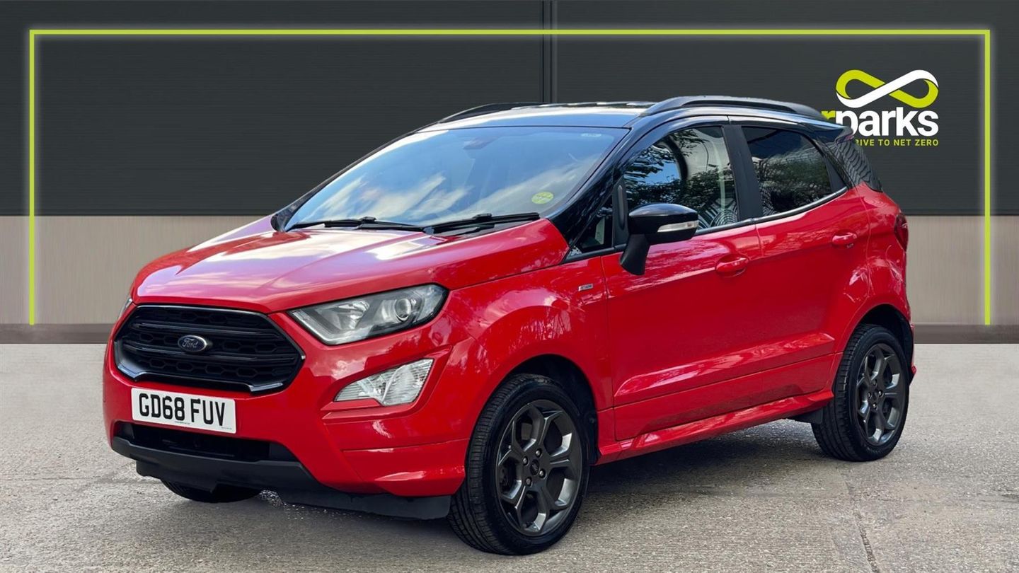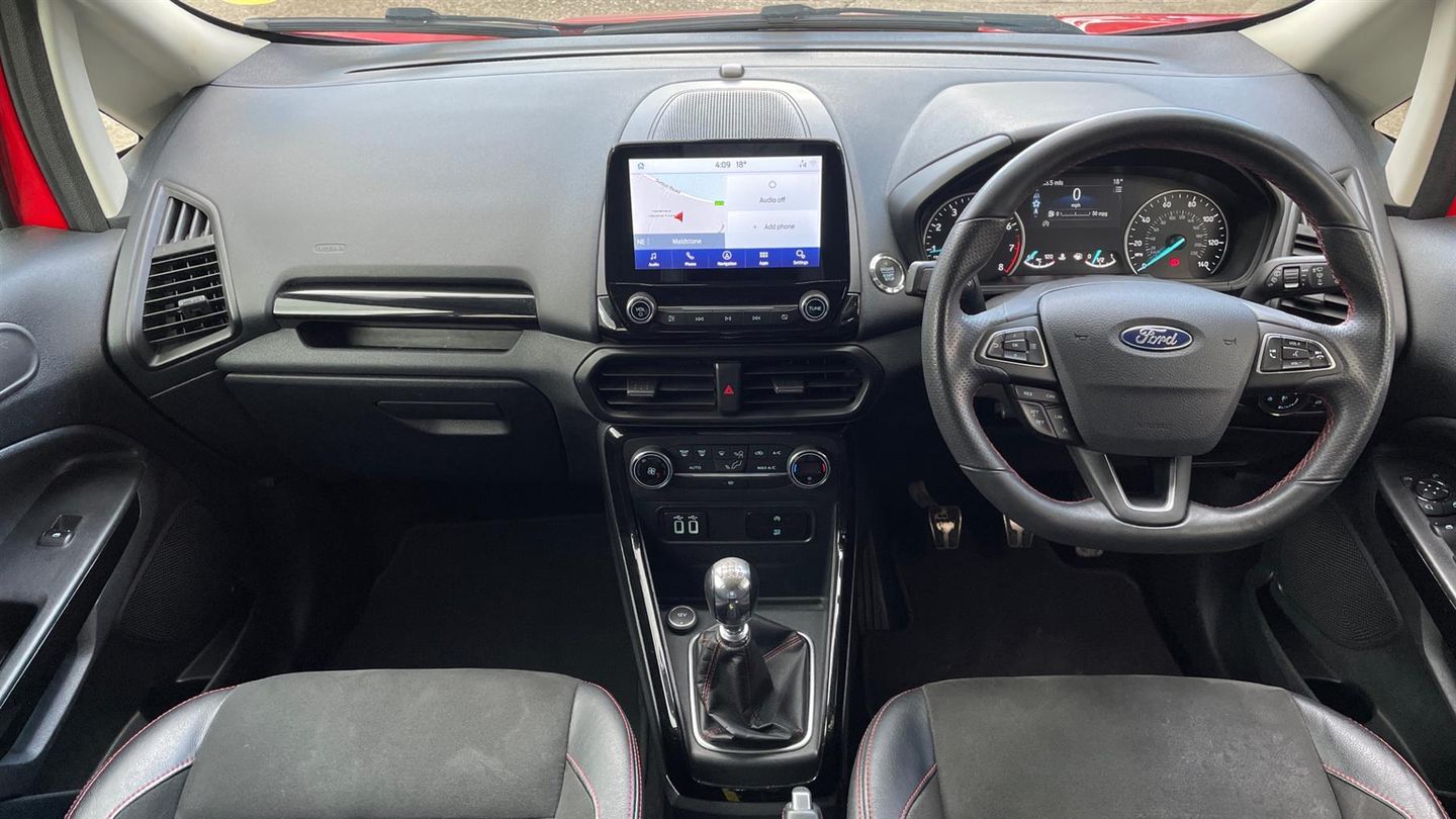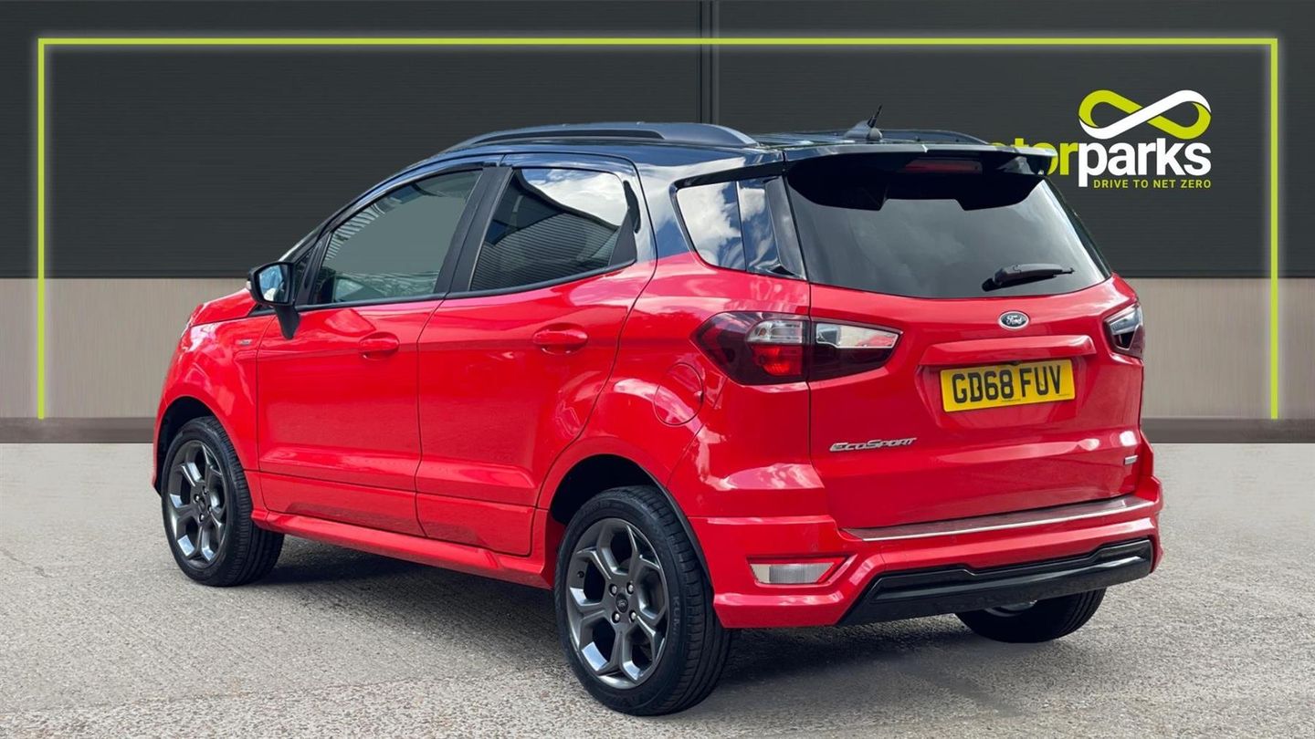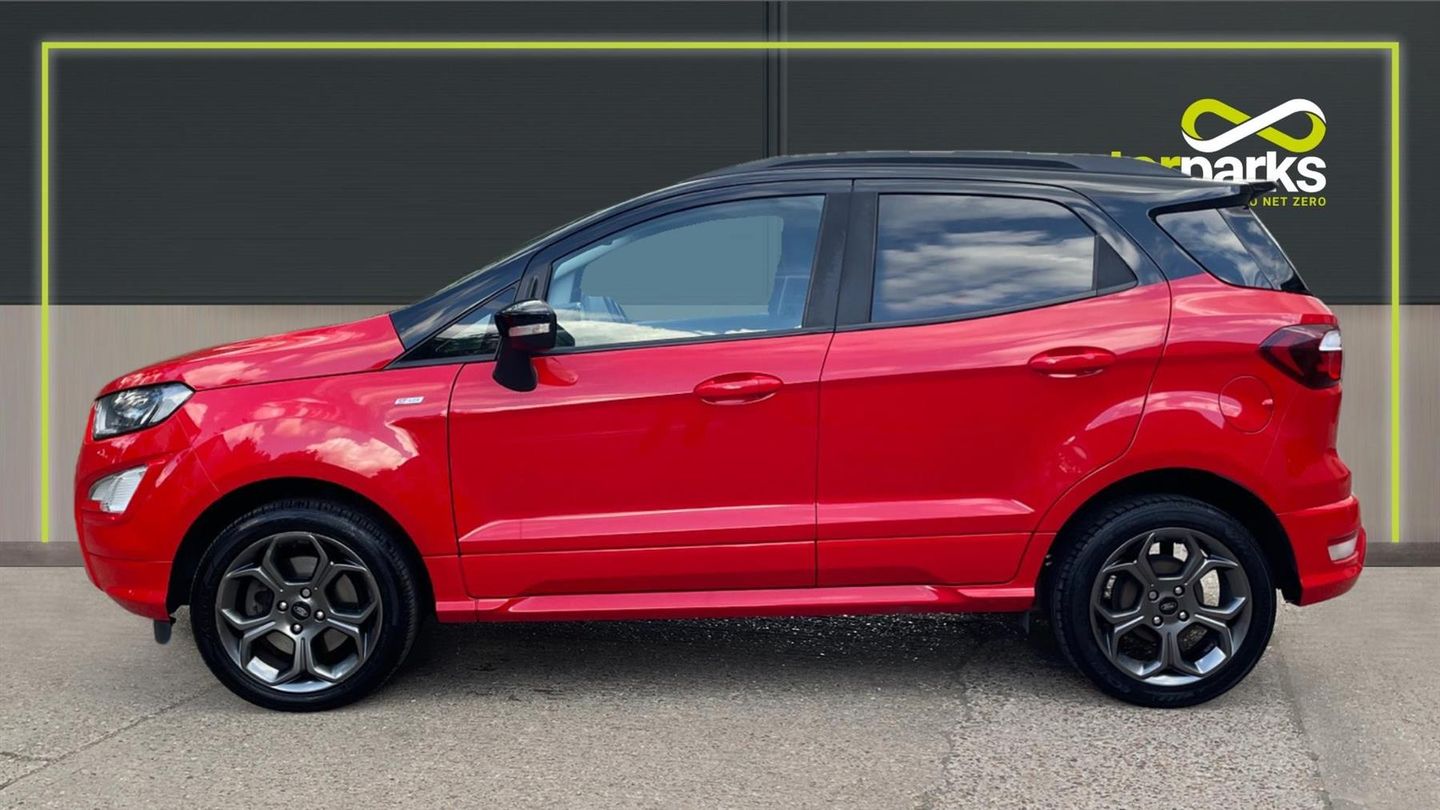 A stylish EcoSport ST-Line finished in Race Red with contrast Black roof. Discover the Ford EcoSport 1.0 EcoBoost ST-Linewhere style meets substance. This versatile 5-door SUV is equipped with state-of-the-art navigation and a reverse camera, ensuring you never miss a turn or a parking spot. Rear parking sensors add precision to your maneuvers. Enjoy the ease of cruise control on open roads and the convenience of rain-sensing wipers when the weather turns. Tune into your favorite stations with a crisp DAB radio, while climate control keeps you comfortable year-round. Designed for the modern explorer, the EcoSport ST-Line combines performance, style, and technology to elevate every journey. Drive one today..