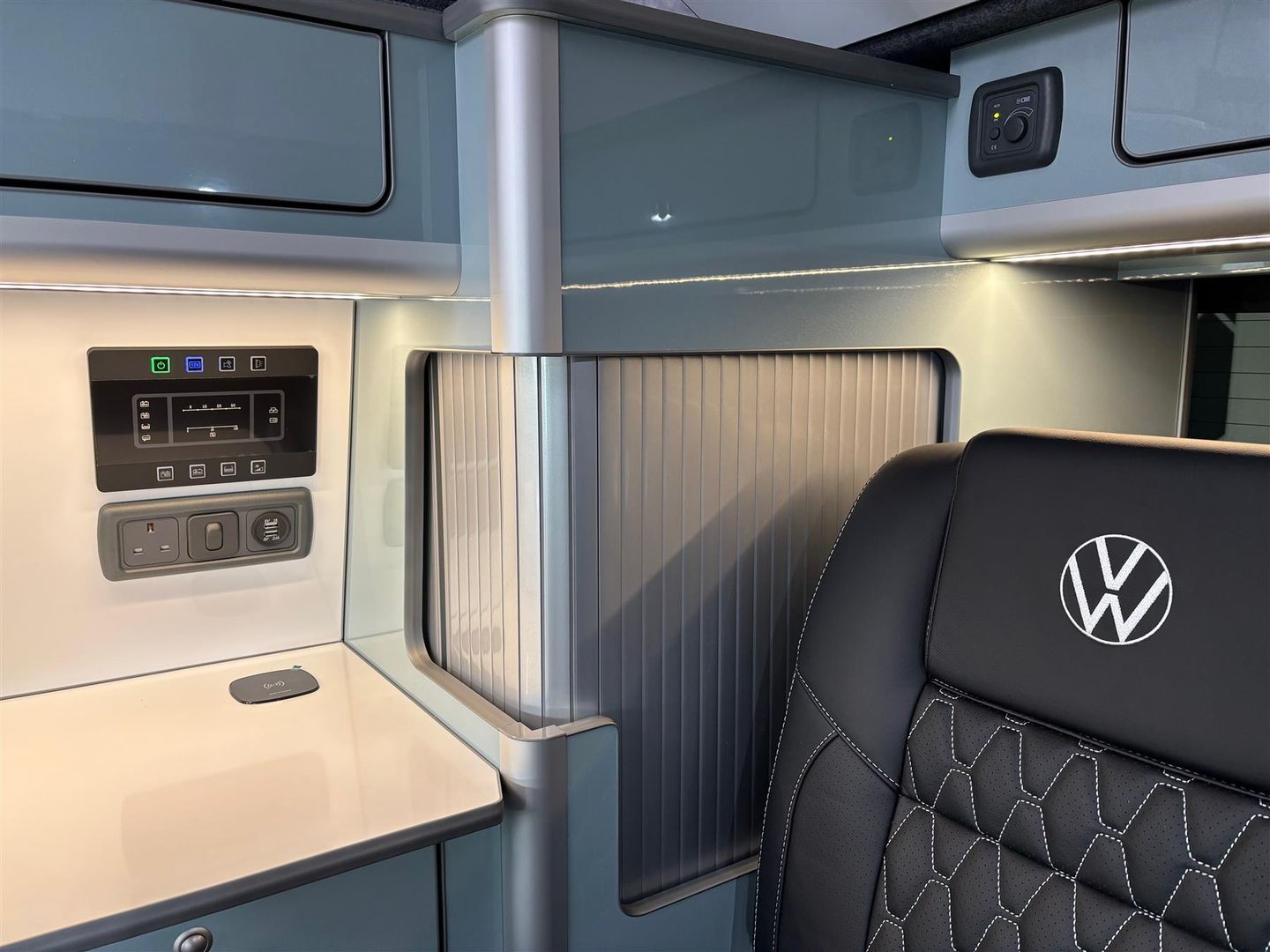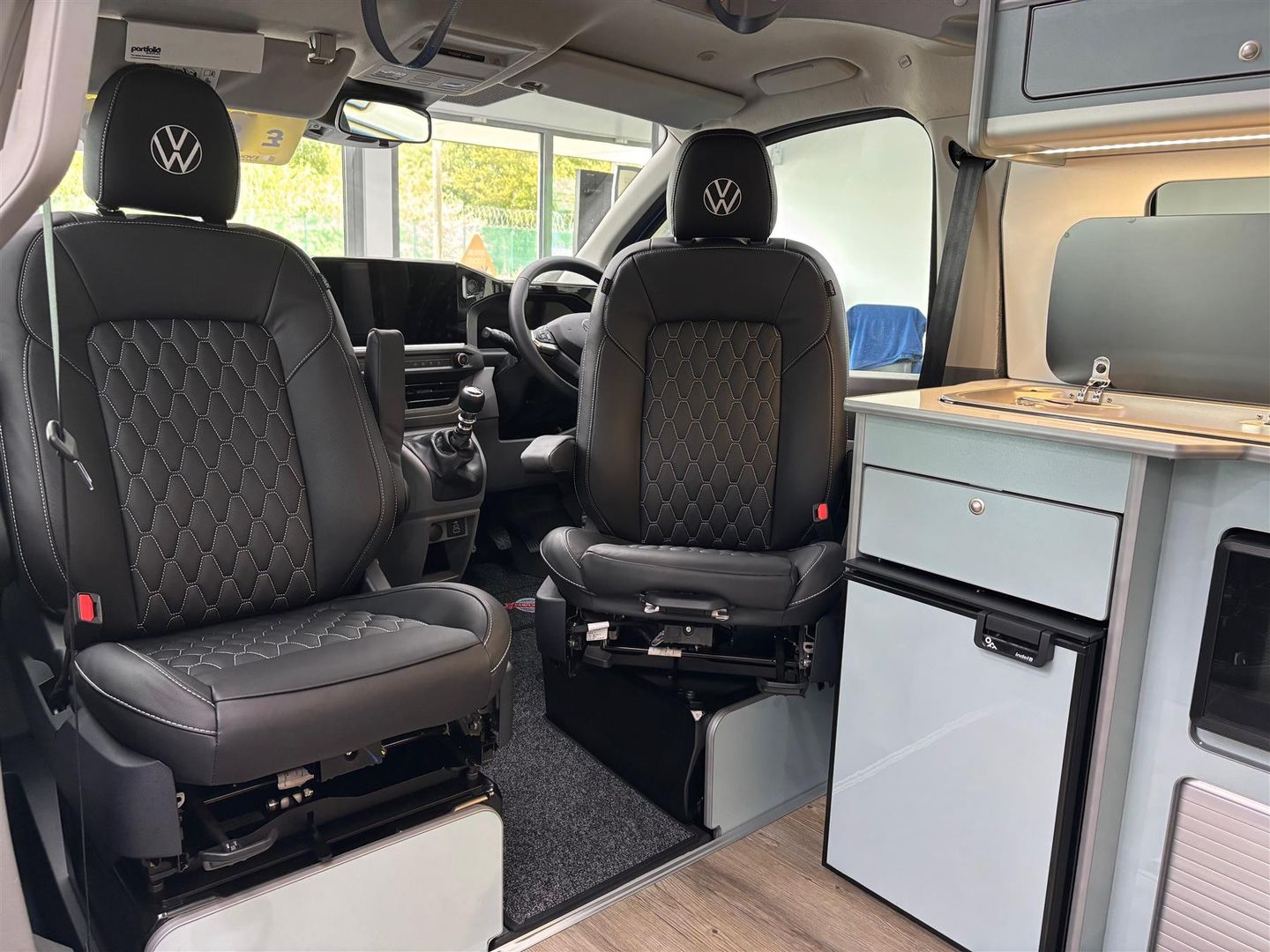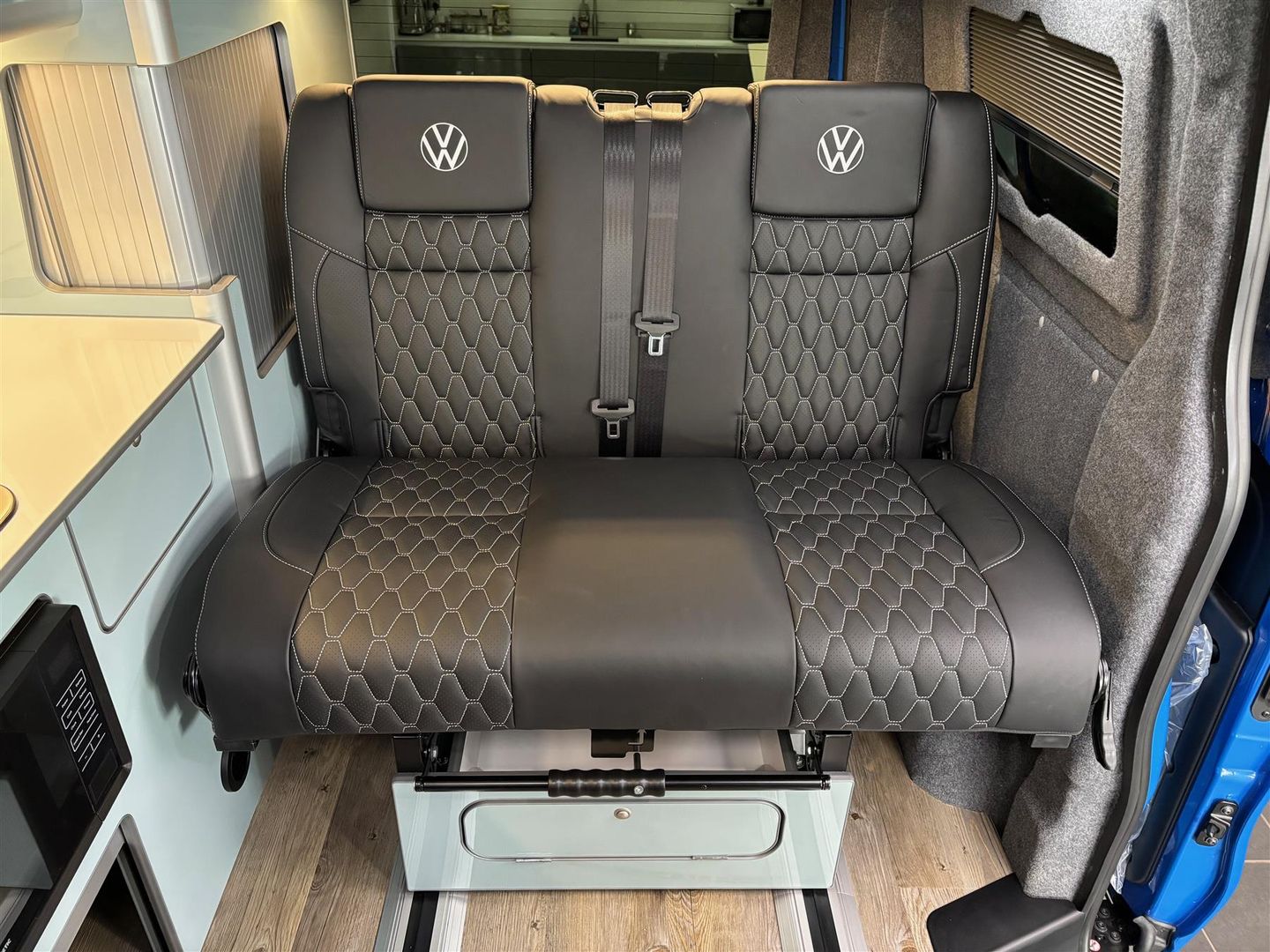 Upgraded Upholstery in Black Leather with Suede Bed & VW Logos