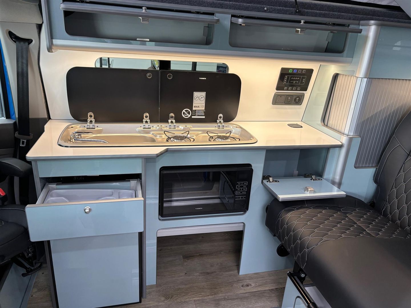 This Campervan is fitted with Captain’s Swivel Seats, and there are a further 2 seats in the rear, both fitted with 3 point seatbelts.