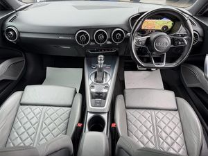 Audi active lane assist, Audi drive select, Audi virtual cockpit - 12.3" high-resolution LCD display with fully customisable instrument cluster, MMI touch panel, Mobile phone preparation with bluetooth interface, Progressive power assisted steering, Service interval indicator, Audi magnetic ride, Audi music interface, Auxiliary input socket, Bluetooth audio streaming, DAB Digital radio, MMI Radio with CD player and SD/XC card slot, Aluminium door mirror housings, Auto headlight range control, Automatic coming/leaving home lighting function, Body colour bumpers, Electric front windows, Headlight wash system, LED daytime running lights, LED rear lights, Platinum grey front grille, Rain and light sensors, Rear diffuser, Retractable rear boot spoiler, S body styling, Aluminium door sill trims, Black headlining, Contoured 3 spoke flat bottom multi-function leather sport steering wheel/gearshift paddle, Electric lumbar support, Front head restraints, Front passenger seat isofix location point, Heated front seats, Height/reach adjust steering wheel, ISOFIX on outer rear seats, Perforated leather gearknob, Split folding rear seat, Top tether anchor plate for isofix child seat, LED interior light pack - TT/TT RS, 2 rear seatbelts, 3 point front seat belts, ABS, ASR traction control, Curtain airbags, Driver/Front Passenger airbags, EDL traction control, Electromechanical parking brake, ESP, First aid kit, Front passenger airbag deactivation, Front side airbags, Tyre pressure warning, Warning triangle, Anti theft alarm, Immobiliser, Keyless Start, Locking wheel bolts, Remote central locking, Tyre repair kit