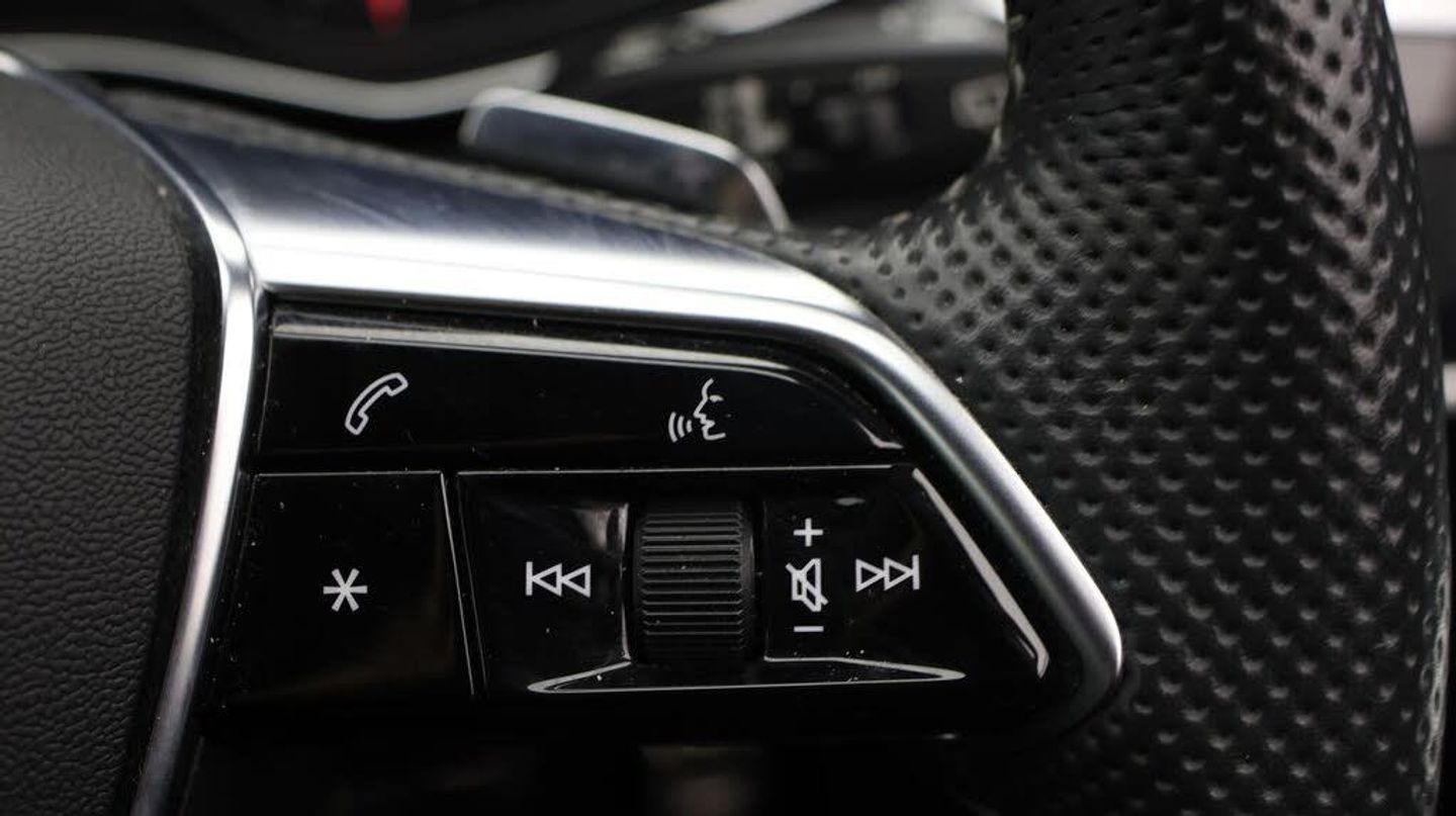Comfort and Sound Pack, Flat-bottomed 3-spoke leather high multi-function steering wheel with shift paddles, Ibis white, solid, Matt-brushed aluminium