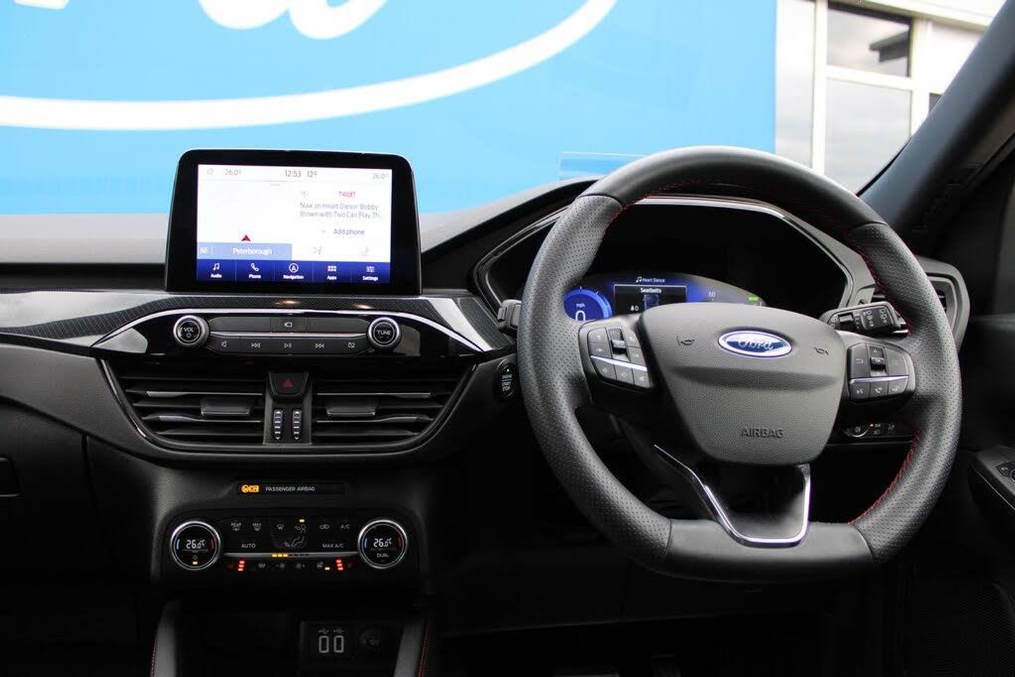 12.3" digital colour instrument cluster, Ford easy fuel, Ford SYNC 3 with 8" TFT LCD touchscreen, App Link, andriod auto/apple carPlay, emergency assistance and navigation with Ford pass connect, Front and rear parking sensors, Geo awareness, Hands free power tailgate, Lane keeping aid with lane departure warning, Power assist steering, Rear view camera, Selectable drive modes, Service interval indicator, BO premium audio system with 10 speakers and subwoofer, 2 USB ports, DAB radio/CD, Auto headlamps with high and low beam, Black roof rails, Body colour bumpers, Day/night rear view mirror, Front LED fog lamps, Large rear roof spoiler, LED daytime running lights, LED rear lights, Power folding, electrically adjustable and heated door mirrors with puddle lights, Power front/rear windows with global close, Quickclear heated windscreen, Rain sensing wipers, Rear privacy glass, Rear side wing doors, Rear wiper, ST Line body styling kit with unique front and rear fascia and bumper, rear painted diffuser, front painted skid plates, dark mesh upper grille, ST Line front scuff plates, Third brake light, Twin exhausts, 2nd row sliding seats with 60:40 split, Alloy pedals, Centre console with electronic parking brake, Dark headlining and pillars, Electronic automatic temperature control (EATC), Flat bottomed leather steering wheel in sensico with red stitching, Front and rear head restraints, Partial premium touch Sensico with black cloth inserts and red stitching, Rear centre head restraint, Single front passenger seat, Sports seats, ST Line front and rear floor mats, Engine immobiliser, Keyless entry and Ford power start button (Keyless start), Locking wheel nuts, Remote powered central double locking doors, Thatcham category 1 alarm, Power Opening Panoramic Roof, Technology Pack, Winter Pack, Driver Assistance Pack, Mini Spare Wheel - 17in Steel