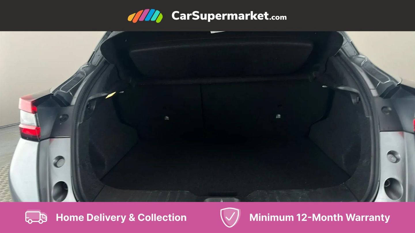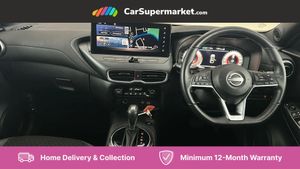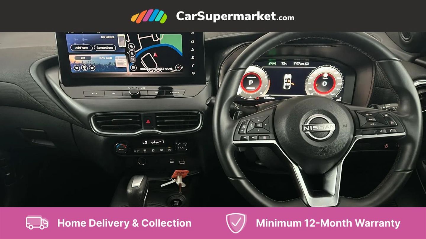 12.3" full colour TFT screen combimeter,Drive modes select (Eco, normal and sport),Emergency and breakdown call,Front parking sensor,Idle start/stop system,Intelligent driver alert system,Intelligent lane intervention,Lane departure warning system,Nissan connect 12.3" touch screen entertainment system,Nissan connect nav with TomTom traffic,Nissan connect services and Wifi connection,Outside temperature sensor,Power Steering,Rear parking sensor,Stop/start button,Traffic sign recognition,Trip computer,Voice recognition,Wireless Apple CarPlay and Google Android auto,Wireless Smartphone charger,2 X Rear console USB port,6 speakers,Bluetooth system, USB, Aux-in and 12V socket,DAB Digital radio,Auto dimming frameless rear view mirror,Automatic hazard signal with emergency stop signal,Body colour door handles,Electrically adjustable door mirrors with integrated indicators,Follow me home headlights,Front and rear electric window with one touch driver window,Heated and auto folding door mirrors,High beam assist,LED 3rd brake light,LED daytime running lights,LED headlamps,LED rear fog lamp,LED rear lamps,One touch passenger window,Rain sensor windscreen wipers,Rear privacy glass,Rear side wing doors,Rear wiper,Roof spoiler,Shark fin roof antenna in solid Black,Three blink turn signal,3 height adjustable rear headrests,3 seat bench in 2nd row,60/40 split folding rear seat,Automatic climate control,Card holder on driver sunvisor,Cloth/Synthetic leather with melange fabric inserts,Driver side rear coat hanger,Driver/passenger sunvisors and vanity mirrors,Front and rear cabin lights,Front armrest,Front door pockets with bottle holders,Front head restraints,Front/rear passenger grab handles,Height adjustable driver's seat,Internal chrome door handles,Leather gearshift knob,Leather steering wheel,Luggage board,Luggage space lighting,Monoform sporty seats,Multifunction steering wheel,Rear door bottle holders,Single front passenger seat,Steering wheel mounted gearshift paddles,Synthetic leather kneepad,Telescopic steering wheel adjustment,Two cupholders in front centre console,Two rear isofix child seat anchorage points with top tether,Welcome light and console tray ambient lighting,ABS with EBD and brake assist,Active ride control,Active Trace Control,Driver and passenger airbags,Driver and passenger side airbags,Electric handbrake with auto hold function,Electronic Stability Programme (ESP),Front and rear curtain airbags,Height adjustable seatbelts,Hill start assist,Intelligent emergency braking with pedestrian and cyclist recognition,Rear door child safety locks,Seatbelt reminder for driver/front passenger and rear seats,Three 3 point rear seatbelts,Traction control,Tyre pressure monitoring system,VDC Dynamic Vehicle Control,Alarm,Immobiliser,Intelligent key and start push button with walk away lock and approach unlock functions,Remote central locking,17" Alloy wheels