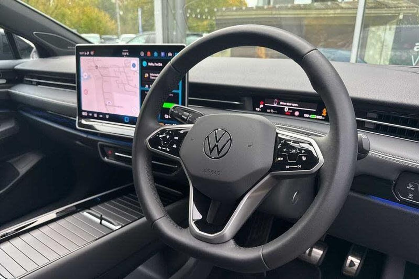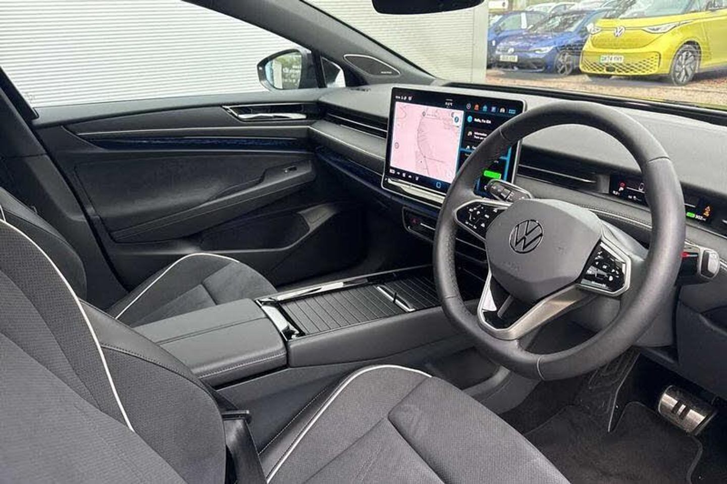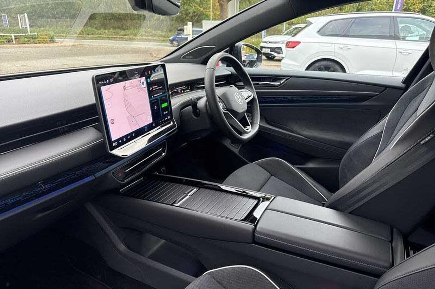 Exterior Features, Metallic paint, Wheels, 20 inch Montreal black gloss turned surface alloy wheels with airstop tyres, Exterior Features, Front and rear electric windows, Rain sensor, Rear wiper, Windscreen - Laminated, heated, infrared-reflecting and sound insulating, AC Charging socket, Body coloured bumpers, Charging flap with weather protection, Rear side wing doors, Roof aerial, Auto headlights, High beam assist with automatic sensing for switching between dipped and main beam, LED 3rd brake light, LED daytime running lights, LED indicator lights, Welcome lights, Safety, ABS, Autonomous emergency braking front assist with pedestrian and cyclist monitoring, Brake energy recuperation, Electric parking brake, ESP, Front disc brakes, Rear drum brakes, Adaptive cruise control, Advanced driver attention and drowsiness monitor, Area view including rear view camera, Dynamic road sign display, Engine start button, Lane change system, Side assist, Rear traffic alert and Exit warning system, Memory feature for park assist, Oncoming vehicle braking when turning including swerve support, Park assist plus with park distance control, Parking route memory, Semi-automatic vehicle control in an emergency, Auto dimming rear view mirror, Exterior mirrors convex on the left and aspherical on the right, Gloss black door mirrors with integrated indicators, Heated door mirrors, Remote electrically foldable door mirrors, puddle lights and reverse activated tilting door mirror, 3 point seat belts in front with seat belt pretensioners, 3x3 point rear seatbelts, Driver and front passenger airbag with front passenger airbag deactivation, Extended safety system with proactive passenger protection system, Front curtain and side airbags with center airbag, Rear door child safety locks, Two tone horn, Tyre pressure warning, Warning signal and warning light for front and rear seat belts not fastened, Interior Features, Black carpet mats, 3 zone air care climatronic with rear air conditioning control panel, Allergen filter and enhanced air filter, Electric auxiliary air heater, Energy efficient heat pump with refrigerant, 2 USB-C ports in the front, 2 USB-C charging sockets on the center console in the rear, Art Velours eco microfleece cloth upholstery with seat bolsters in Artex, Centre console with illuminated storage compartment with sliding cover and two drinks holders, Door and side trim panel in foam film, insert in leatherette, First aid kit, warning triangle and safety vest, Front centre armrest, Leatherette-wrapped multifunction heated steering wheel with touch control, Luggage compartment floor, folding with stowage area, Luggage net and storage net on sides, Matt black interior door handles, Play and pause stainless steel pedals, Variable boot floor, height adjustable and removable, 30 colours options interior ambient lighting, Sun visors with illuminated vanity mirrors, Audio / Communications, Car2X intelligent vehicle networking, Preparation for Volkswagen connect, Voice activation for navigation and phone, Wireless App-Connect, Wireless Smartphone charger, 8+1 Speakers, DAB+ radio, Gaming platform via car app, Driver Convenience, Electric tailgate