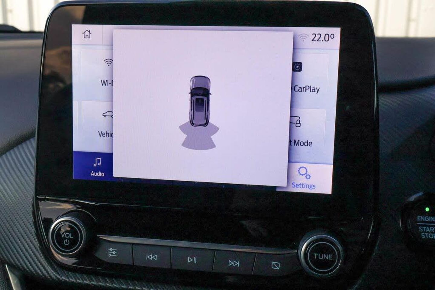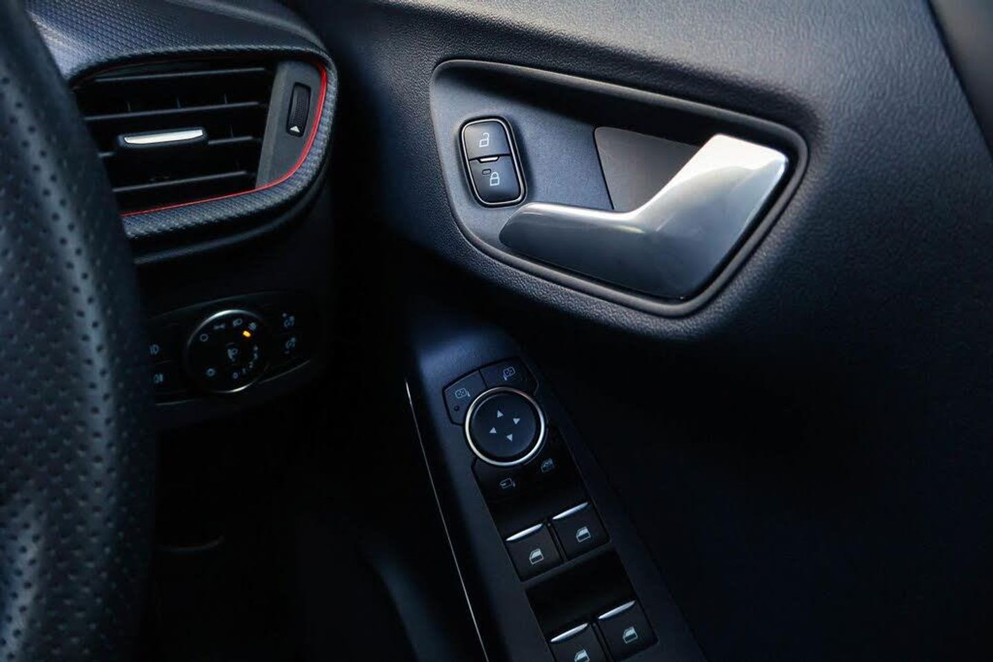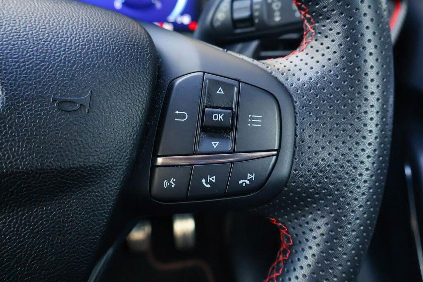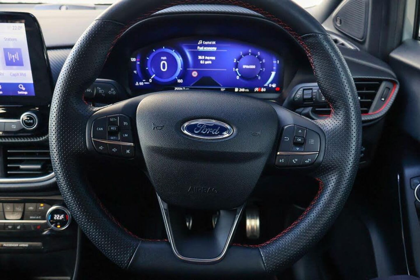 Driver impairment monitor, Emergency call service, Ford easy fuel, Full digital 12.3" instrument cluster, Lane keeping aid with lane departure warning, Power assist steering, Power start button, Rear parking sensor, Selectable drive modes(Normal, sport, Eco, trail, slippery), Speed sign recognition, Automatic headlights with auto high beam, Automatic rain sensing wipers, Front fog lamps, LED daytime running lights, LED rear lamps, Power foldable heated door mirrors with puddle lamps, Privacy glass to side rear windows and tailgate glass, Quickclear heated windscreen, Rear side wing doors, Rear wiper, ST-Line body styling kit with unique grille, Third brake light, 3 seat bench in 2nd row, Centre console with armrest and stowage, Ford megabox extended bootspace, Front and rear head restraints, Front floor mats, Manual 4 way driver seat adjust with lumbar adjustment, Manual 4 way passenger seat with lumbar seat adjustment, Sensico partial premium upholstery, Single front passenger seat, ST-Line flat bottomed sensico leather steering wheel with leather handbrake and aluminium gear knob, Wireless charging pad with electronic air temperature control (EATC), Thatcham alarm