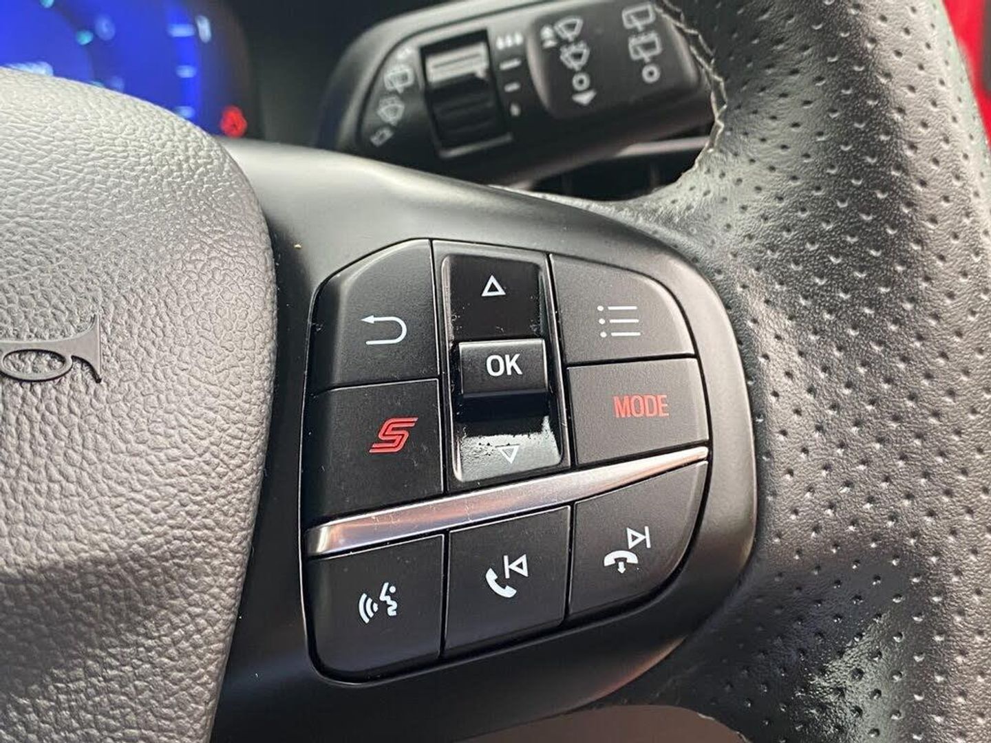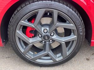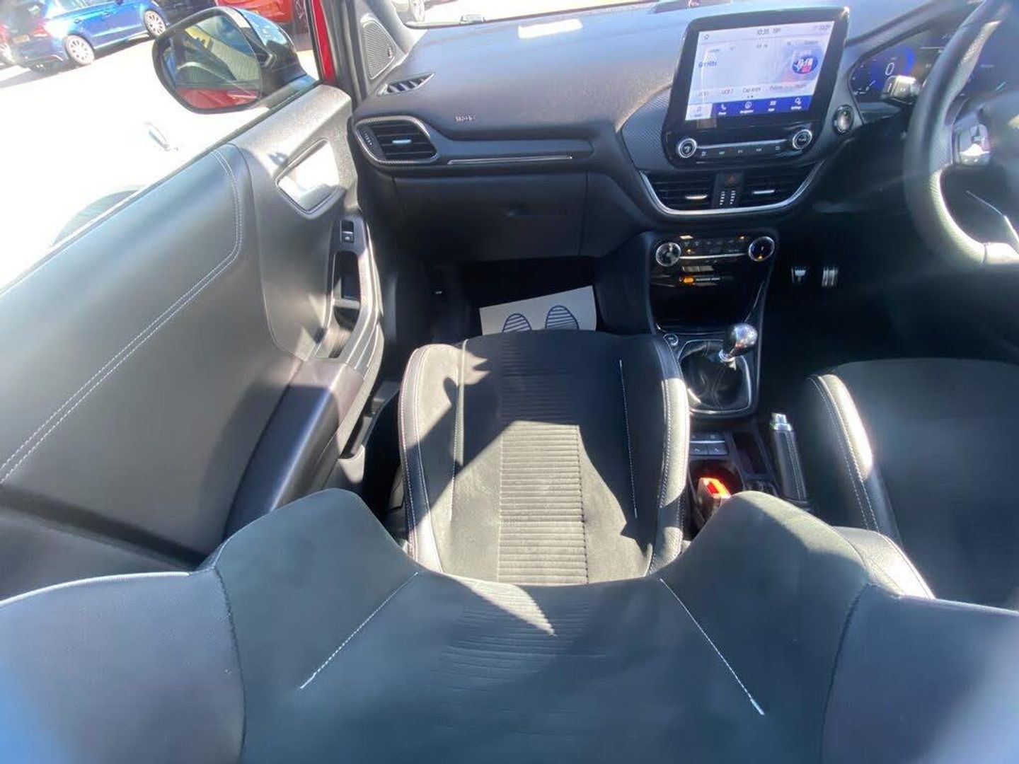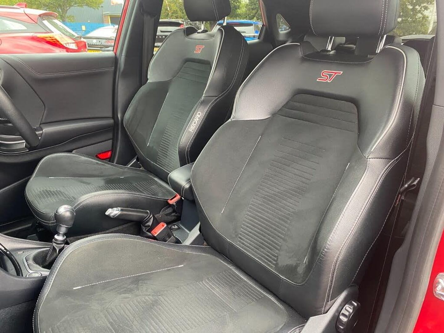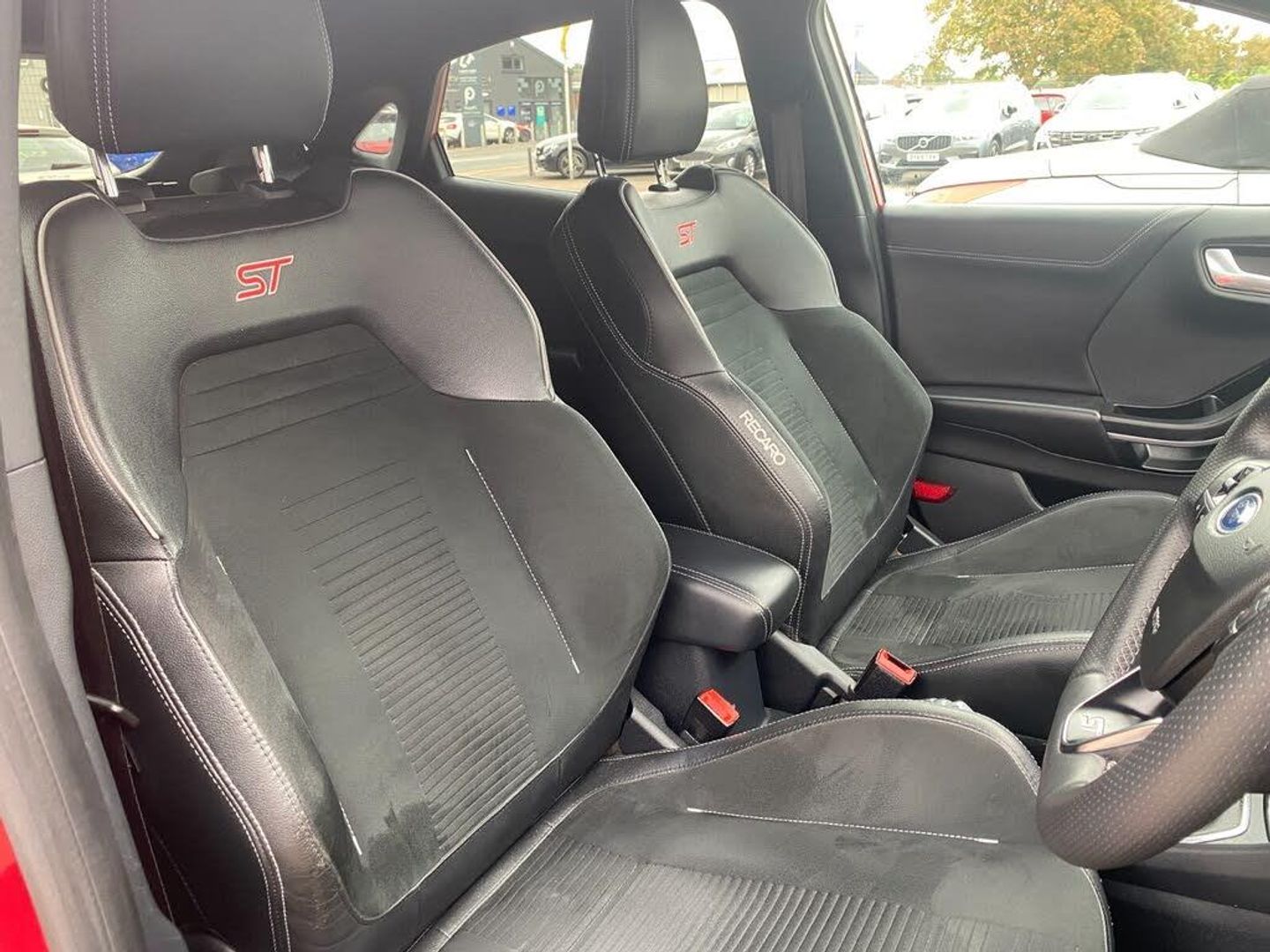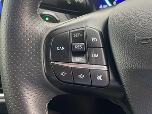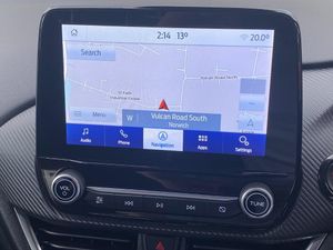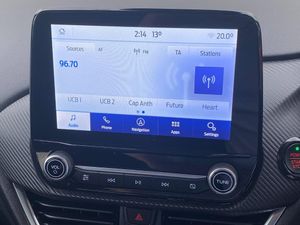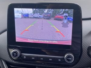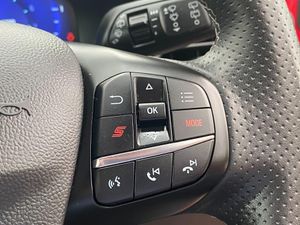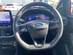 Cruise control with Intelligent speed assist, Driver impairment monitor, Emergency call service, Ford easy fuel, Front and rear parking sensors, Full digital 12.3" instrument cluster, Lane keeping aid with lane departure warning, Power assist steering, Selectable drive modes (normal, sport, eco, track), Speed sign recognition, Wireless charging pad, Engine sound enhancer, ST suspension, Automatic headlights with auto high beam, Automatic rain sensing wipers, Dual chrome exhaust, Fixed LED signature headlamps, Front fog lamps, LED daytime running lights, LED rear lamps, Power foldable heated door mirrors with puddle lamps and puma logo protection, Privacy glass to side rear windows and tailgate glass, Quickclear heated windscreen, Rear side wing doors, Rear wiper, ST scuff plates, Third brake light, Unique ST body styling kit including contrast black roof, large rear spoiler and wing mirrors, plus Ford Performance embossed splitter, 3 seat bench in 2nd row, Alloy sports pedals, Centre console with armrest and stowage, Electronic automatic temperature control (EATC), Ford megabox extended bootspace, Ford Performance sensico partial premium leather upholstery with metal grey stitching, Front and rear floor mats, Front and rear head restraints, Heated front seats, Heated steering wheel, Manual 6 way driver seat adjust with lumbar adjustment, Manual 6 way passenger seat with lumbar seat adjustment, Single front passenger seat, ST flat bottomed steering wheel with metal grey stitching, ST logo projection, Unique ST gear shift knob, B&O Premium Audio system + Ford SYNC 3 navigation pack - Puma, 3 rear seatbelts, Child safety lock, Electronic stability control (ESC) and hill start assist, Pre-collision assist with autonomous emergency braking, pedestrian/cyclist detection and post-collision braking, Red brake calipers, Tyre pressure monitoring system (TPMS), Keyless entry and power start button, Thatcham alarm, Carbon look interior deco spears, Tyre inflation kit