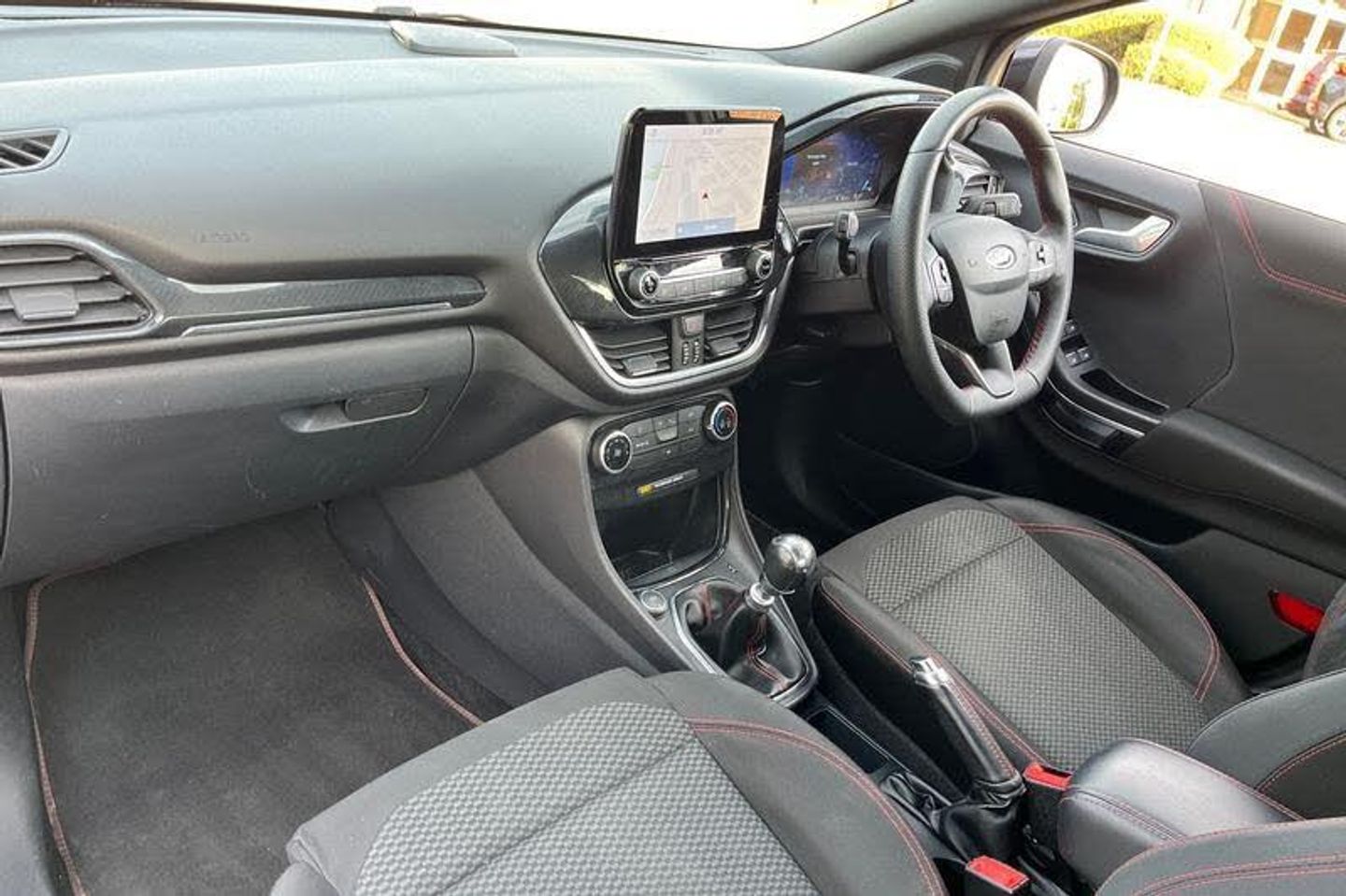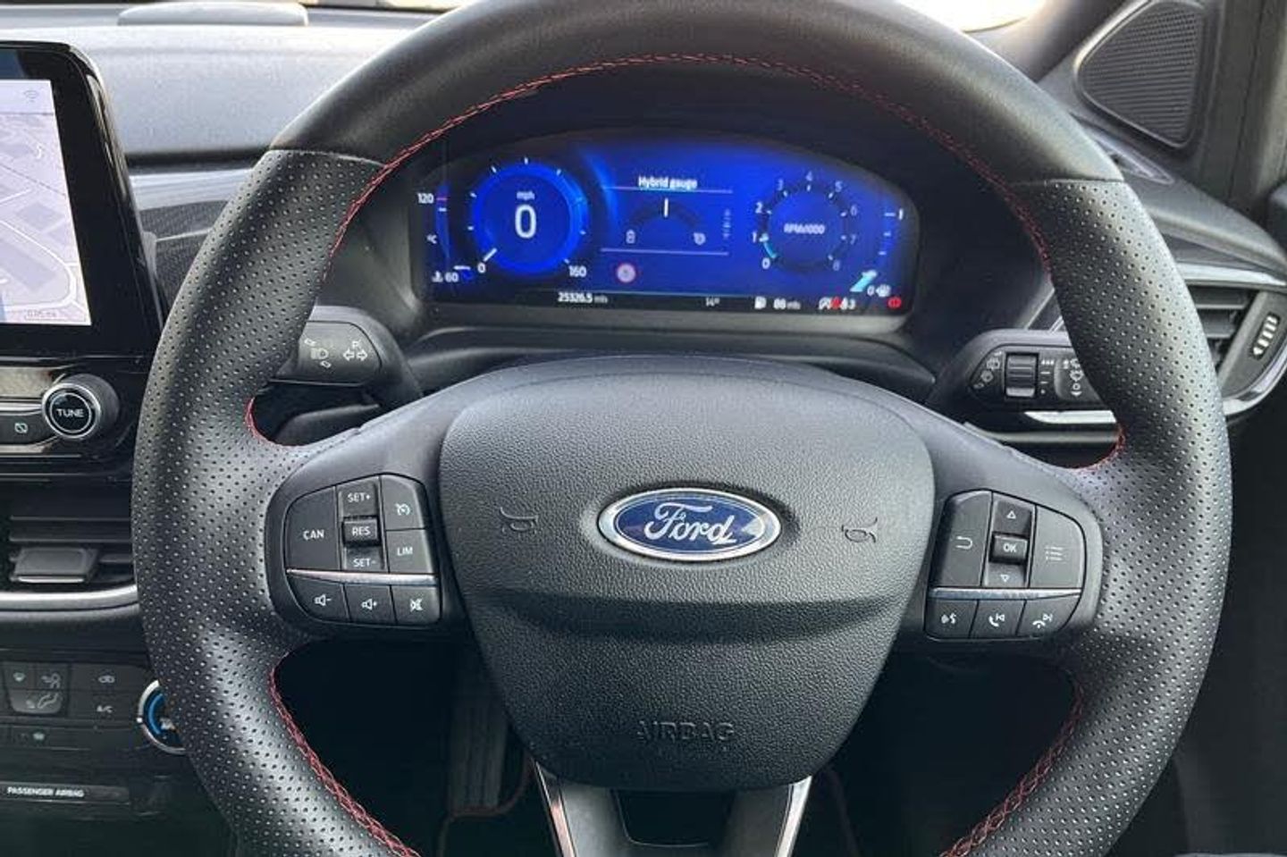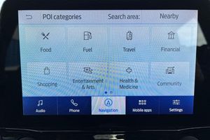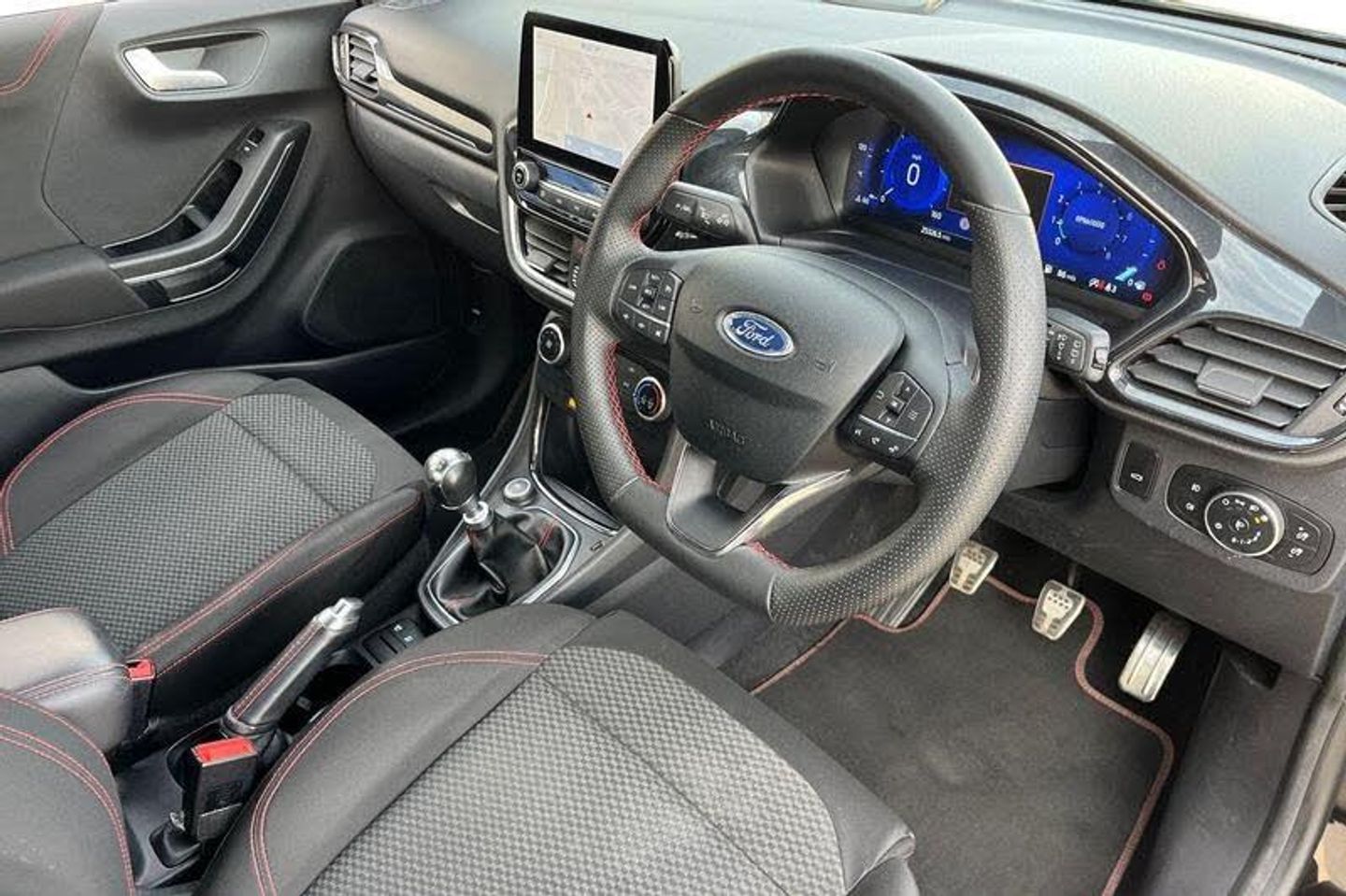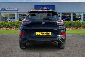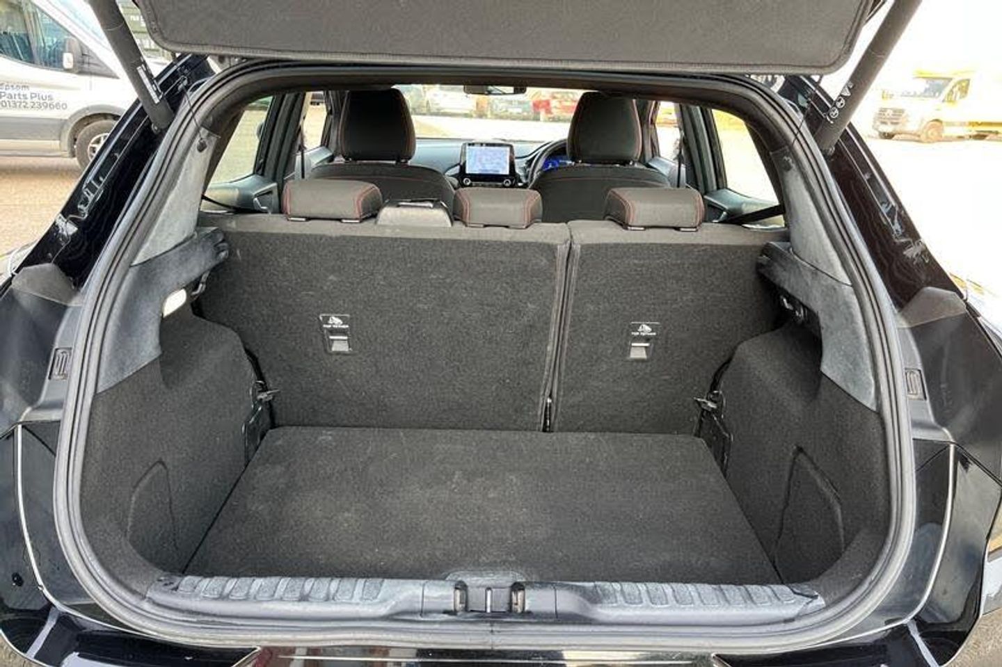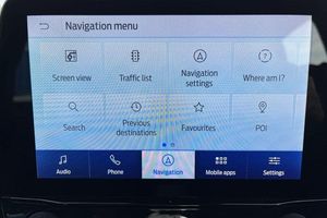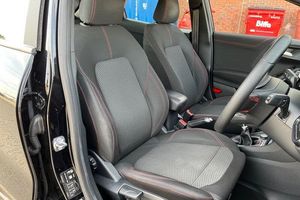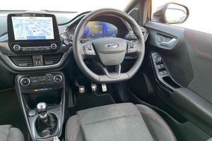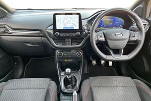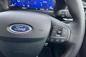 Driver impairment monitor, Emergency call service, Ford easy fuel, Full digital 12.3 instrument cluster, Lane keeping aid with lane departure warning, Power assist steering, Power start button, Rear parking sensor, Selectable drive modes(Normal, sport, Eco, trail, slippery), Speed sign recognition, Automatic headlights with auto high beam, Automatic rain sensing wipers, LED rear lamps, Power foldable heated door mirrors with puddle lamps, Projector headlamps with LED day time running lights and front fog lamps, Quickclear heated windscreen, Rear side wing doors, Rear wiper, ST-Line body styling kit with unique grille, Third brake light, 3 seat bench in 2nd row, Centre console with armrest and stowage, Ford megabox extended bootspace, Front and rear head restraints, Front floor mats, Manual 2 way passenger seat adjustment, Manual 4 way driver seat adjust with lumbar adjustment, Single front passenger seat, ST- Line cloth trim with red stitching, ST-Line flat bottomed sensico leather steering wheel with leather handbrake and aluminium gear knob, 3 rear seatbelts, Child safety lock, Electronic stability control (ESC) and hill start assist, Pedestrian/cyclist detection & post-collision braking, Pre collision assist system, Tyre pressure monitoring system (TPMS)