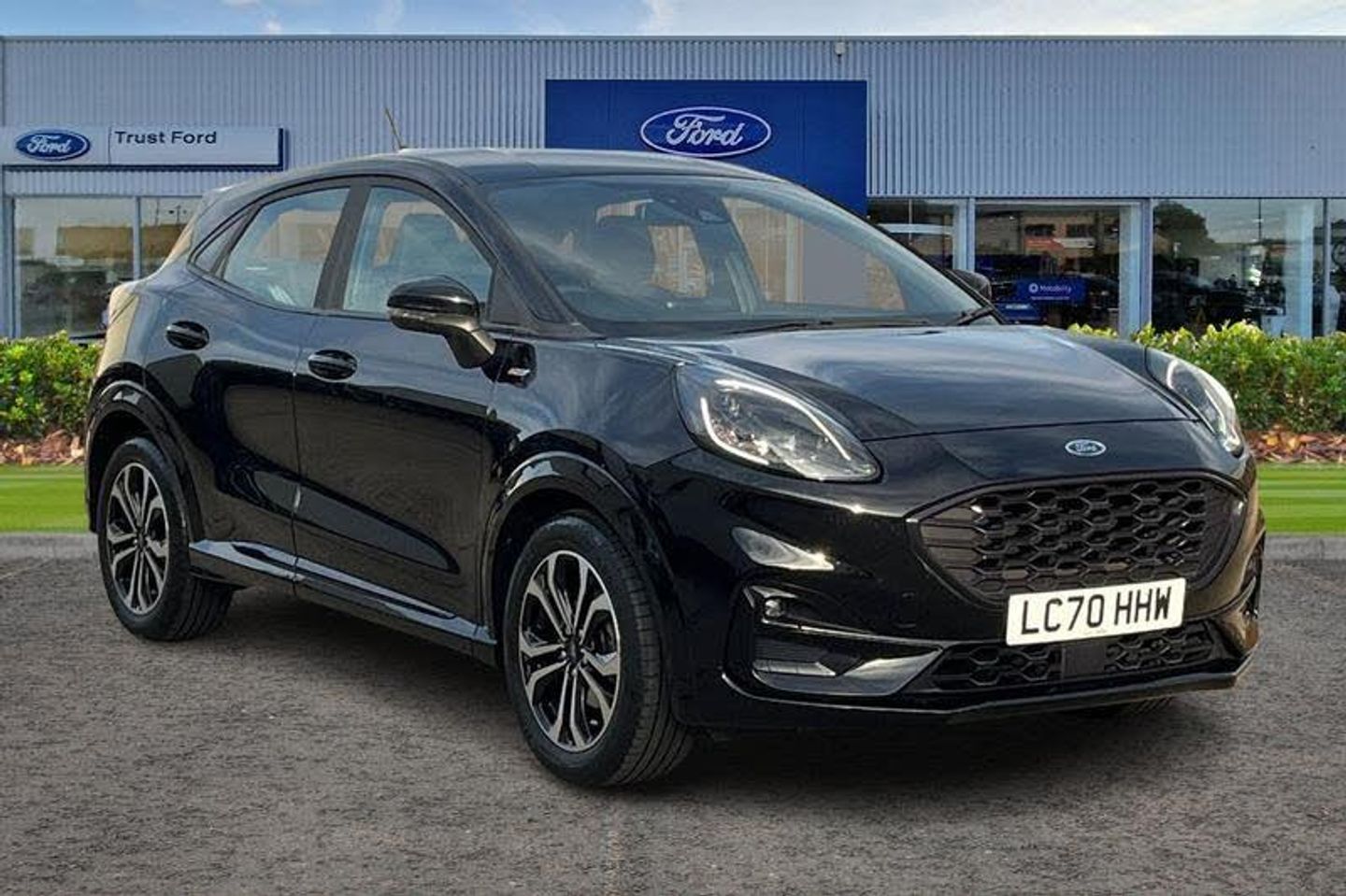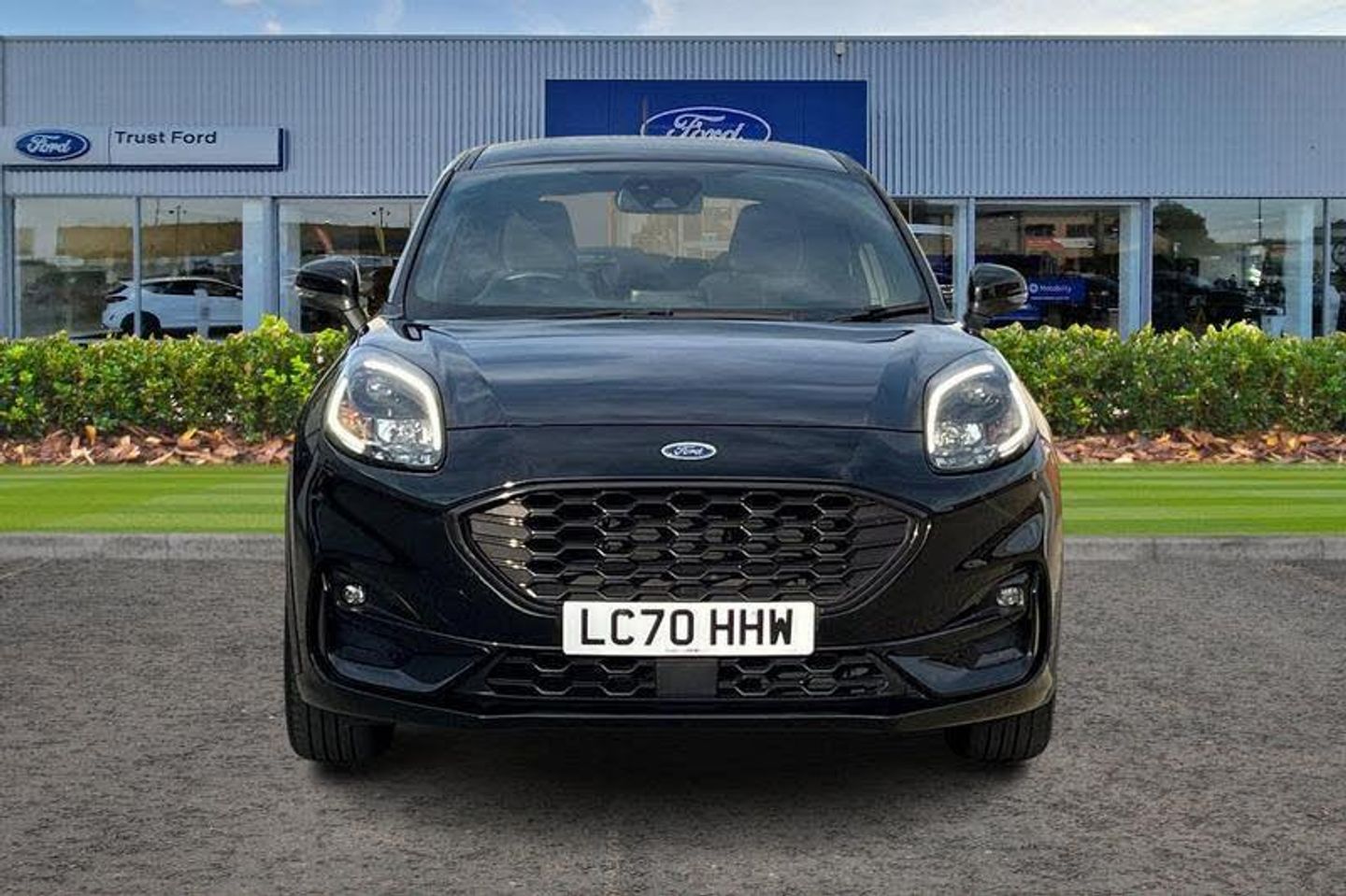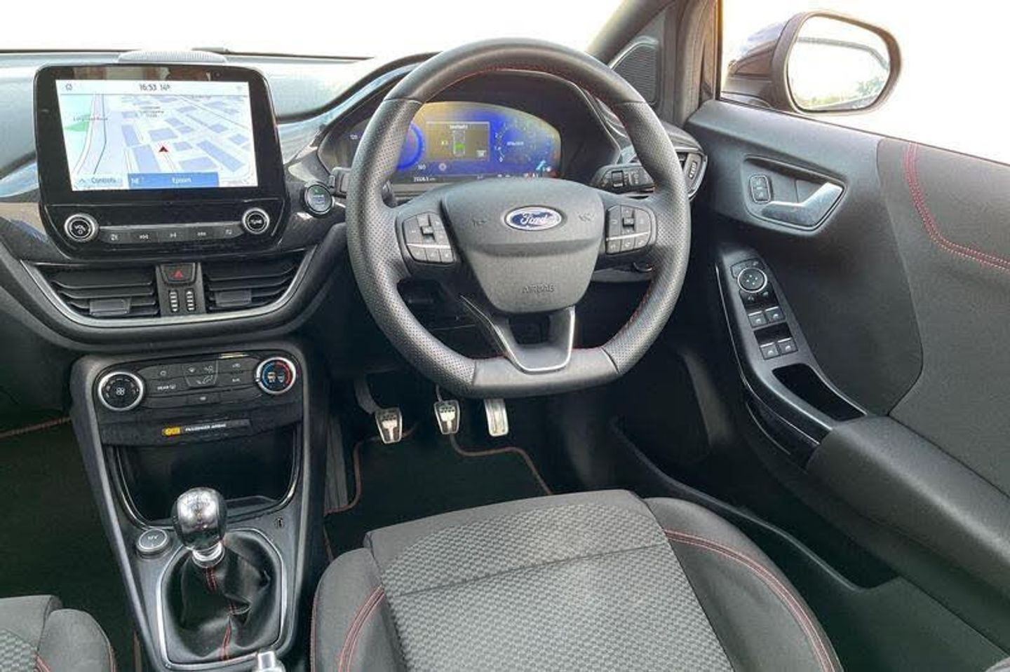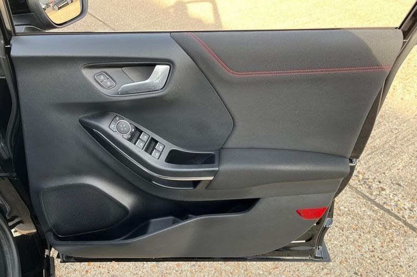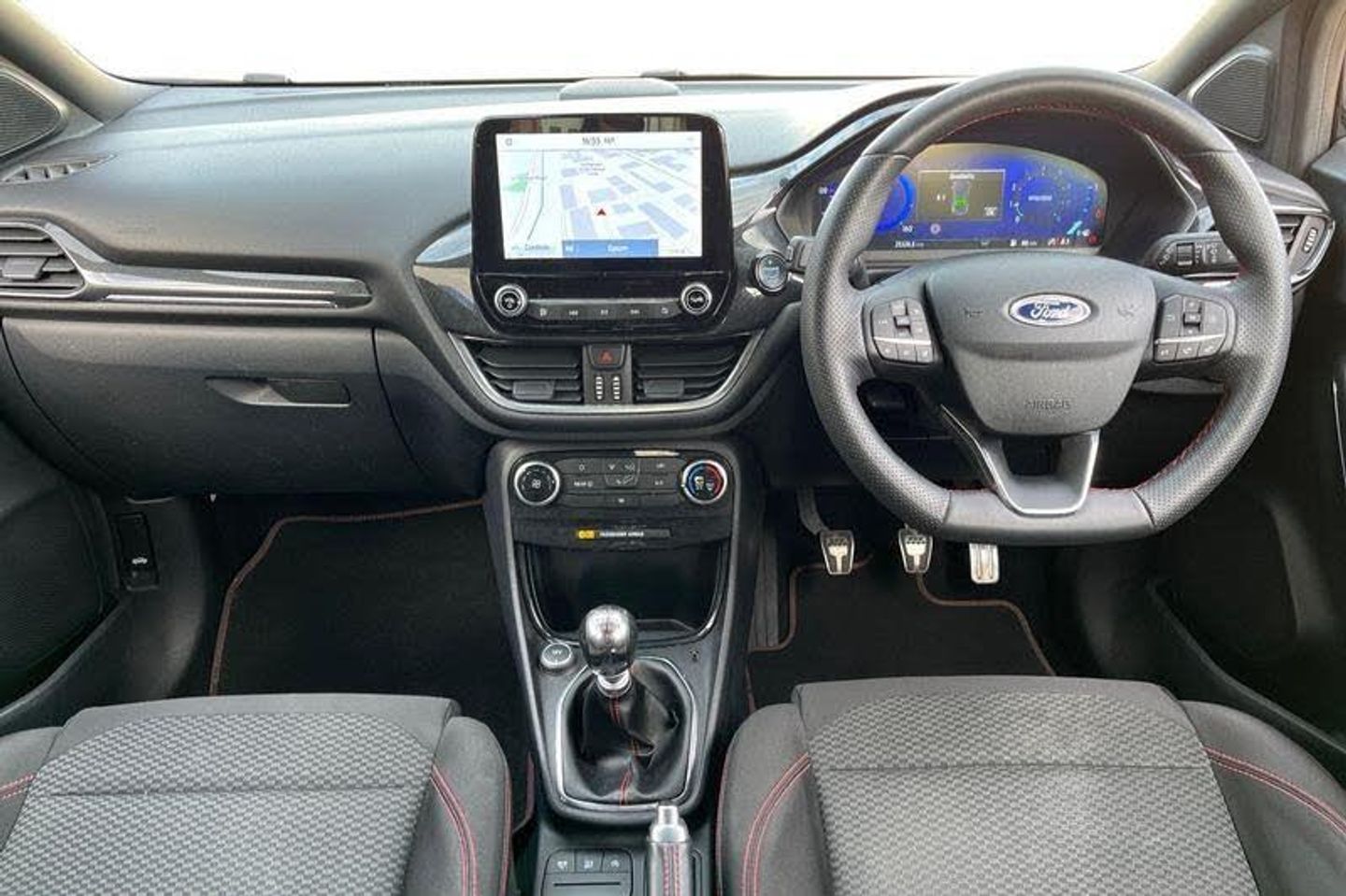 Driver impairment monitor, Emergency call service, Ford easy fuel, Full digital 12.3 instrument cluster, Lane keeping aid with lane departure warning, Power assist steering, Power start button, Rear parking sensor, Selectable drive modes(Normal, sport, Eco, trail, slippery), Speed sign recognition, Automatic headlights with auto high beam, Automatic rain sensing wipers, LED rear lamps, Power foldable heated door mirrors with puddle lamps, Projector headlamps with LED day time running lights and front fog lamps, Quickclear heated windscreen, Rear side wing doors, Rear wiper, ST-Line body styling kit with unique grille, Third brake light, 3 seat bench in 2nd row, Centre console with armrest and stowage, Ford megabox extended bootspace, Front and rear head restraints, Front floor mats, Manual 2 way passenger seat adjustment, Manual 4 way driver seat adjust with lumbar adjustment, Single front passenger seat, ST- Line cloth trim with red stitching, ST-Line flat bottomed sensico leather steering wheel with leather handbrake and aluminium gear knob, 3 rear seatbelts, Child safety lock, Electronic stability control (ESC) and hill start assist, Pedestrian/cyclist detection & post-collision braking, Pre collision assist system, Tyre pressure monitoring system (TPMS)
