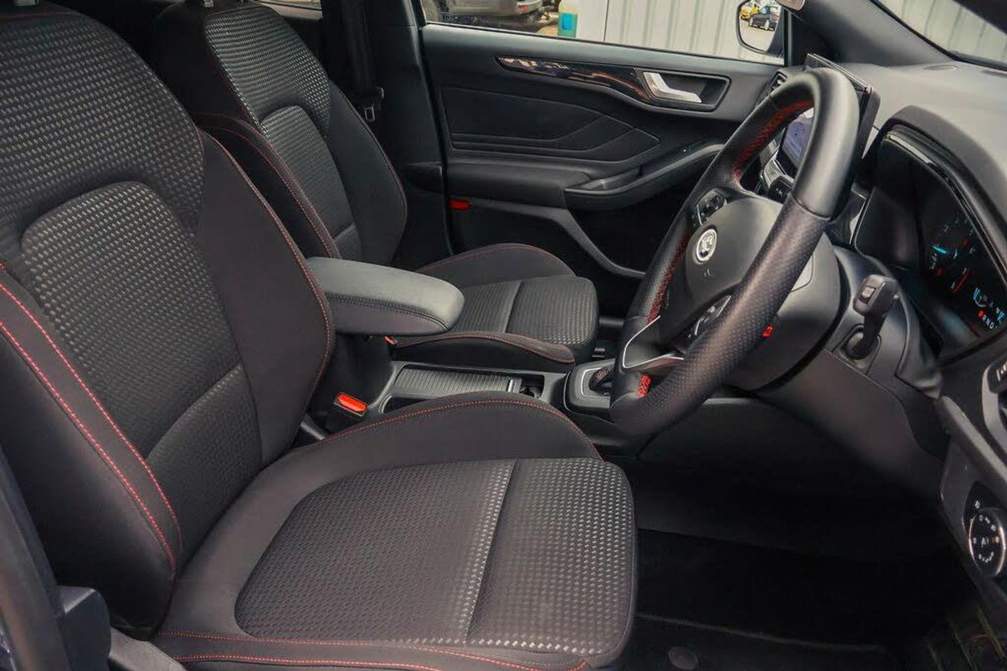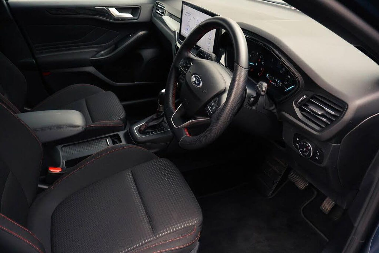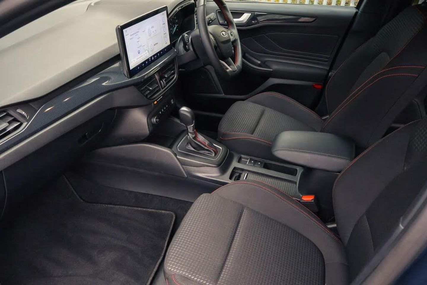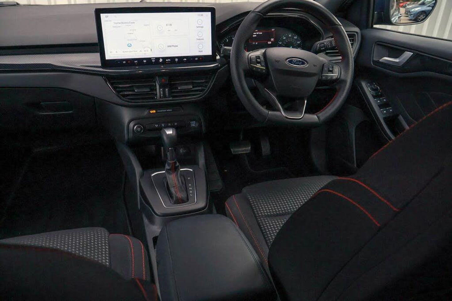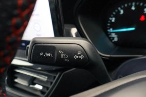 4.2" Colour TFT Ice blue illumination analogue cluster with trip computer, Bluetooth system, Digital clock, Easy fuel capless refuelling system, Eco mode, Ford SYNC 4 Navigation with 13.2'' touchscreen, DAB radio, Emergency Assistance, Apple Carplay Android Auto, 6 speakers FordPass Connect, Lane keeping system - lane keeping alert and lane keeping aid, PAS, Rev counter, Selectable drive mode, Service interval indicator, 2 USB ports, Auto headlamps (on/off), Body coloured door handles, Electrically operated front and rear windows with one touch opening and closing, Electrically operated heated power fold door mirrors with puddle lamp with side indicators, Front variable intermittent wipers with electric wash, Full fixed LED headlamps, Heated rear window, LED daytime running lamp, LED rear lamps, LED third brake light, Polished twin tailpipe, Privacy glass, Quickclear heated windscreen, Rain sensor, Rear side wing doors, Tailgate wash/wipe, Unique ST-Line grille, full bodystyling kit, and large body coloured rear roof spoiler, 3 rear headrests, 3 seat bench in 2nd row, Cloth upholstery, Dual zone electronic air temperature control, Height adjustable front headrests, Isofix child seat preparation, Manual 2-way passenger seat adjust, Manual 4-way driver seat adjust, with manual lumbar adjust, Reach + rake adjustable steering column, Single front passenger seat, Keyless entry and keyless start, MyKey system, Remote central locking engine immobiliser, Thatcham alarm with power door dead locks, Cloth - Black with Red Stitching