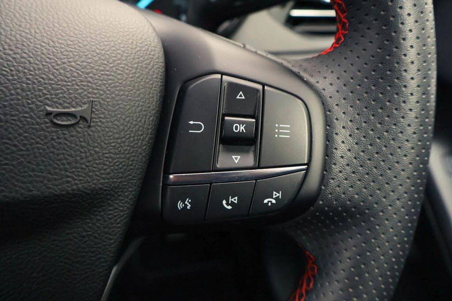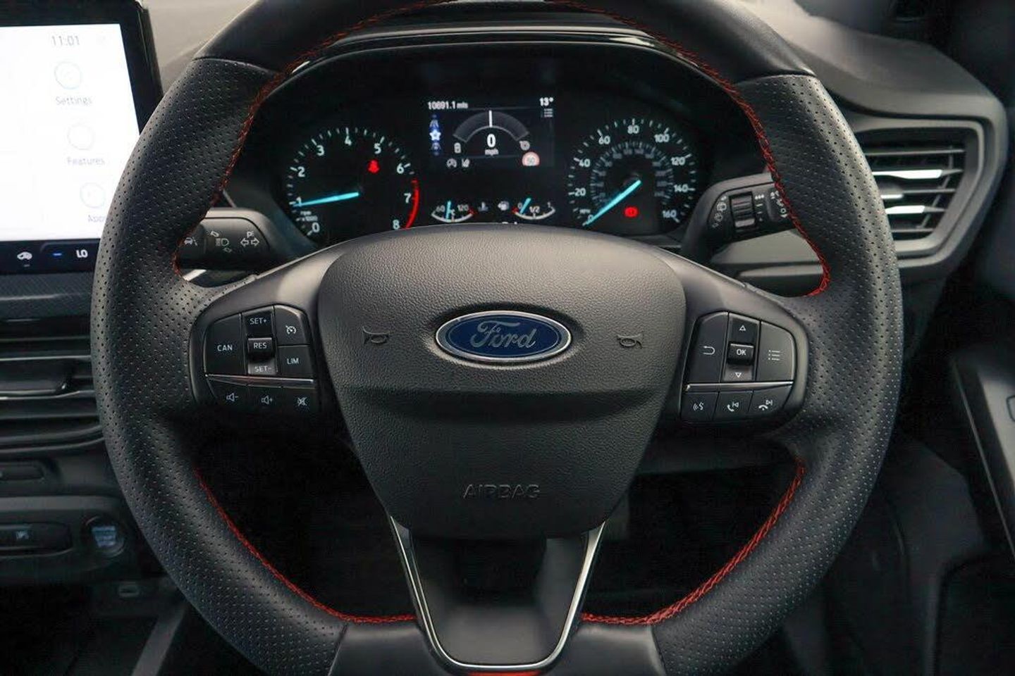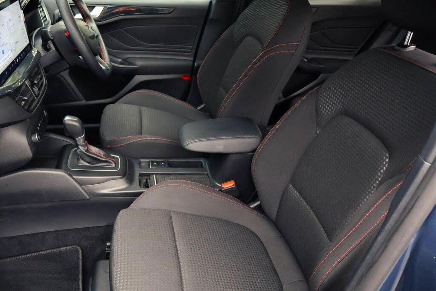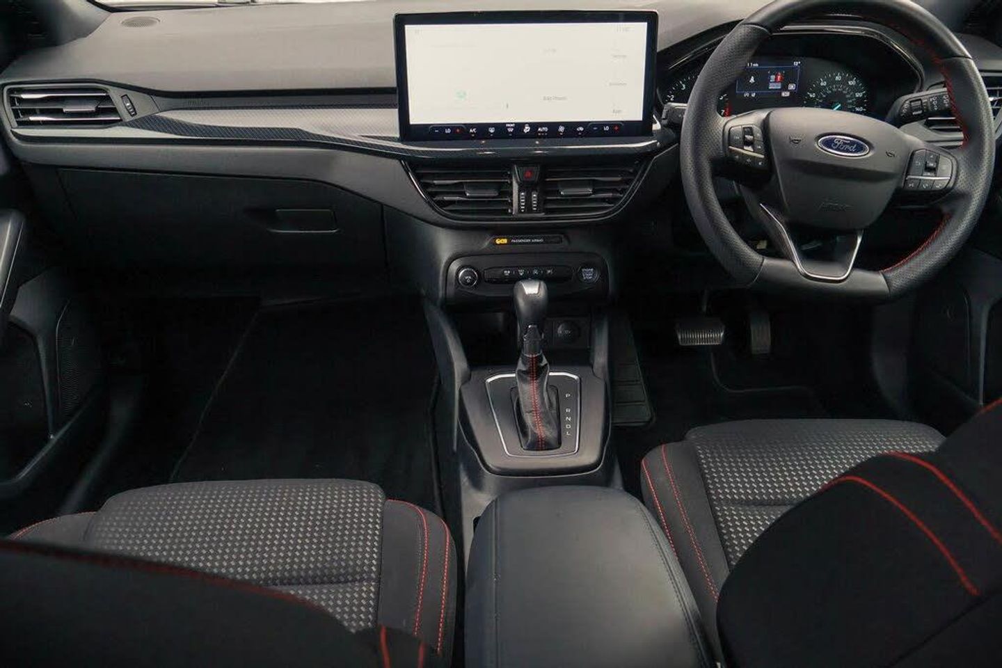 4.2" Colour TFT Ice blue illumination analogue cluster with trip computer, Bluetooth system, Digital clock, Easy fuel capless refuelling system, Eco mode, Ford SYNC 4 Navigation with 13.2'' touchscreen, DAB radio, Emergency Assistance, Apple Carplay Android Auto, 6 speakers FordPass Connect, Lane keeping system - lane keeping alert and lane keeping aid, PAS, Rev counter, Selectable drive mode, Service interval indicator, 2 USB ports, Auto headlamps (on/off), Body coloured door handles, Electrically operated front and rear windows with one touch opening and closing, Electrically operated heated power fold door mirrors with puddle lamp with side indicators, Front variable intermittent wipers with electric wash, Full fixed LED headlamps, Heated rear window, LED daytime running lamp, LED rear lamps, LED third brake light, Polished twin tailpipe, Privacy glass, Quickclear heated windscreen, Rain sensor, Rear side wing doors, Tailgate wash/wipe, Unique ST-Line grille, full bodystyling kit, and large body coloured rear roof spoiler, 3 rear headrests, 3 seat bench in 2nd row, Cloth upholstery, Dual zone electronic air temperature control, Height adjustable front headrests, Isofix child seat preparation, Manual 2-way passenger seat adjust, Manual 4-way driver seat adjust, with manual lumbar adjust, Reach + rake adjustable steering column, Single front passenger seat, Keyless entry and keyless start, MyKey system, Remote central locking engine immobiliser, Thatcham alarm with power door dead locks, Cloth - Black with Red Stitching