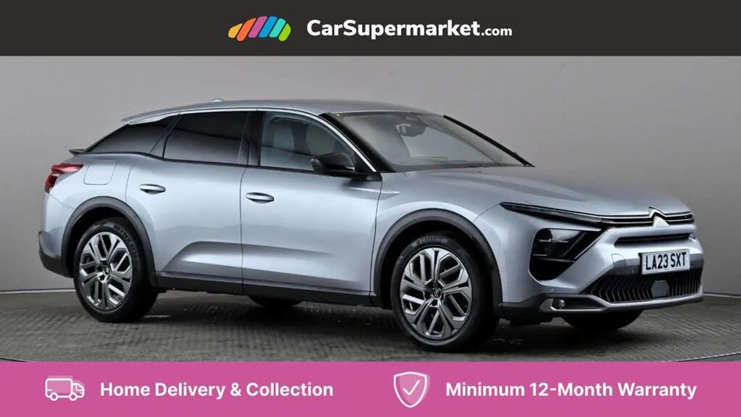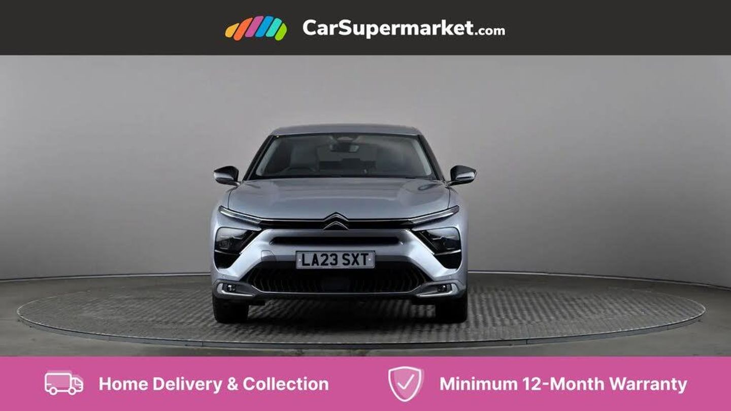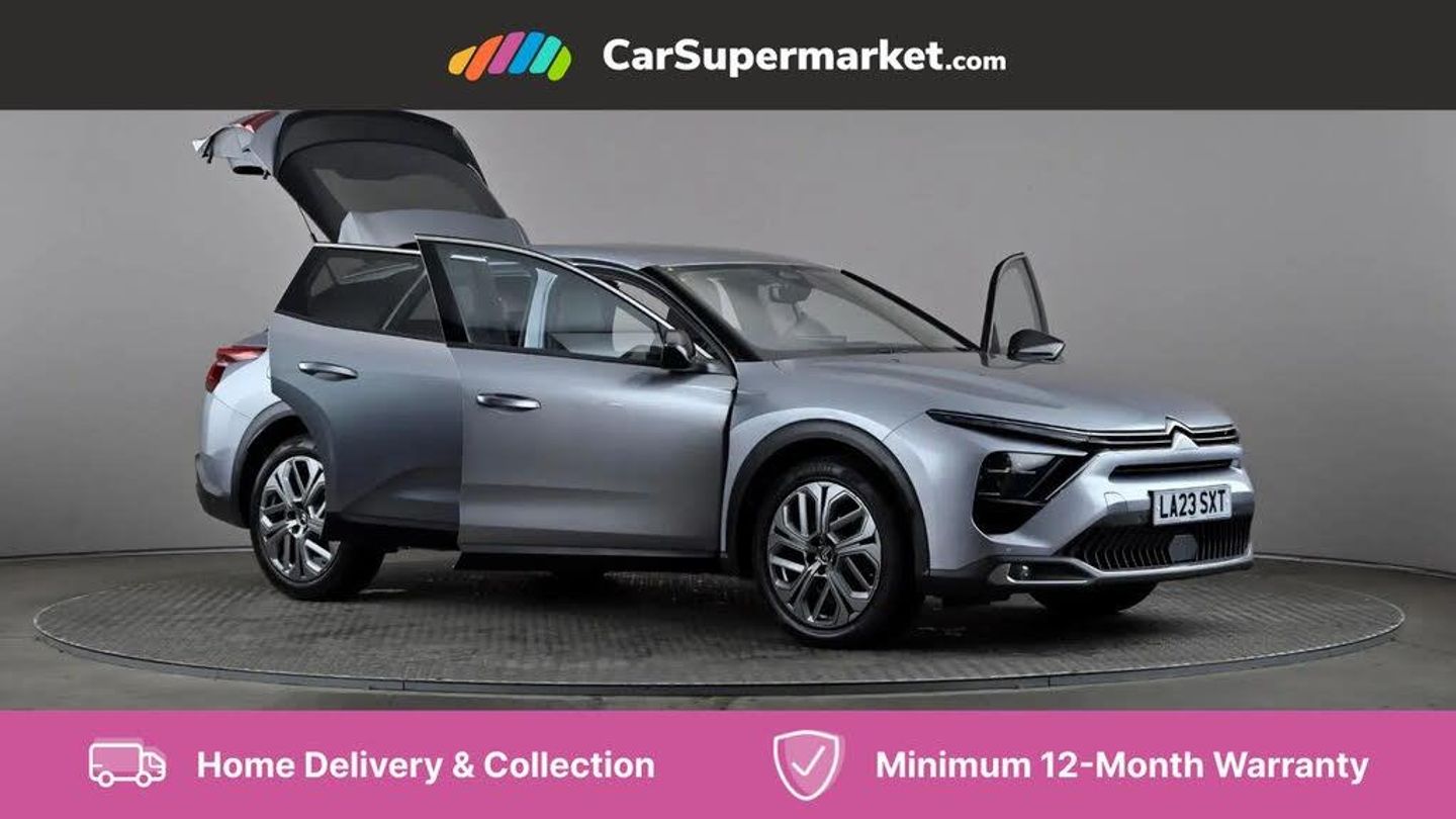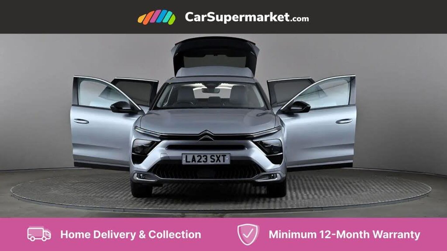 12" Central touch screen with separate heating and ventilation controls (with ADAS and Home buttons),7'' Digital instrument cluster with smoked glass, 10 + 2 indicator lights and ambiance backlighting,Citroen connect box with emergency and assistance system,Coffee Break Alert,Connected 3D navigation,Driver attention alert system,Driver information panel with lighting fault indicator,E-call,Electric variable power assisted steering,Extended blind spot detection,Extended traffic sign recognition,Forward collision warning,Front and rear parking sensors,Highway Integrated Assist (Adaptive Cruise Control with Stop & Go function and Lane Positioning Assist),In-crash braking,Lane change assistant,Lane keep assist,Multi window screen,MyCitroën Drive Plus (incorporating electronic user guide),Outside temperature display,Radar Controlled Active Safety Brake (with enhanced pedestrian and cyclist pickup and able to function at night),Rear cross traffic alert,Remote functions: horn and lighting, lock/unlock doors, vehicle status,Speed limit recognition and recommendation,Top rear vision reversing camera,Voice recognition,Wireless mirror screen,Wireless smartphone charging,Citroen Advanced Comfort suspension with double (front & rear) progressive hydraulic cushions,2 front USB plugs : 1 USB type C charge + data (front of centre console), 1 USB type C charge only (under centre front armrest), able to charge IPAD,2 rear USB plugs charging only (able to charge IPAD),Bluetooth streaming,DAB Digital radio,Hi Fi System: 8 loudspeakers (2 front woofers, 2 front tweeters, 2 rear woofers and 2 rear tweeters),A pillar in black,Acoustic insulated and tinted windscreen with Head Up Display (eHUD),Automatic illumination of headlamps when unlocking,Automatic rain-sensitive flat blade wipers with integrated wash function,Automatic welcome and follow me home lighting,Automatically illuminating LED headlamps with automatic High Beam Assist (with driver adjustment controls in passenger compartment),Body coloured door handles,Chrome Citroën chevrons integrated into front grille and extending outward into front light signature,Electronic, heated, black folding door mirrors with integrated LED indicator, LED approach lighting,Extra tinted rear quarter panel windows,Extra tinted, heated rear window,Frameless electrochrome interior rear view mirror,Front and rear electric windows,Gloss black Citroën chevrons with chrome surround, chrome Citroën lettering and C5 X badging on rear tailgate,High level LED brake light,LED daytime running lights,LED fog lights with static cornering function integrated into front bumper apron,LED front indicators,LED rear lights,LED rear number plate lights,Rear side wing doors,Rear wiper,Remote 4-window opening/closing with plip,Satin chrome trim on rear bumper,Tinted front and extra tinted rear windows,12V power socket in front centre console,12V socket in boot,3 rear headrests,3 seat bench in 2nd row,Automatic dual zone air-conditioning with Soft/Normal/Fast variable settings, A/C max function and single- zone function (through touch screen),Black leather-effect central armrest with overstitching,Black leather-effect front and rear door panel inserts,Black tie down rings for secure load storage,Cabin air filter,Carpeted boot with low-friction loading floor rails,Courtesy lighting: front roof light, rear roof light, central console lighting, LED illuminated glovebox and LED boot light,Dashboard mounted black, backlit, chrome-ringed start/stop button,Driver and front passenger sun visors with mirrors and LED lighting,Driver's footrest,e-Toggle automatic gear selector switch on centre-console,Front and rear door pockets,Front and rear passenger storage areas in central console,Front headrests,Front seatback storage pockets,Height and reach adjustable steering wheel,High efficiency air filter,Illuminated passenger glovebox,Interior LED welcome lighting - door handles, front foot wells, driver instrument panel,ISOFIX points in outer rear seats with top tether anchorage points,Magic Handles - allows rear seats to be folded flat from the boot compartment,Mistral carpet with reinforced driver's foot well,Multifunction heated, grained leather steering wheel with paddle shifters, driving assistance and infotainment control functions,Plastic boot sill,Rear air vents with independent opening/closing and left and right airflow settings for rear seat passengers,Rear armrest storage and cup holders,Roll up awning fitted to tailgate,Satin chrome dashboard strip and satin chrome decor on bottom of door panels,Satin chrome highlighted air vents and steering wheel,Single front passenger seat,Smartphone storage in front of (front) centre armrest,Storage area for emergency safety triangle/first-aid kit,Storage under central armrest,2 tone horn,ABS,Curtain airbags,Driver and front passenger airbags,Electric parking brake,Electronic Stability Programme (ESP)