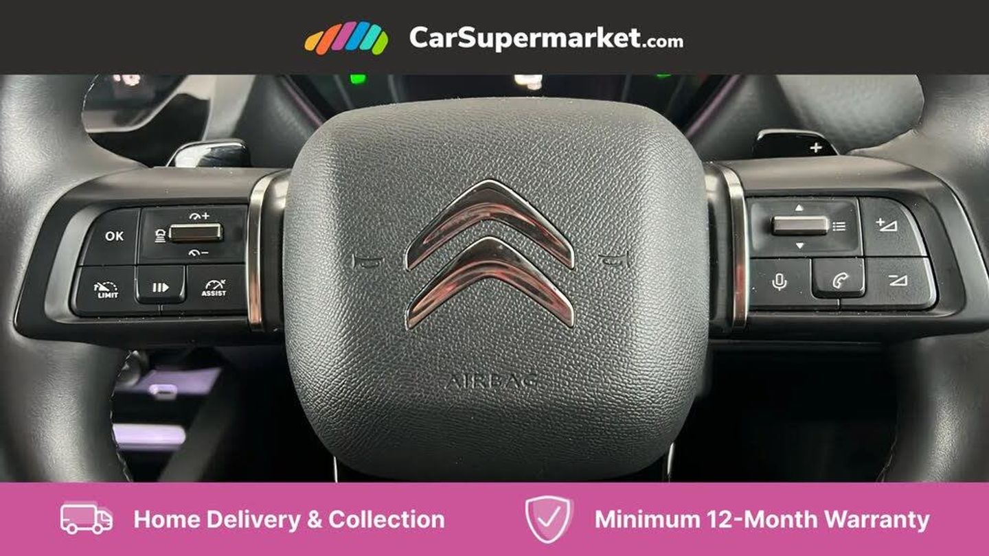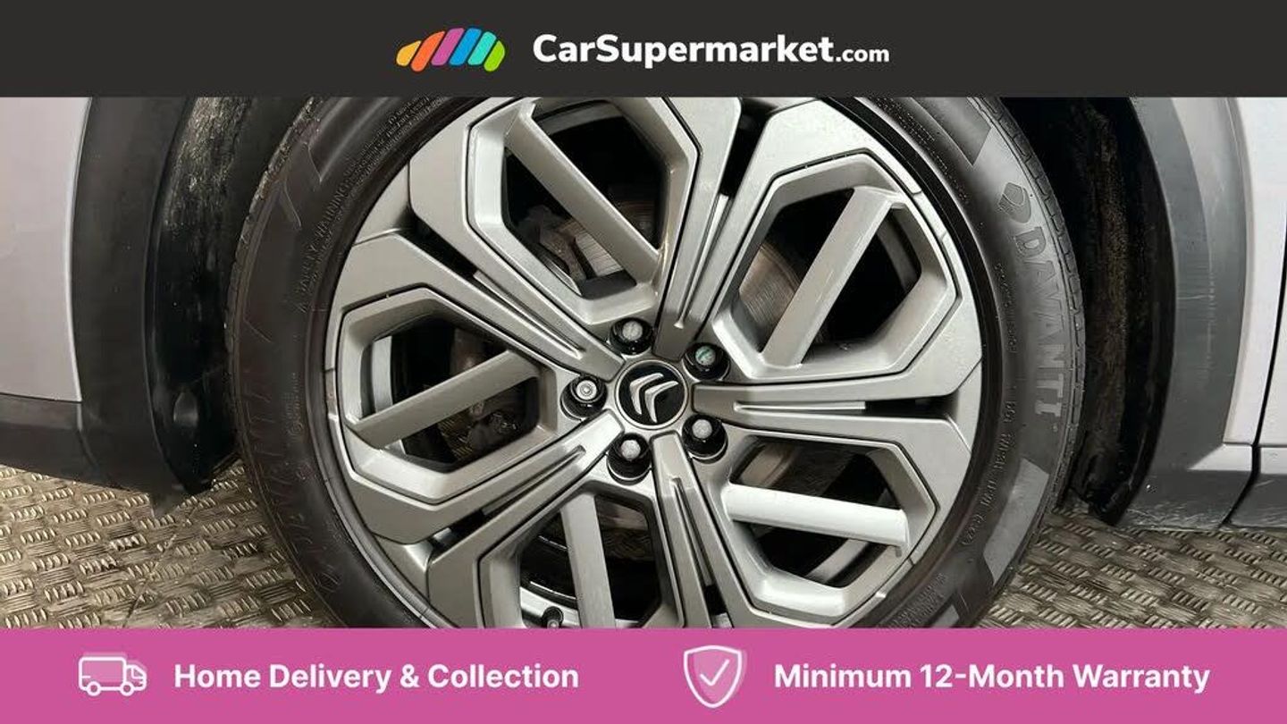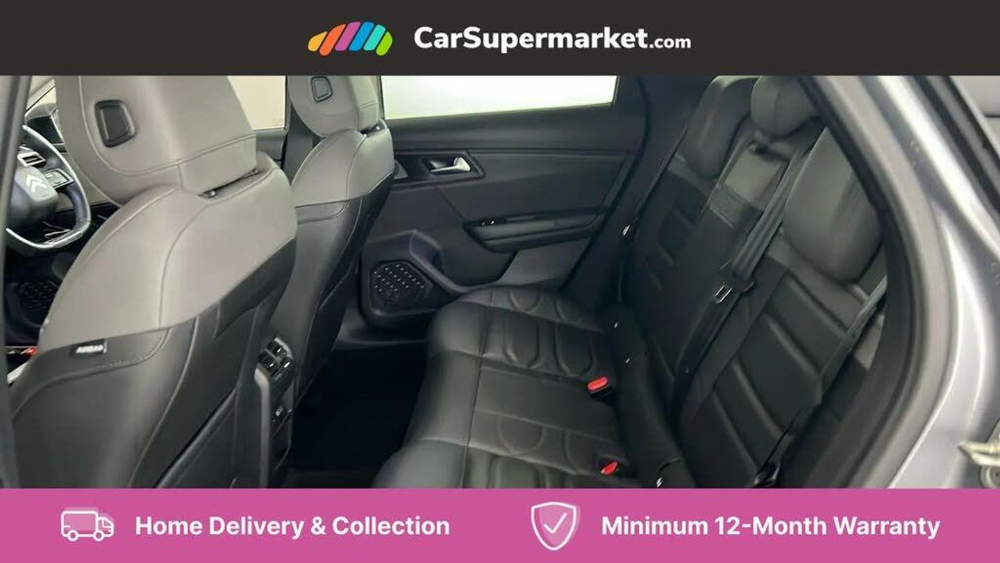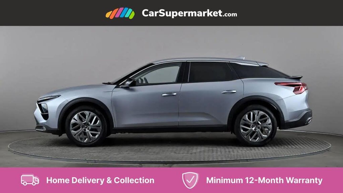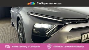 12" Central touch screen with separate heating and ventilation controls (with ADAS and Home buttons),7'' Digital instrument cluster with smoked glass, 10 + 2 indicator lights and ambiance backlighting,Citroen connect box with emergency and assistance system,Coffee Break Alert,Connected 3D navigation,Driver attention alert system,Driver information panel with lighting fault indicator,E-call,Electric variable power assisted steering,Extended blind spot detection,Extended traffic sign recognition,Forward collision warning,Front and rear parking sensors,Highway Integrated Assist (Adaptive Cruise Control with Stop & Go function and Lane Positioning Assist),In-crash braking,Lane change assistant,Lane keep assist,Multi window screen,MyCitroën Drive Plus (incorporating electronic user guide),Outside temperature display,Radar Controlled Active Safety Brake (with enhanced pedestrian and cyclist pickup and able to function at night),Rear cross traffic alert,Remote functions: horn and lighting, lock/unlock doors, vehicle status,Speed limit recognition and recommendation,Top rear vision reversing camera,Voice recognition,Wireless mirror screen,Wireless smartphone charging,Citroen Advanced Comfort suspension with double (front & rear) progressive hydraulic cushions,2 front USB plugs : 1 USB type C charge + data (front of centre console), 1 USB type C charge only (under centre front armrest), able to charge IPAD,2 rear USB plugs charging only (able to charge IPAD),Bluetooth streaming,DAB Digital radio,Hi Fi System: 8 loudspeakers (2 front woofers, 2 front tweeters, 2 rear woofers and 2 rear tweeters),A pillar in black,Acoustic insulated and tinted windscreen with Head Up Display (eHUD),Automatic illumination of headlamps when unlocking,Automatic rain-sensitive flat blade wipers with integrated wash function,Automatic welcome and follow me home lighting,Automatically illuminating LED headlamps with automatic High Beam Assist (with driver adjustment controls in passenger compartment),Body coloured door handles,Chrome Citroën chevrons integrated into front grille and extending outward into front light signature,Electronic, heated, black folding door mirrors with integrated LED indicator, LED approach lighting,Extra tinted rear quarter panel windows,Extra tinted, heated rear window,Frameless electrochrome interior rear view mirror,Front and rear electric windows,Gloss black Citroën chevrons with chrome surround, chrome Citroën lettering and C5 X badging on rear tailgate,High level LED brake light,LED daytime running lights,LED fog lights with static cornering function integrated into front bumper apron,LED front indicators,LED rear lights,LED rear number plate lights,Rear side wing doors,Rear wiper,Remote 4-window opening/closing with plip,Satin chrome trim on rear bumper,Tinted front and extra tinted rear windows,12V power socket in front centre console,12V socket in boot,3 rear headrests,3 seat bench in 2nd row,Automatic dual zone air-conditioning with Soft/Normal/Fast variable settings, A/C max function and single- zone function (through touch screen),Black leather-effect central armrest with overstitching,Black leather-effect front and rear door panel inserts,Black tie down rings for secure load storage,Cabin air filter,Carpeted boot with low-friction loading floor rails,Courtesy lighting: front roof light, rear roof light, central console lighting, LED illuminated glovebox and LED boot light,Dashboard mounted black, backlit, chrome-ringed start/stop button,Driver and front passenger sun visors with mirrors and LED lighting,Driver's footrest,e-Toggle automatic gear selector switch on centre-console,Front and rear door pockets,Front and rear passenger storage areas in central console,Front headrests,Front seatback storage pockets,Height and reach adjustable steering wheel,High efficiency air filter,Illuminated passenger glovebox,Interior LED welcome lighting - door handles, front foot wells, driver instrument panel,ISOFIX points in outer rear seats with top tether anchorage points,Magic Handles - allows rear seats to be folded flat from the boot compartment,Mistral carpet with reinforced driver's foot well,Multifunction heated, grained leather steering wheel with paddle shifters, driving assistance and infotainment control functions,Plastic boot sill,Rear air vents with independent opening/closing and left and right airflow settings for rear seat passengers,Rear armrest storage and cup holders,Roll up awning fitted to tailgate,Satin chrome dashboard strip and satin chrome decor on bottom of door panels,Satin chrome highlighted air vents and steering wheel,Single front passenger seat,Smartphone storage in front of (front) centre armrest,Storage area for emergency safety triangle/first-aid kit,Storage under central armrest,2 tone horn,ABS,Curtain airbags,Driver and front passenger airbags,Electric parking brake,Electronic Stability Programme (ESP)