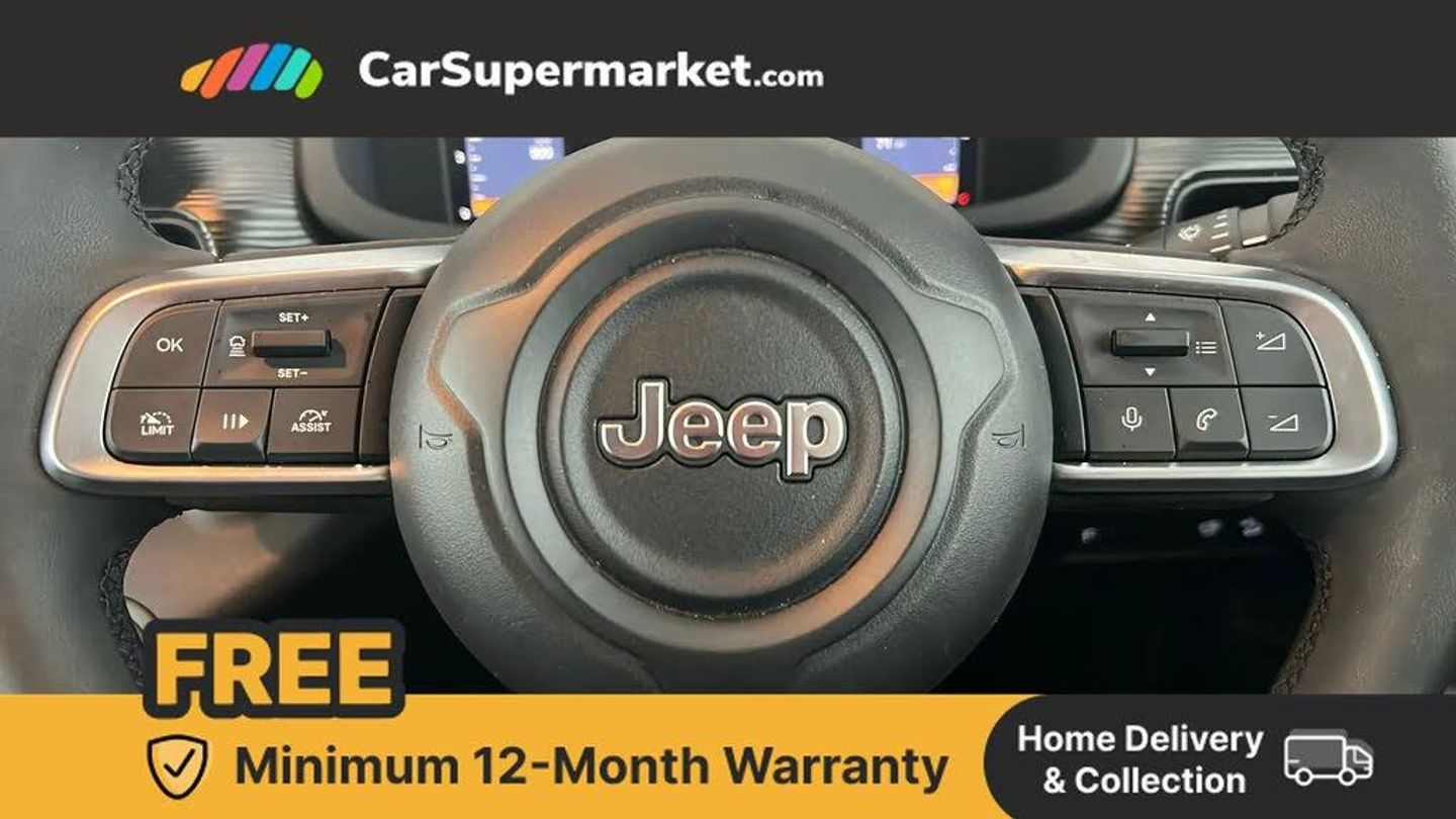 (AEB) Autonomous Emergency Braking with pedestrian and cyclist recognition,10.25" Full TFT reconfigurable colour cluster,180 Degree rear camera with drone view,Adaptive cruise control,All-Terrain Mode Selector,Apple Carplay/Android Auto with wireless mirroring,BSRF connectivity box,Connectivity services,Drowsy driver detection system,eCall emergency call system,Keyless Start/Engine On Button,Lane keep assist,Odometer,PAS,Quick Guide English,Rear parking sensors,Rear view camera with dynamic grid lines,Telematic box and connected services,Traffic sign recognition,Warranty Booklet - UK,Battery default,High efficiency alternator,Rear USB port with type-C charging,3rd brake light,All power windows express Up/Down,Auto dimming interior rear view mirror,Automatic headlights,Automatic high/low beam,Body colour exterior door handles,Day time running light,Gloss black mirror caps,Halogen rear lights,Heated and electrically folding outside mirrors,Heated electric door mirrors,LED Fog lamps with cornering function,LED reflector headlamps,Rain sensor,Rear side wing doors,Rear wiper,Silver skid plates,Wiring preperation for towing group by Mopar,3 rear headrests,3 seat bench in 2nd row,Automatic A/C (1 Zone),Central console dividers x2,Driver and front passenger sunvisor with vanity mirror,Foldable second row seats 40/60 - Fix and Fold,Front central armrest with storage,Front head restraints,Front passenger grab handle,Front passenger isofix child seat attachment,Front seat backrest pocket,Height adjustable cargo floor,I am Jeep label,Single front passenger seat,Synthetic leather steering wheel,Anti-lock braking system (ABS),Child locks on rear doors,Electric parking brake,ESC - Electronic Stability Control + traction control,Hill descent control,Kit fix and go predisposition/housing only,Rear seat ISOFIX,Three 3 point rear seatbelts,Volumetric anti theft alarm,Fix and go tyre repair kit,Snow