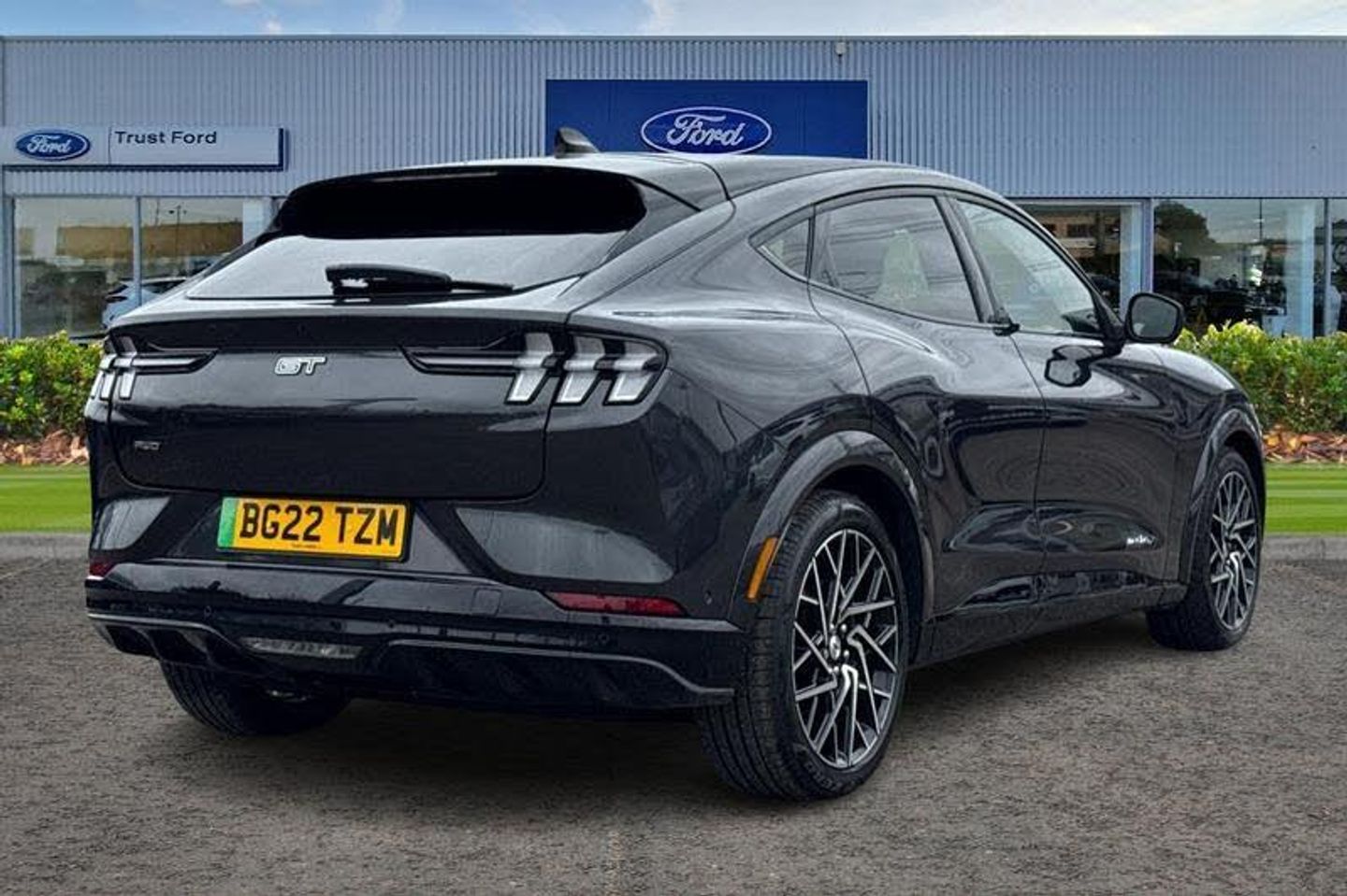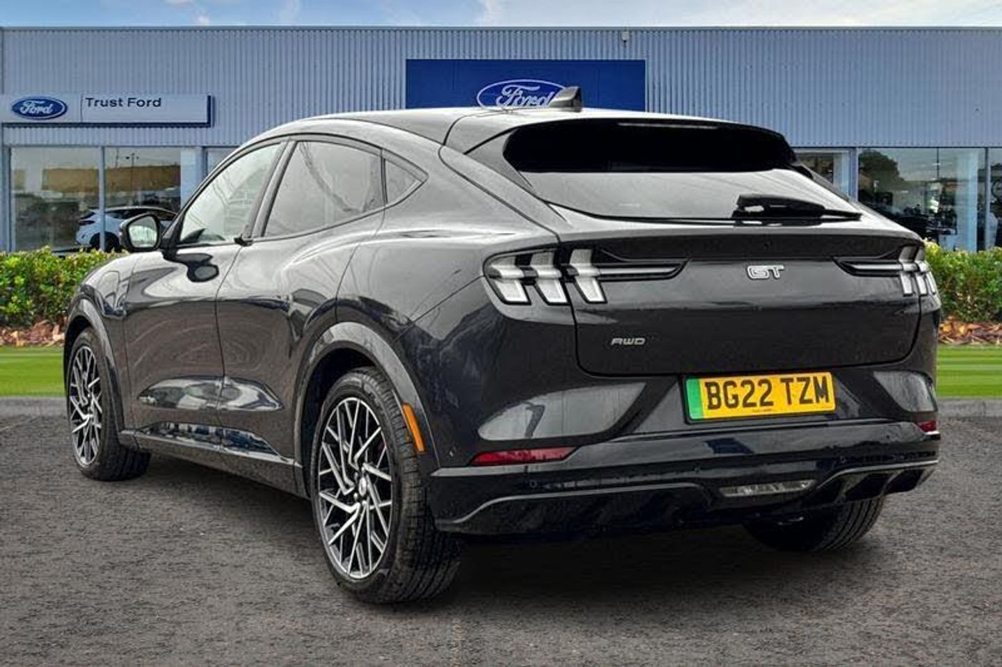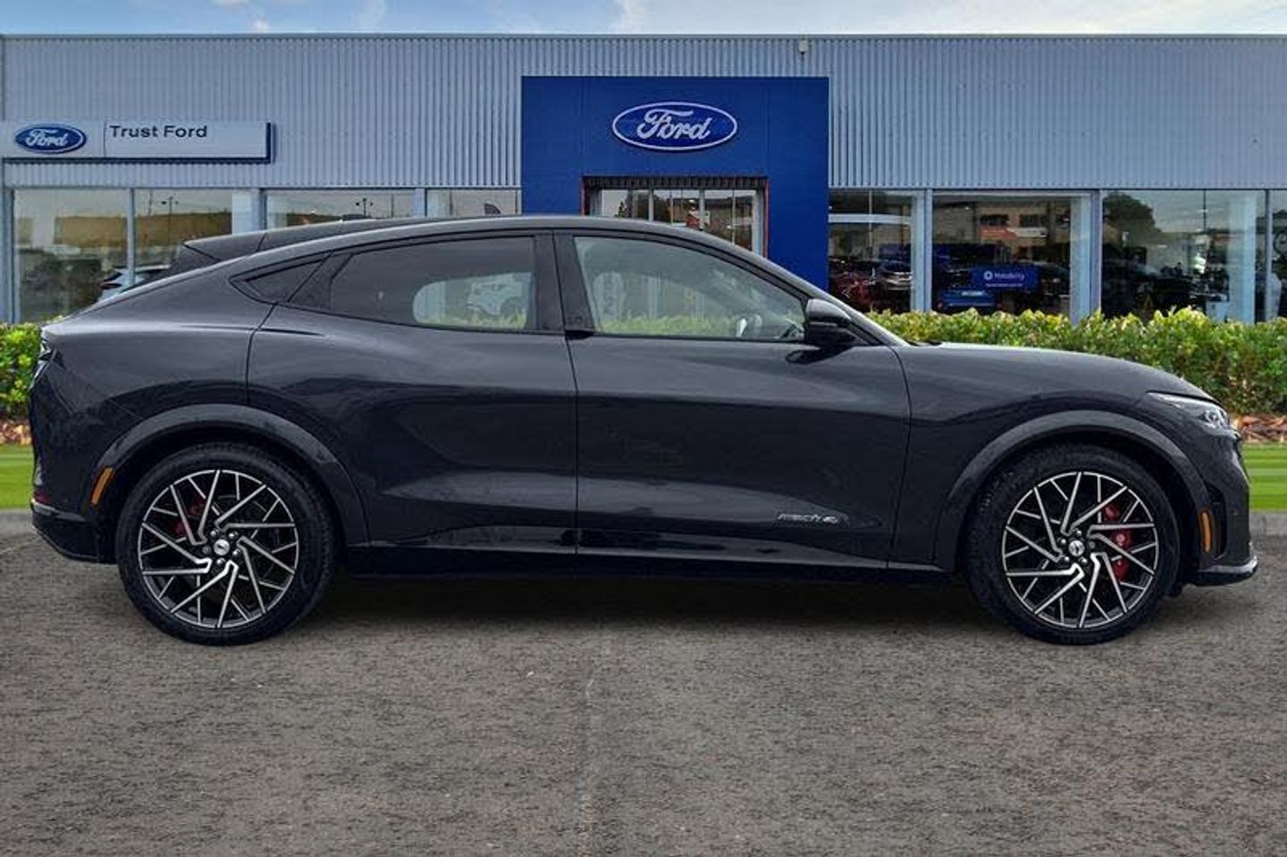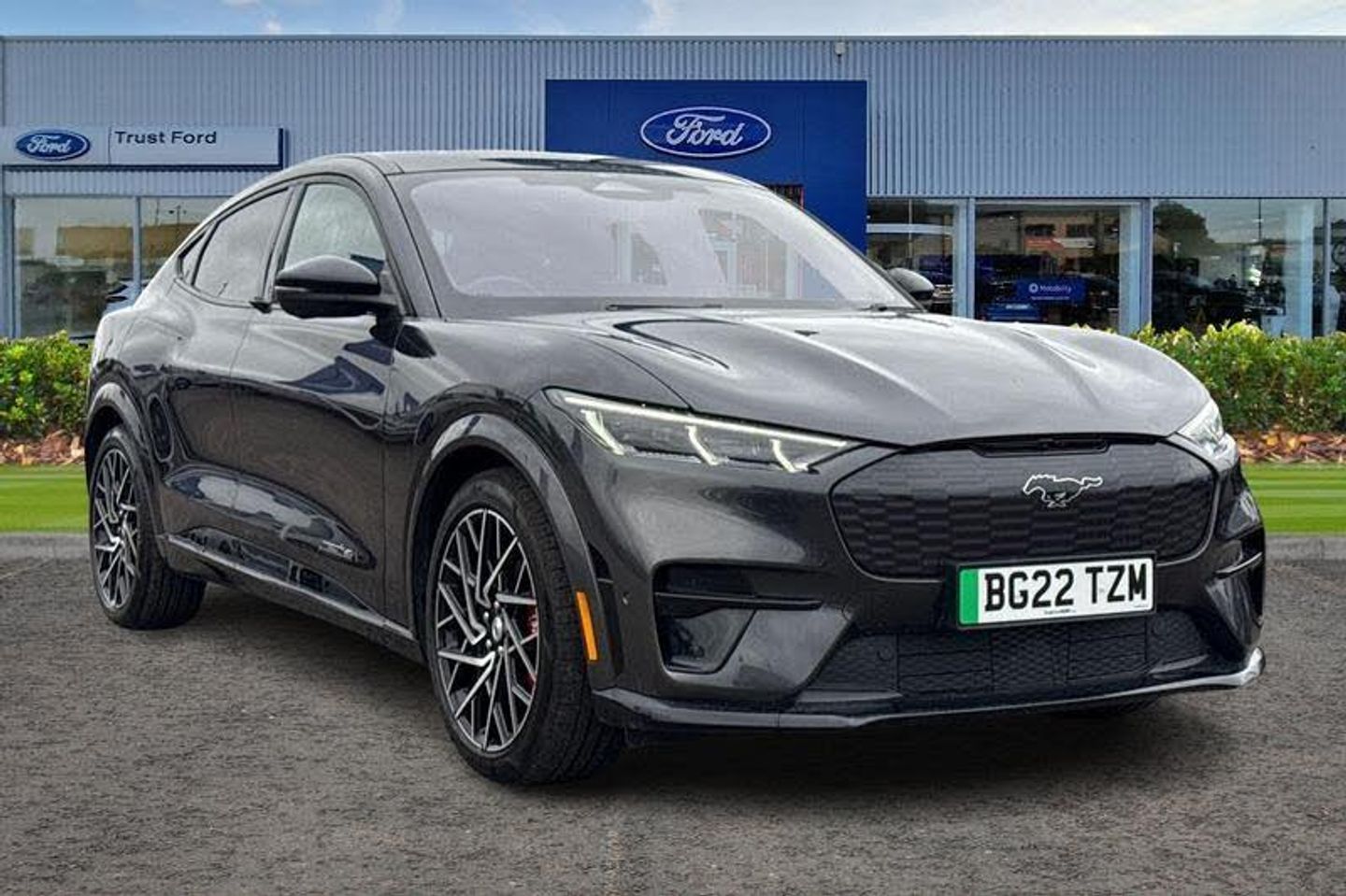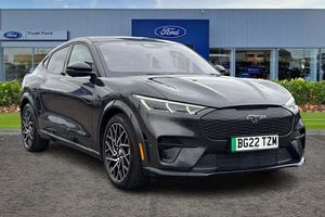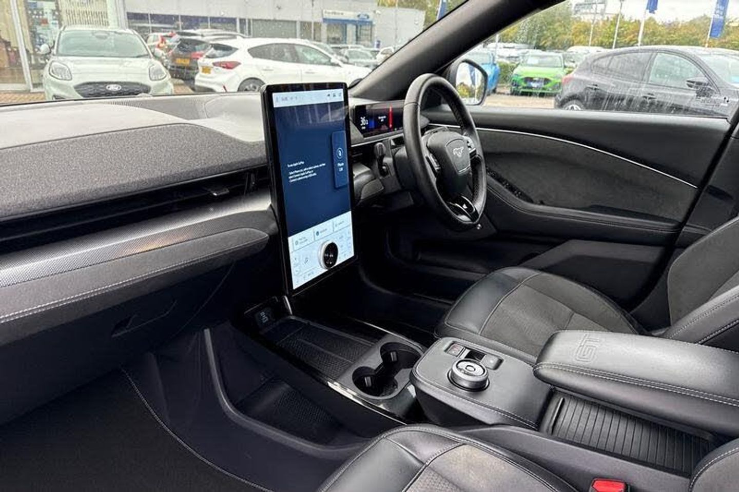 BLIS Blind Spot Information System, Adaptive Cruise Control, Panoramic Glass Roof , Heated Seats, Heated Steering Wheel, 360 Camera, Power Tailgate, Charging Mat, Bang Olufsen Sound System , Satellite Navigation System, Electric Memory Seats, Keyless Entry, Front + Rear Parking Sensors, Push Button Start, Privacy Glass, Part Leather Seats , Dual Zone Climate Control, Cruise Control + Speed Limiter, Lane departure warning with lane keeping aid, 10.2 full digital cluster and 15.5 central touch screen, Applink remote control system, Distance alert system, Electric power steering, Ford pass connect embedded modem, Selectable drive modes - active, whisper and untamed, Trip computer, Adaptive LED Mustang signature headllamps, Black door cladding, Black power folding door mirrors with Mustang logo projection puddle lamps, Blade front grille design, Body colour bumpers, Body coloured wheel mouldings, Exclusive paint, LED signature tail lights, Quickclear heated windscreen, Side cladding and wheel arches in piano black, Unique GT bumpers, Unique GT front grille design, Front headrests, Front trunk, GT performance seats, One pedal drive, Rear head restraints, 19 brembo brakes, 3 point rear seatbelts, ABS, ESP, Evasive steering assist, Pre collision assist with Forward Collision Warning (FCW), Dynamic Brake Support (DBS), Autonomous Emergency Braking (AEB), Red brake callipers